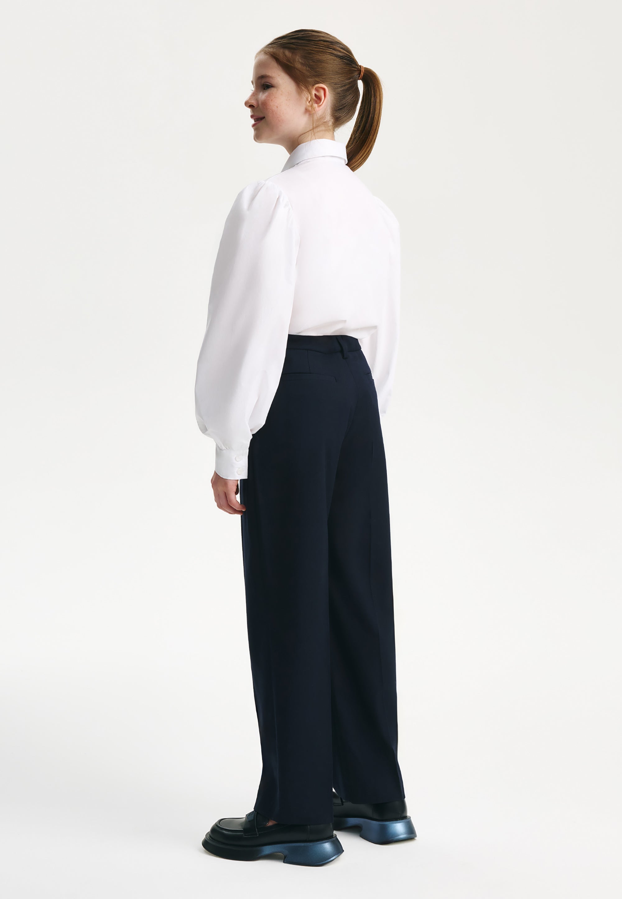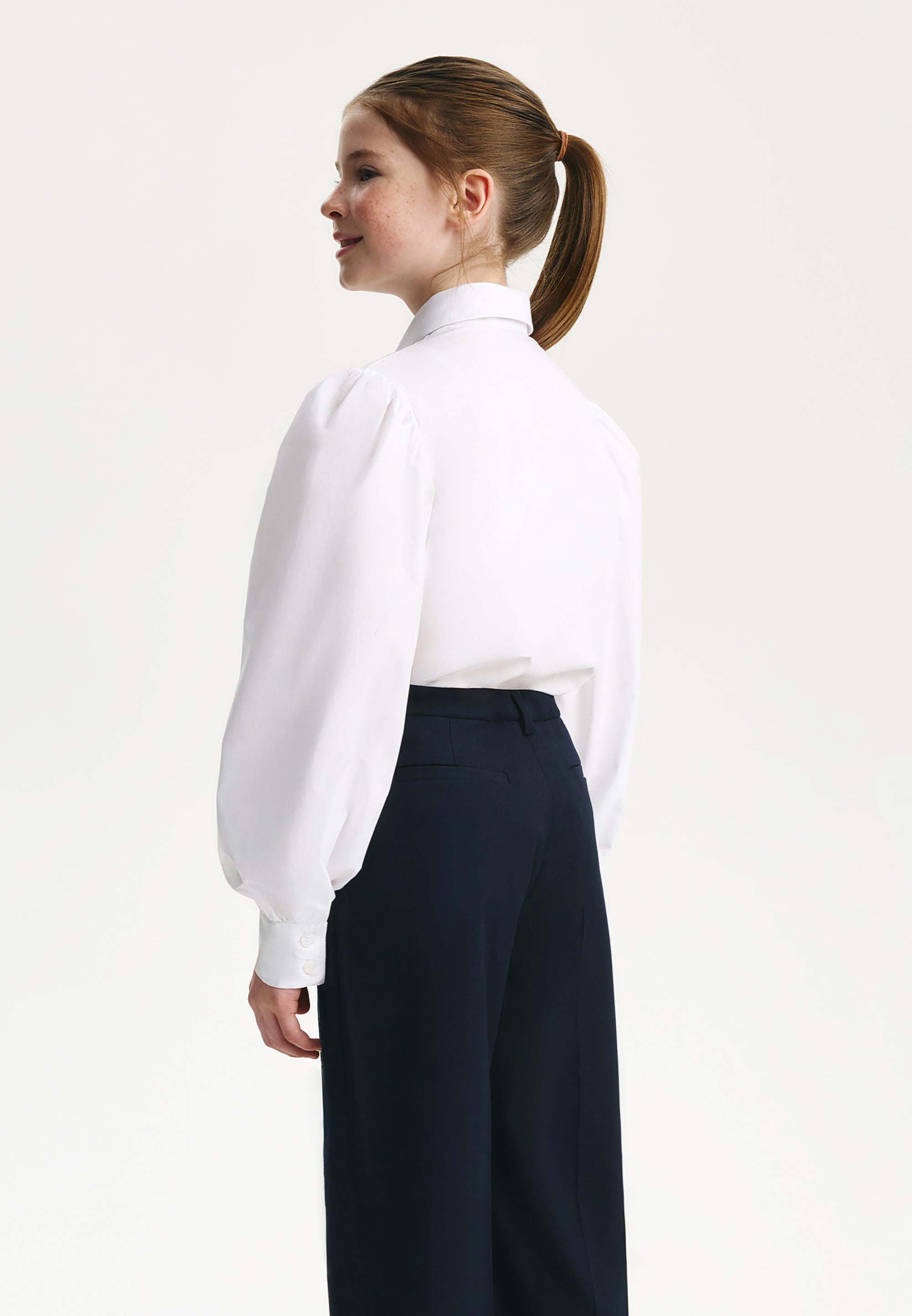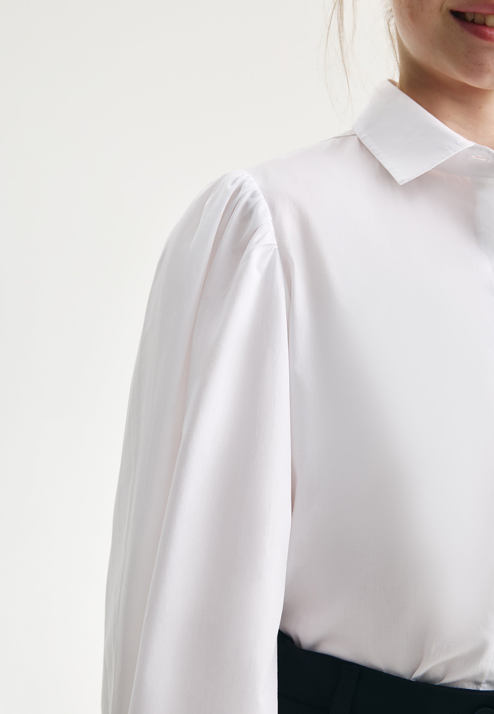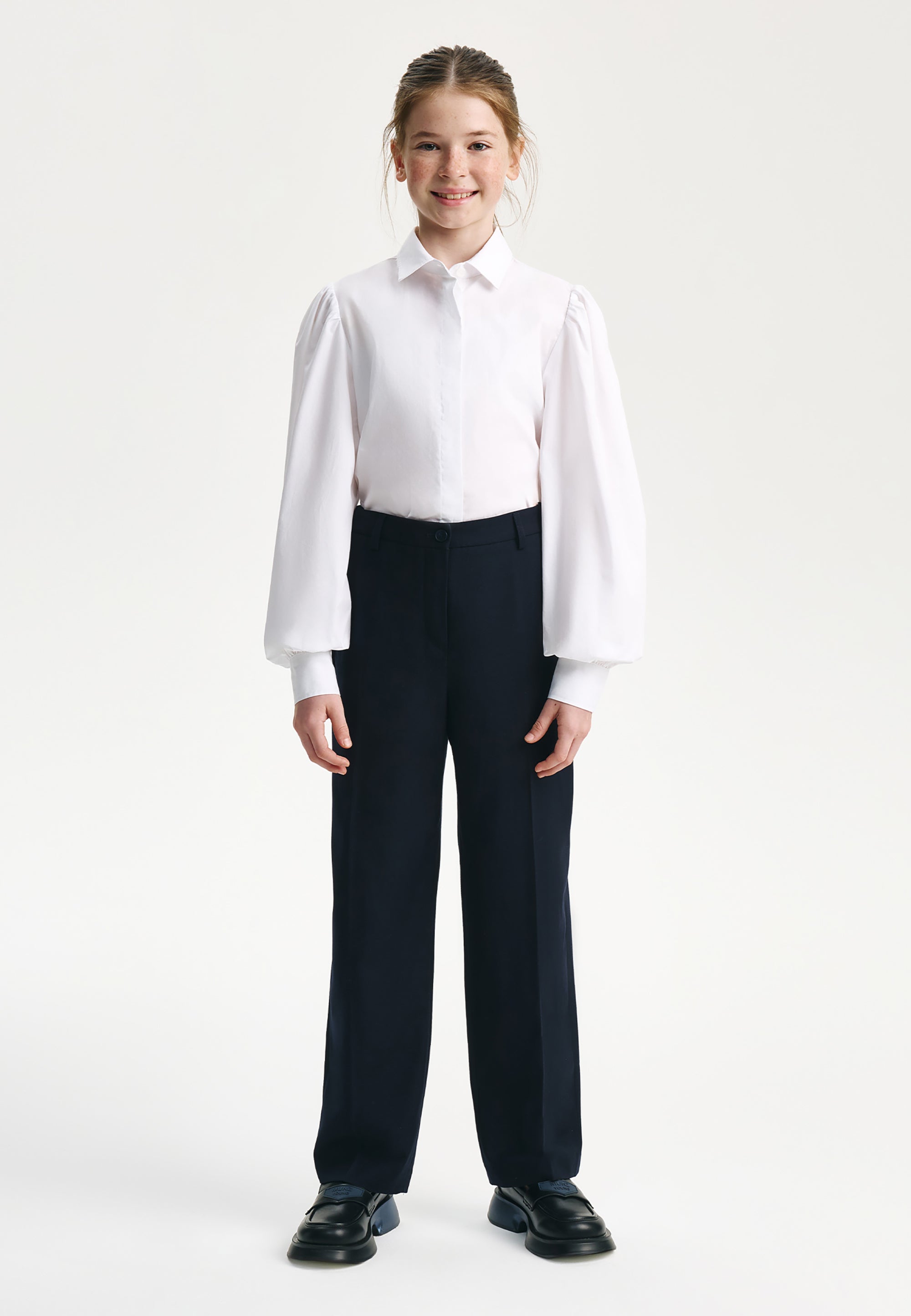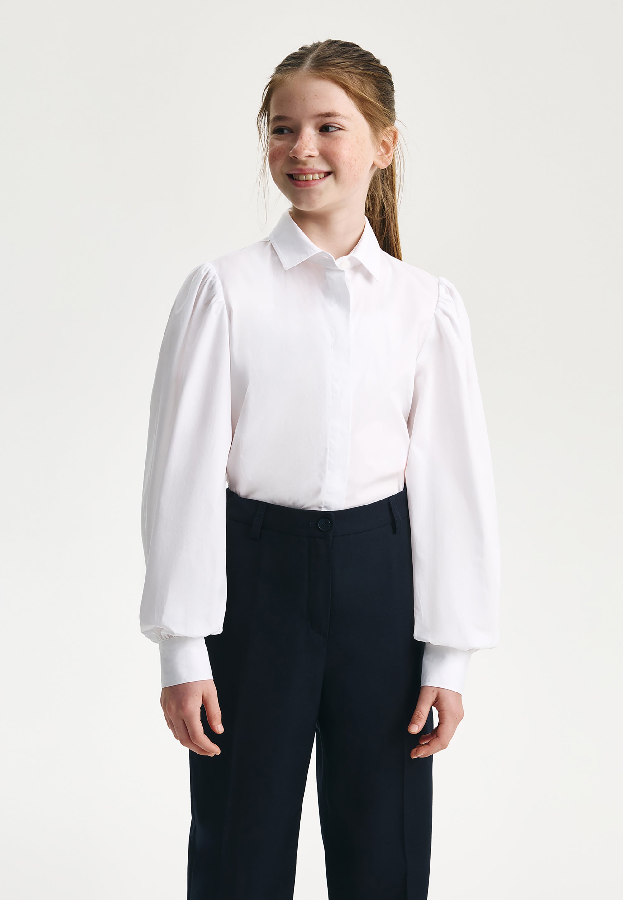 Бялата блуза с дълъг ръкав е важна съставна част от стилните училищни визии на момичето. Изработена е от лек памучен текстил, комфортен за експлоатация и поддръжка. Класическата права кройка и скритото закопчаване придават на модела строг и лаконичен вид. Обемните набрани ръкави на блузата служат за неин основен акцент, позволявайки тя да бъде интегрирана както в ежедневни училищни комплекти, така и във визии за всякакви тържествени събития.