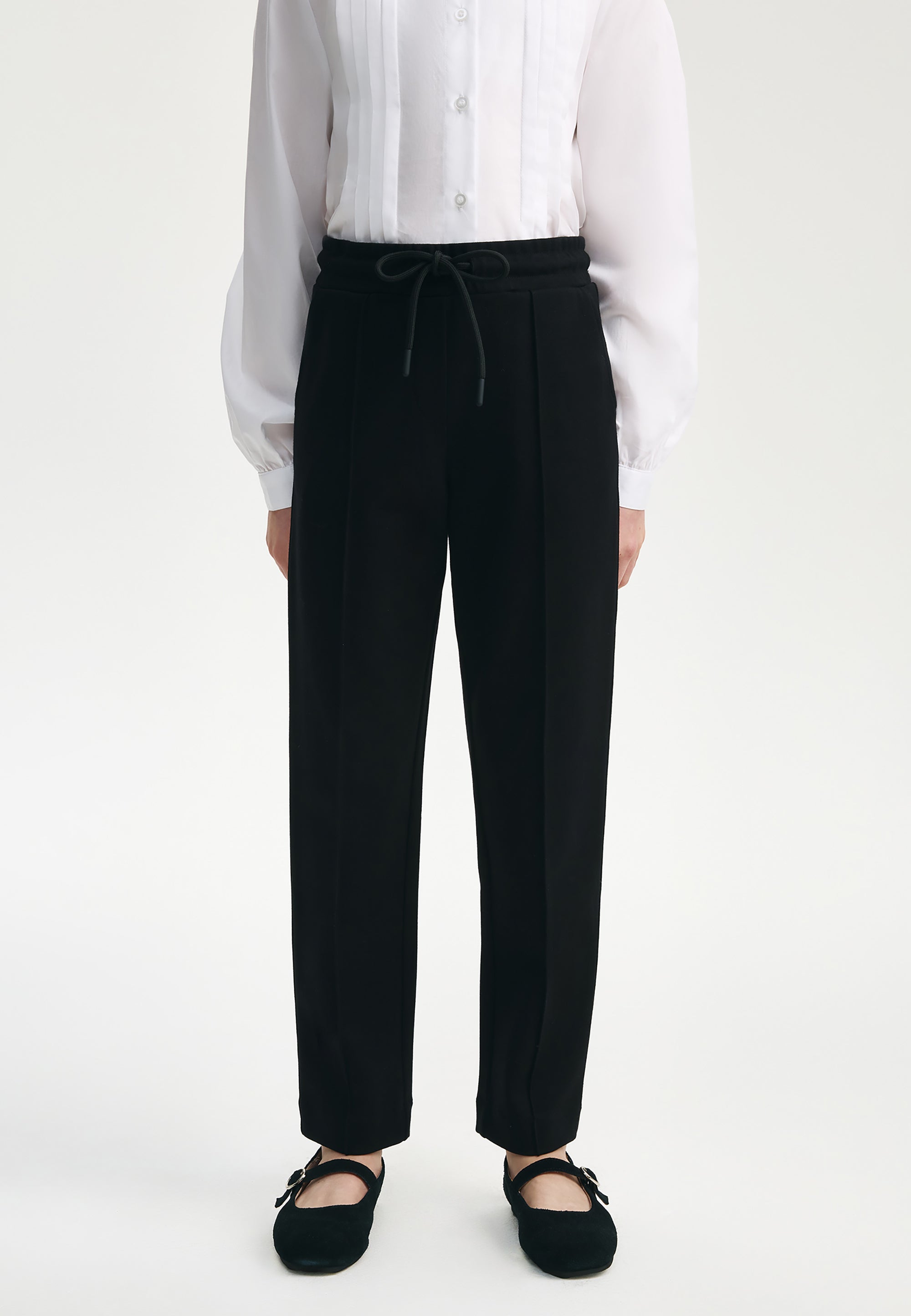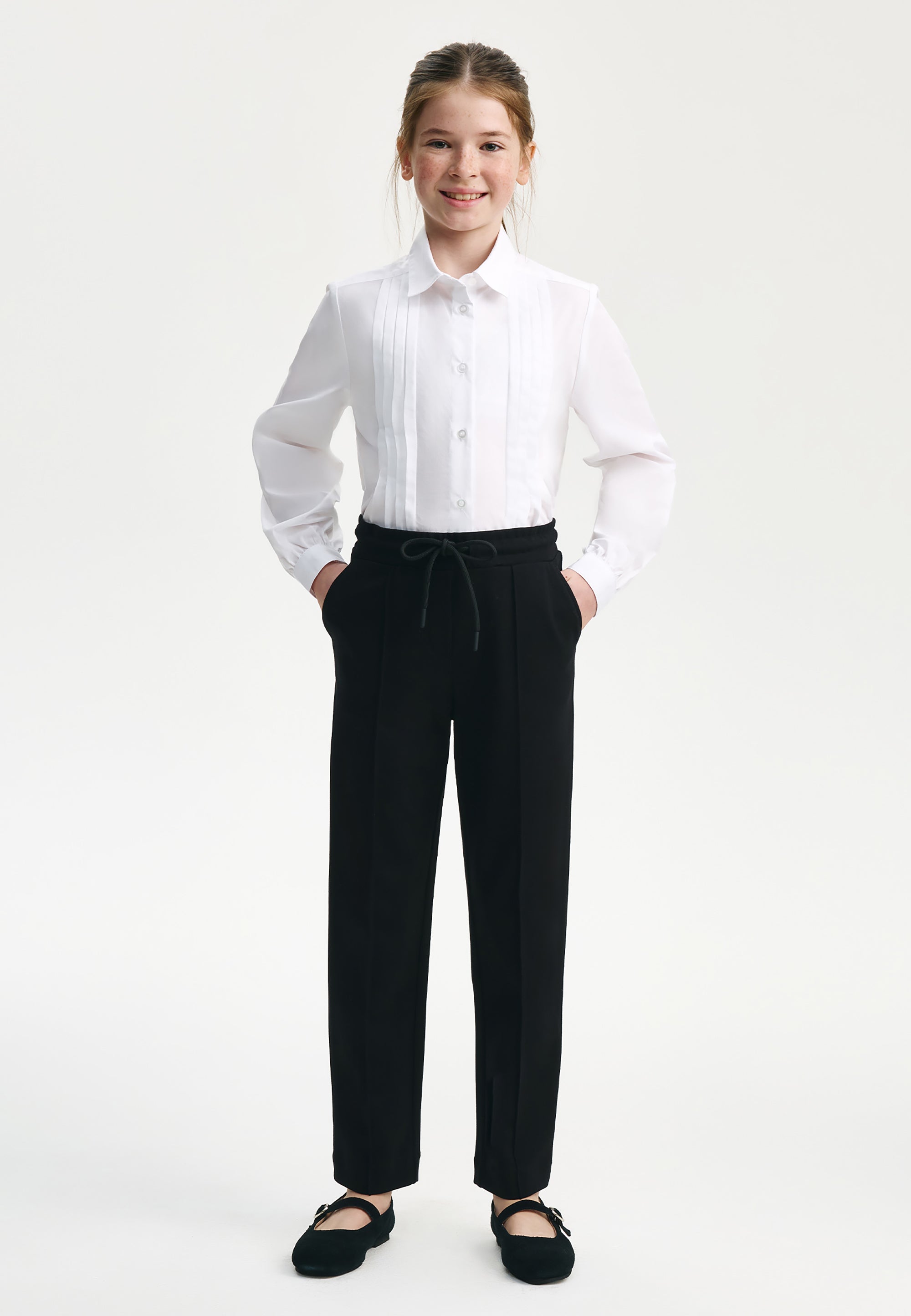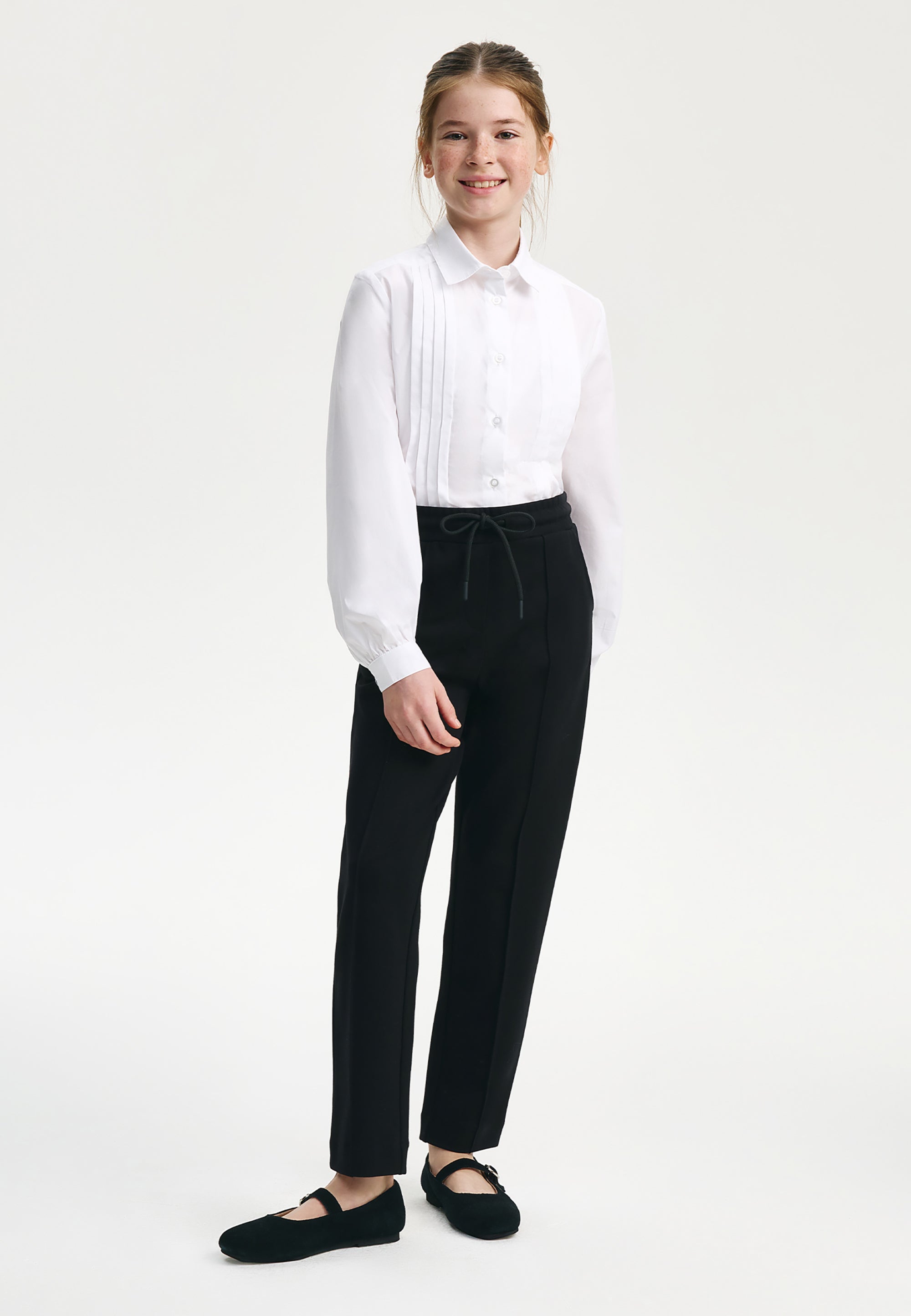 Черните трикотажни панталони са стилен, строг и комфортен вариант за училищния гардероб на момичето. Училищните панталони са с права, леко вталена надолу форма, изработени са от трикомпонентно джерси на основата на вискоза и се отличават с мекота, пластичност и отлично поддържане на формата. Зашитите ръбове в предната част придават на модела елегантност и предотвратяват разтягането в зоната на коленете. Еластичният колан с връзки осигурява комфортно прилягане на всякакъв тип фигура. Скосените джобове допринасят за удобството. Трикотажните училищни панталони ще съставят достойна комбинация с блузи с права или вталена кройка, с класическо сако или овърсайз сако, с всяко плетено изделие, както и с обемни суитшърти от мек футер, създавайки хармоничен и съвременен училищен комплект.