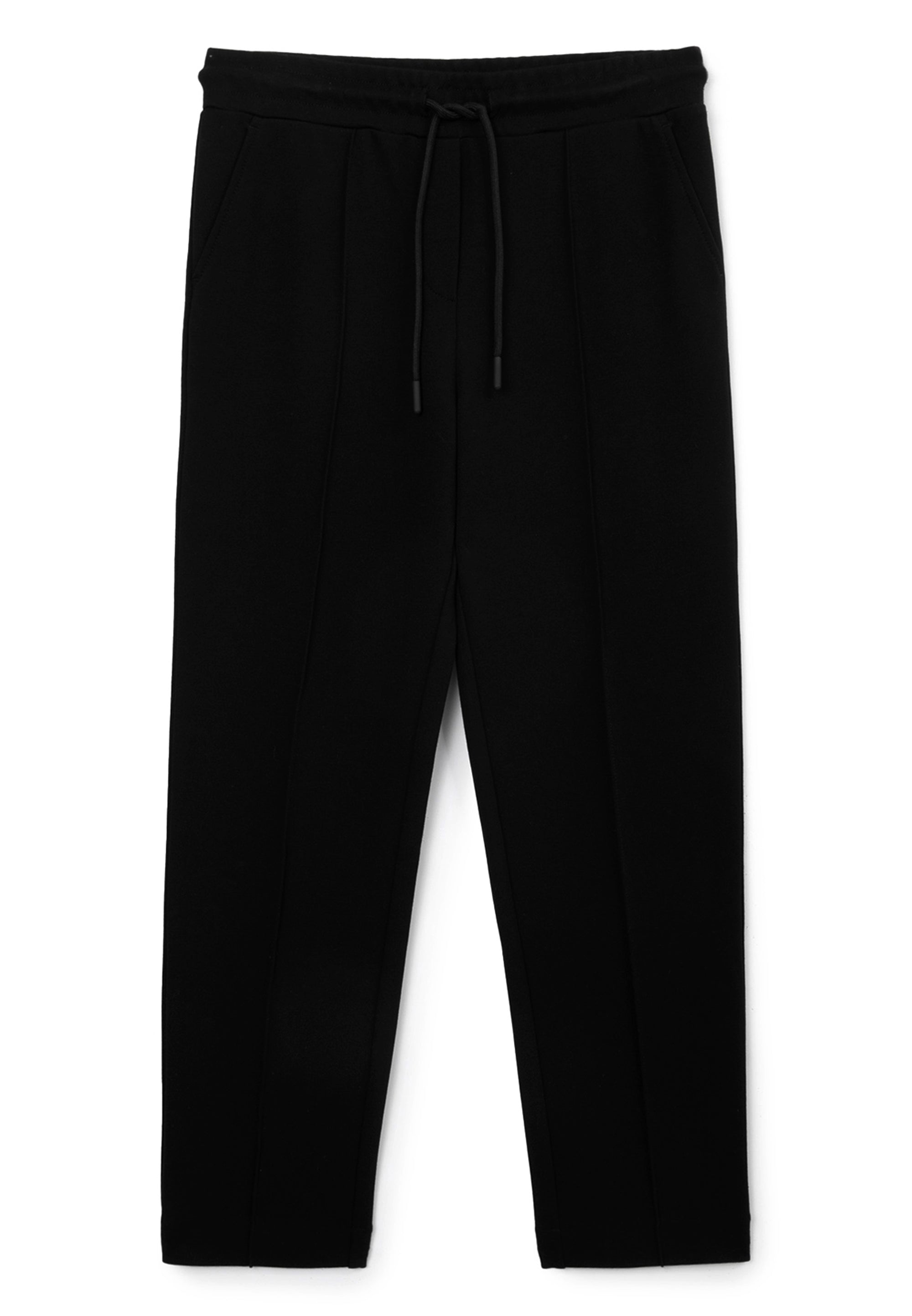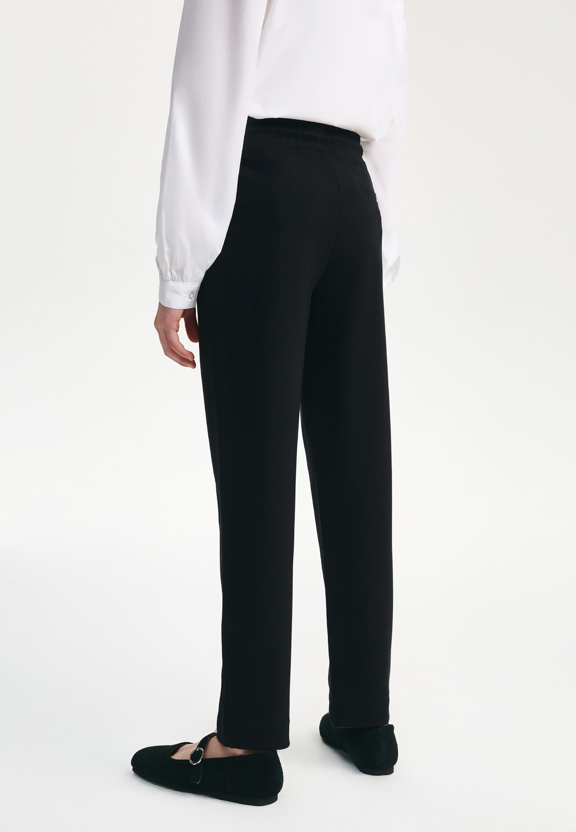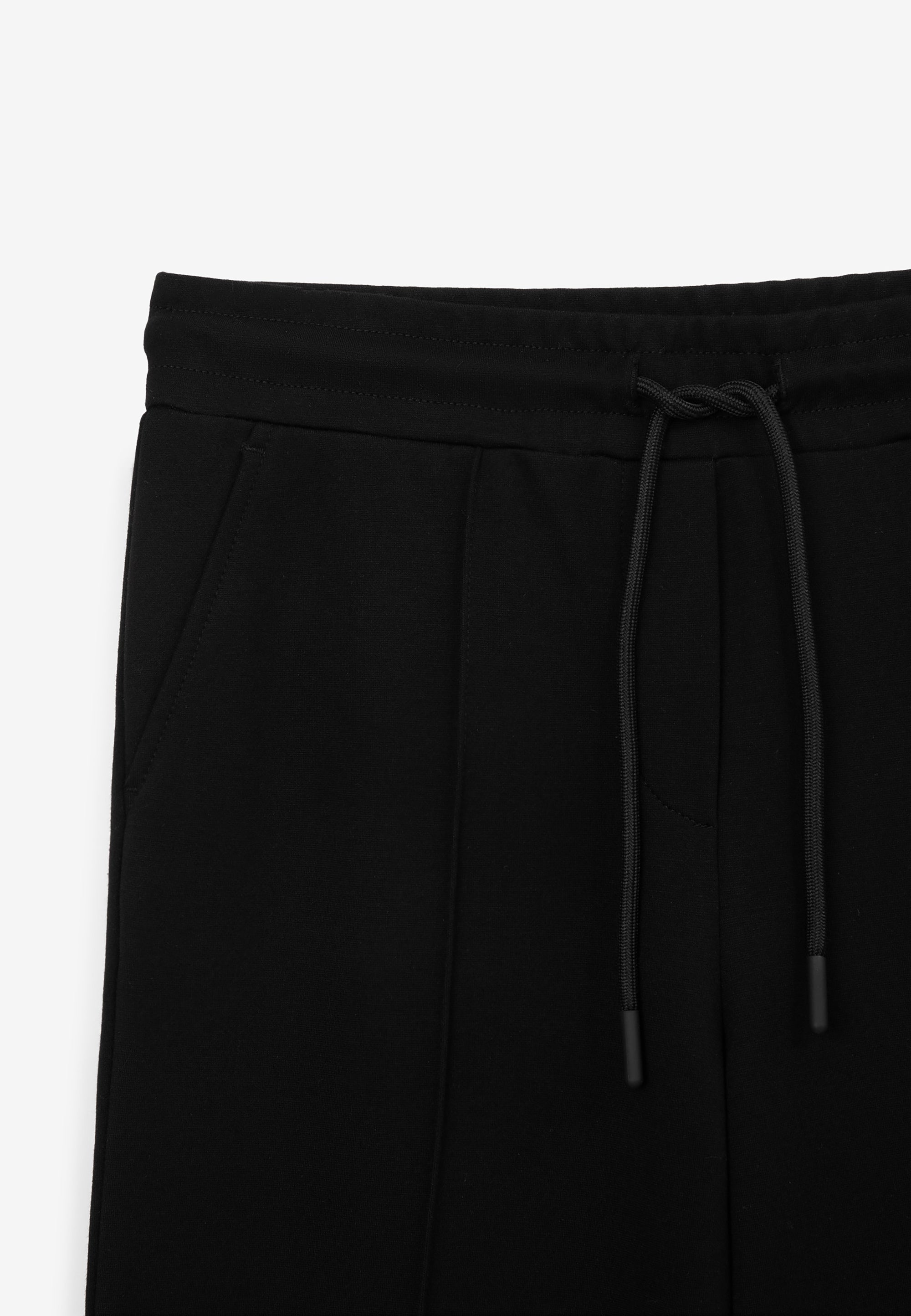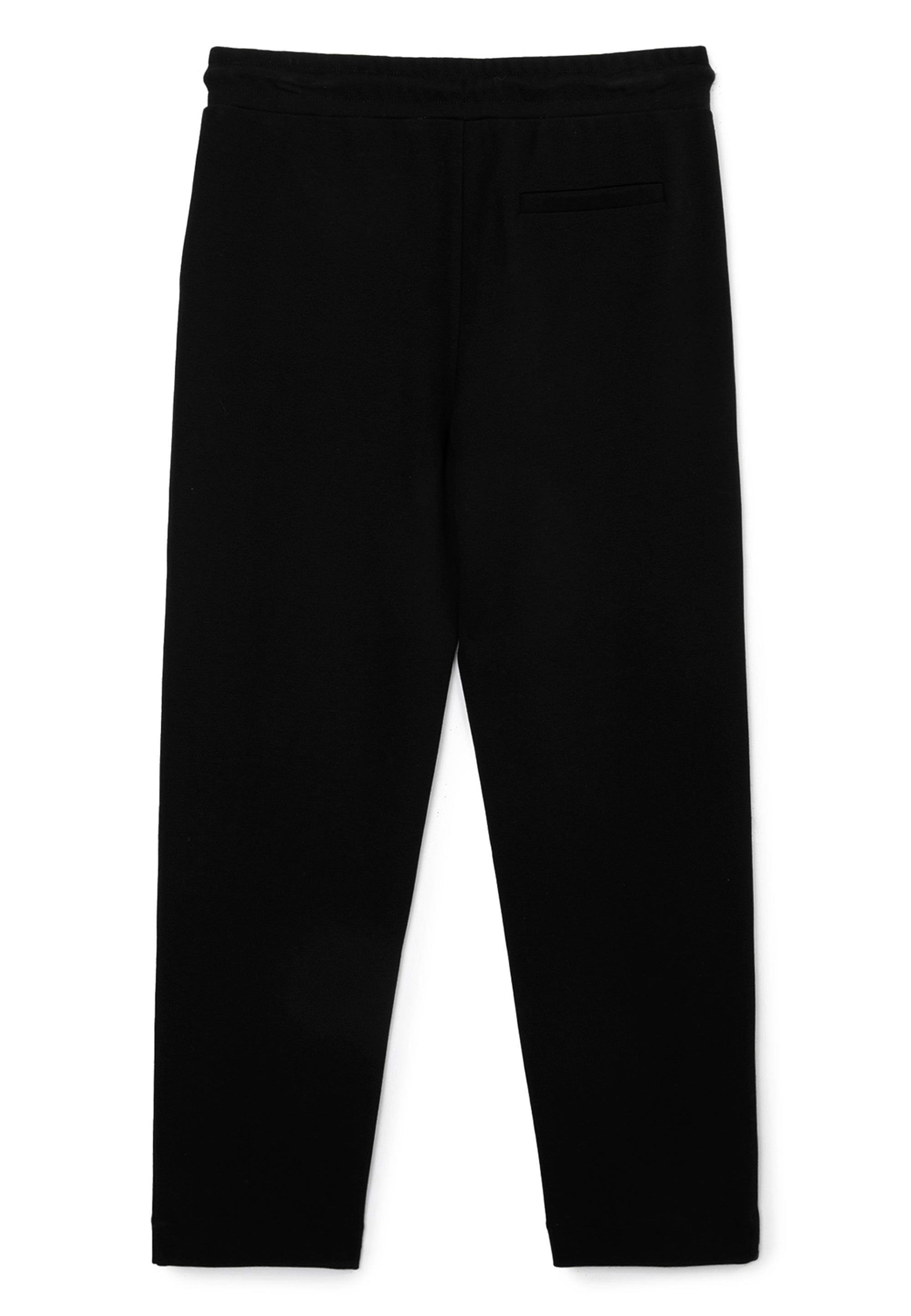 Черните трикотажни панталони са стилен, строг и комфортен вариант за училищния гардероб на момичето. Училищните панталони са с права, леко вталена надолу форма, изработени са от трикомпонентно джерси на основата на вискоза и се отличават с мекота, пластичност и отлично поддържане на формата. Зашитите ръбове в предната част придават на модела елегантност и предотвратяват разтягането в зоната на коленете. Еластичният колан с връзки осигурява комфортно прилягане на всякакъв тип фигура. Скосените джобове допринасят за удобството. Трикотажните училищни панталони ще съставят достойна комбинация с блузи с права или вталена кройка, с класическо сако или овърсайз сако, с всяко плетено изделие, както и с обемни суитшърти от мек футер, създавайки хармоничен и съвременен училищен комплект.