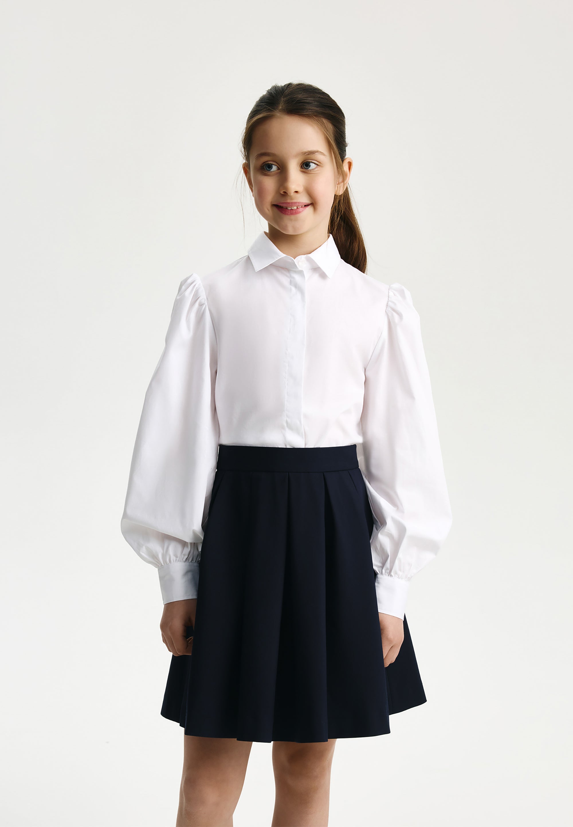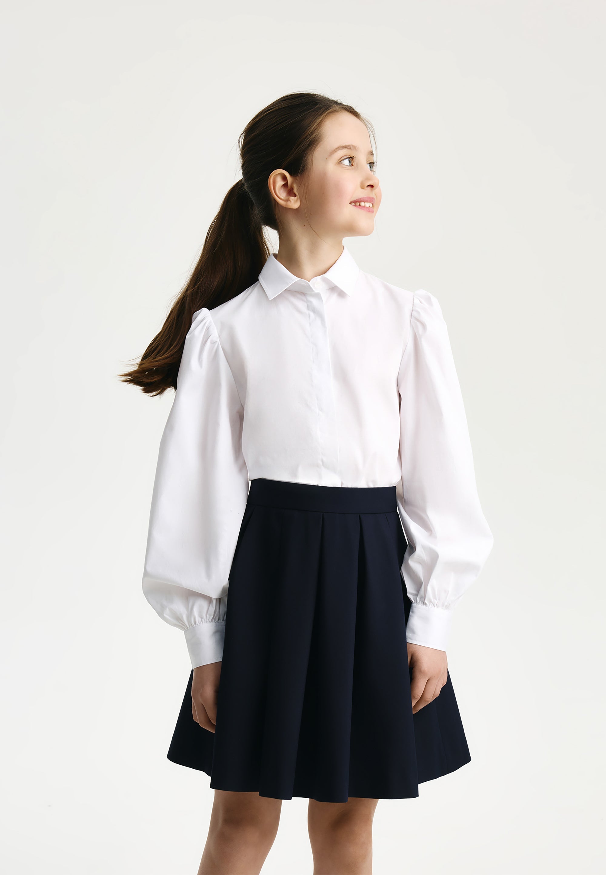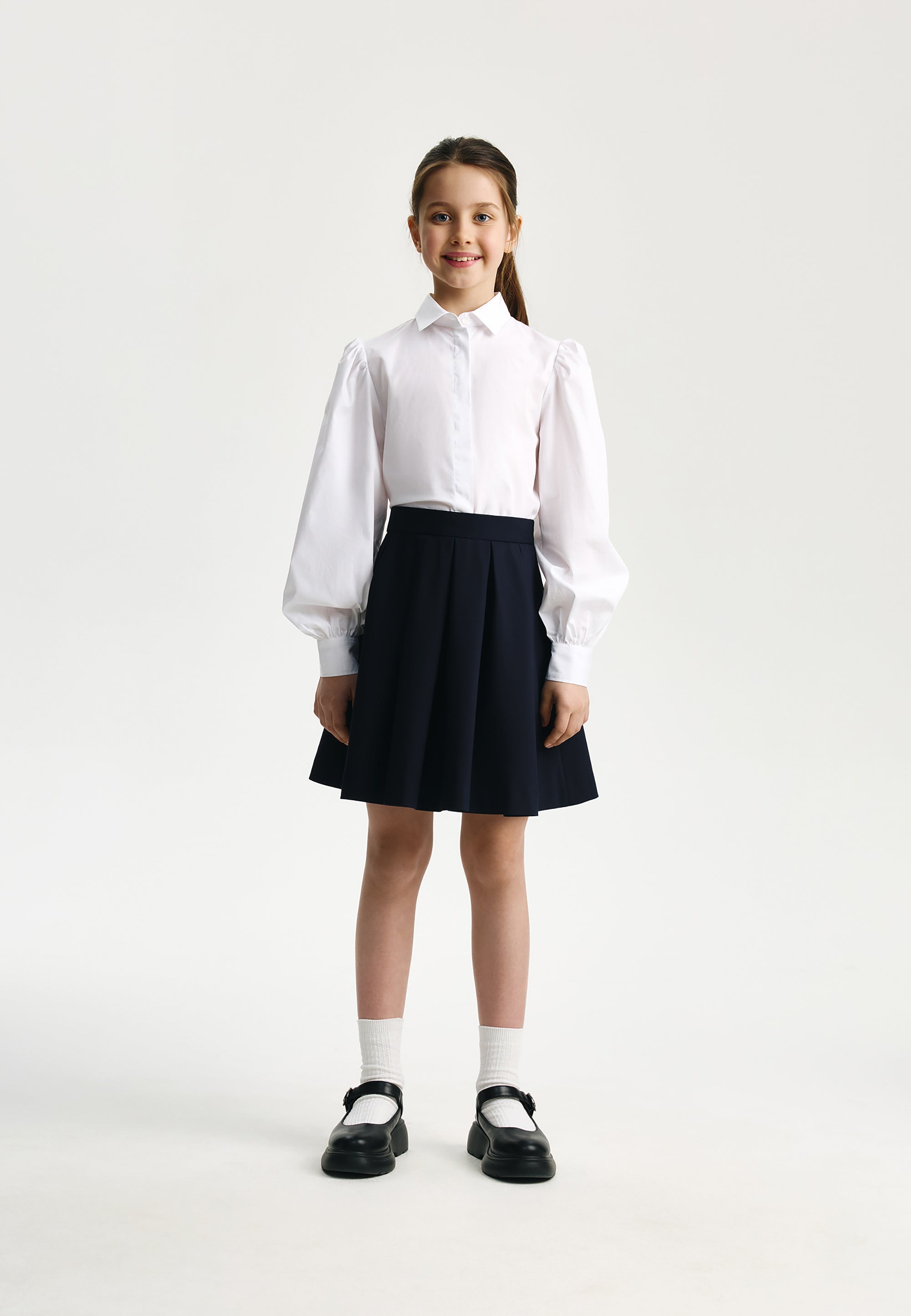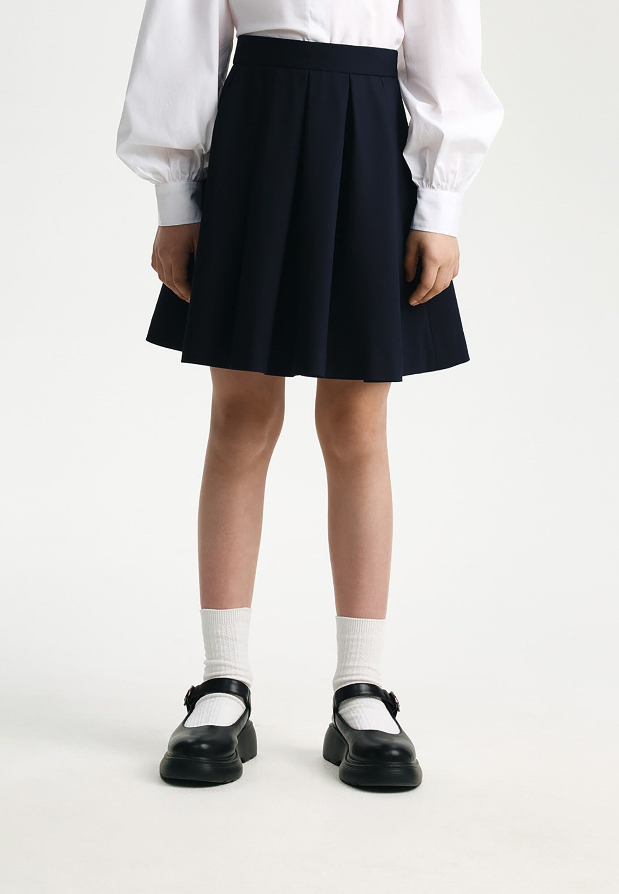 Синята пола с плохи е извън времето и модата. Тя винаги изглежда красиво, изтънчено и благородно, създавайки строги, скромни и елегантни визии. Училищната пола е изработена от смесена материя на основата на вискоза с добавка на естествена вълна, благодарение на което отлично поддържа формата си, приятна е на допир и не изисква сложна поддръжка. Копринената подплата осигурява комфортно плъзгане при движение. Полата се закопчава с цип. Вътрешното регулиране на ширината на колана спомага за комфортното прилягане на модела при момичета с различно телосложение.