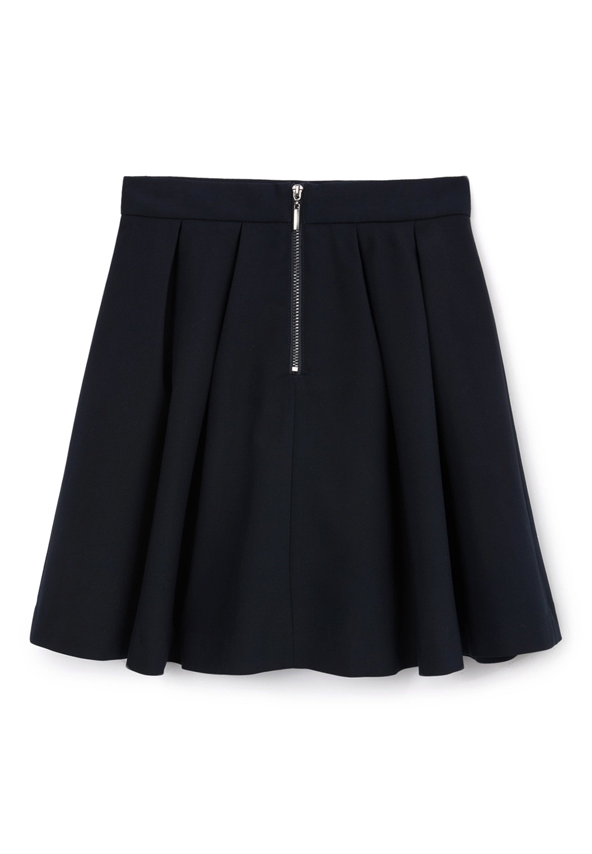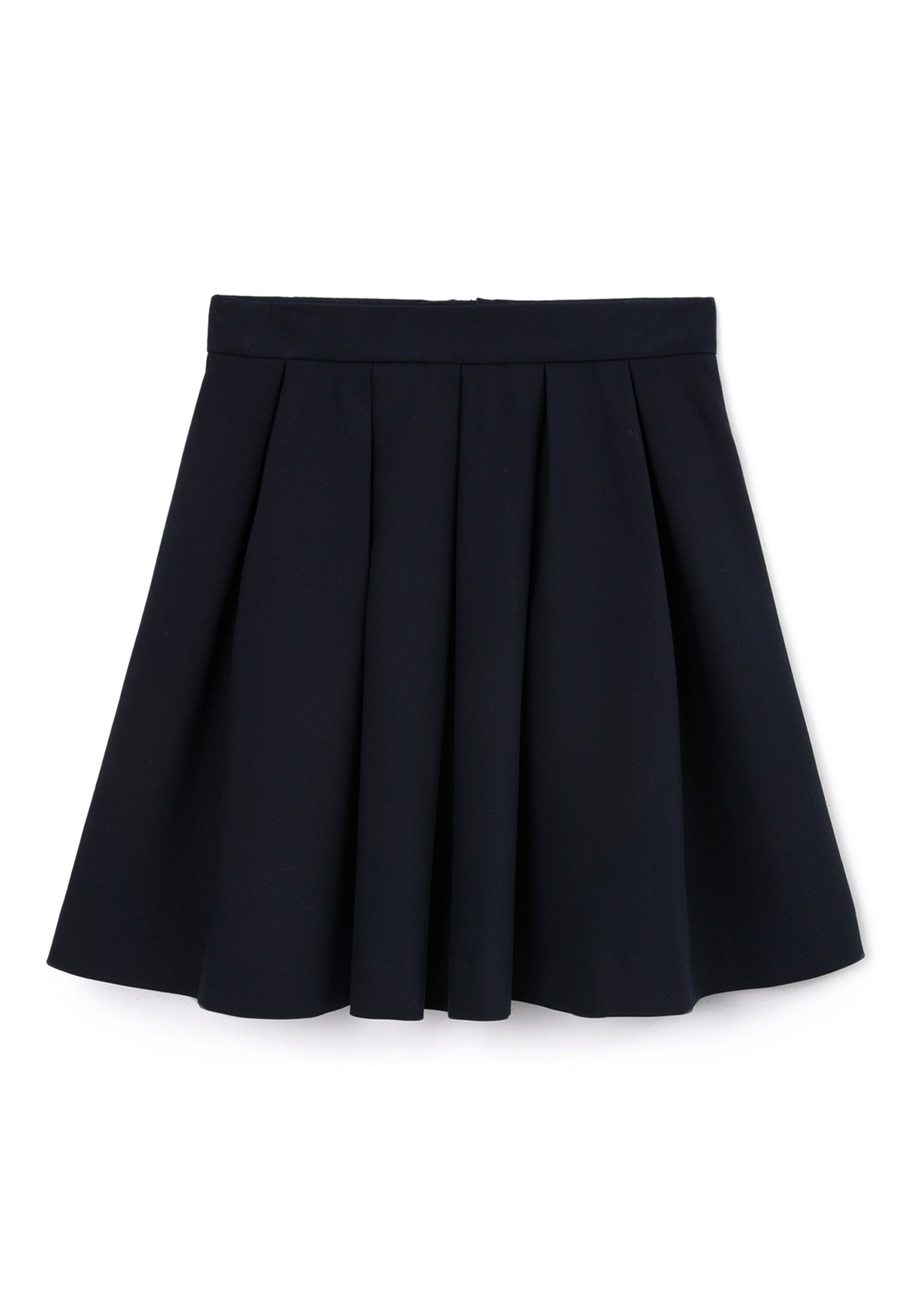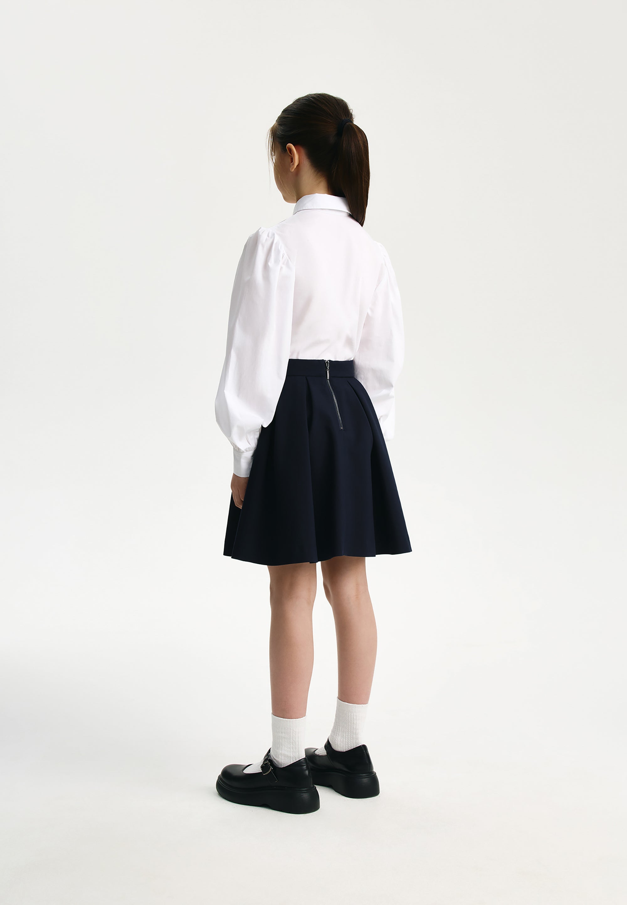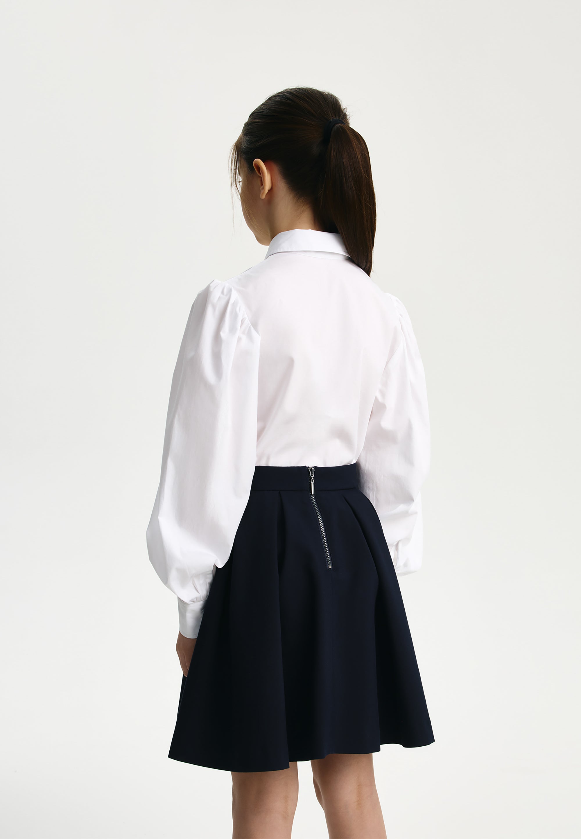Синята пола с плохи е извън времето и модата. Тя винаги изглежда красиво, изтънчено и благородно, създавайки строги, скромни и елегантни визии. Училищната пола е изработена от смесена материя на основата на вискоза с добавка на естествена вълна, благодарение на което отлично поддържа формата си, приятна е на допир и не изисква сложна поддръжка. Копринената подплата осигурява комфортно плъзгане при движение. Полата се закопчава с цип. Вътрешното регулиране на ширината на колана спомага за комфортното прилягане на модела при момичета с различно телосложение.