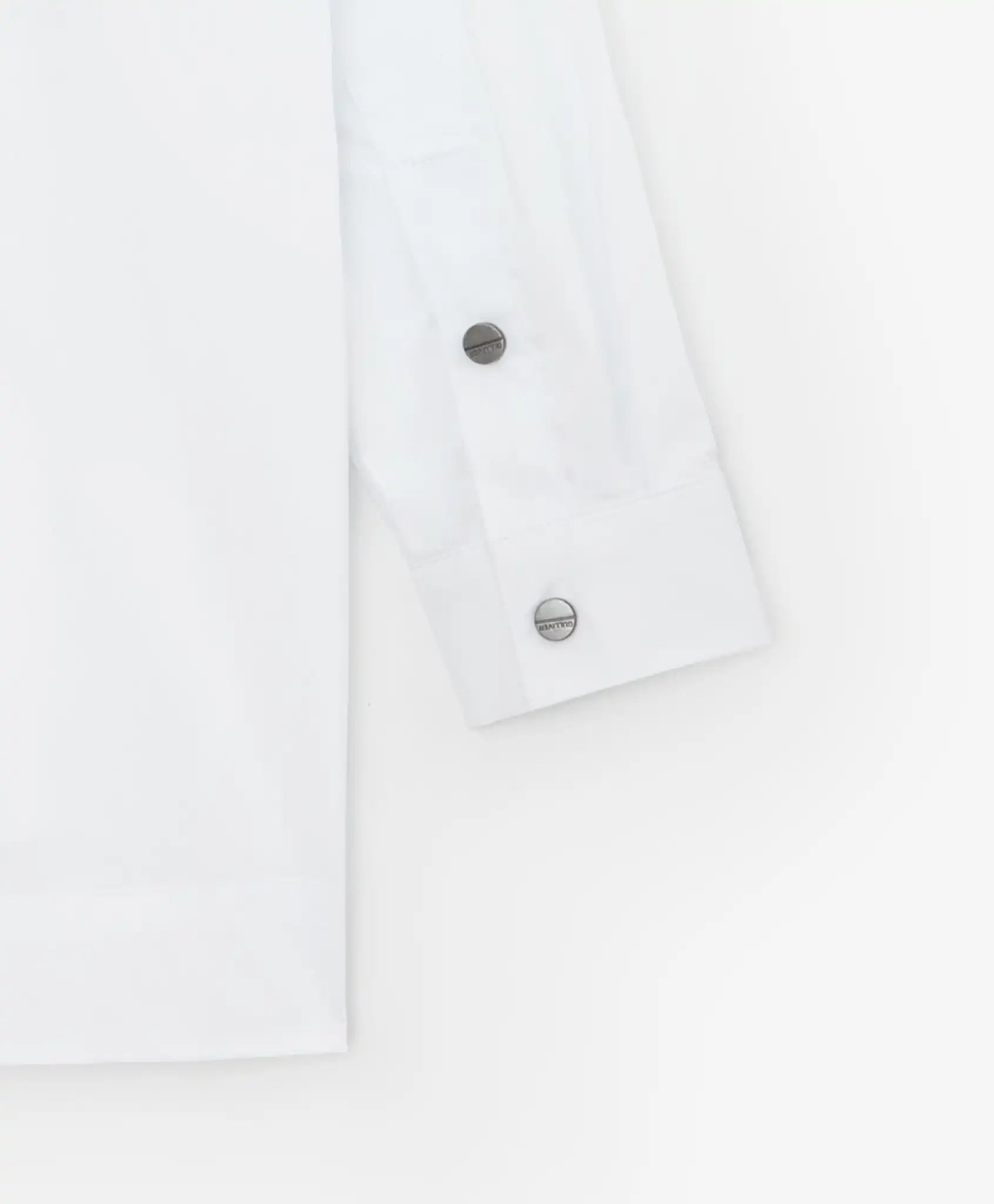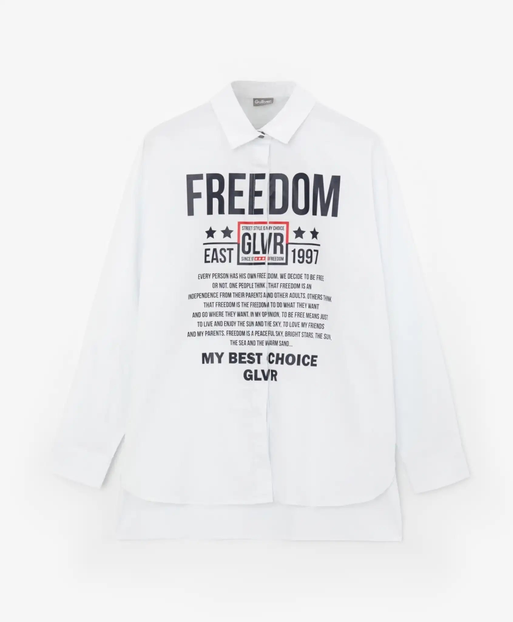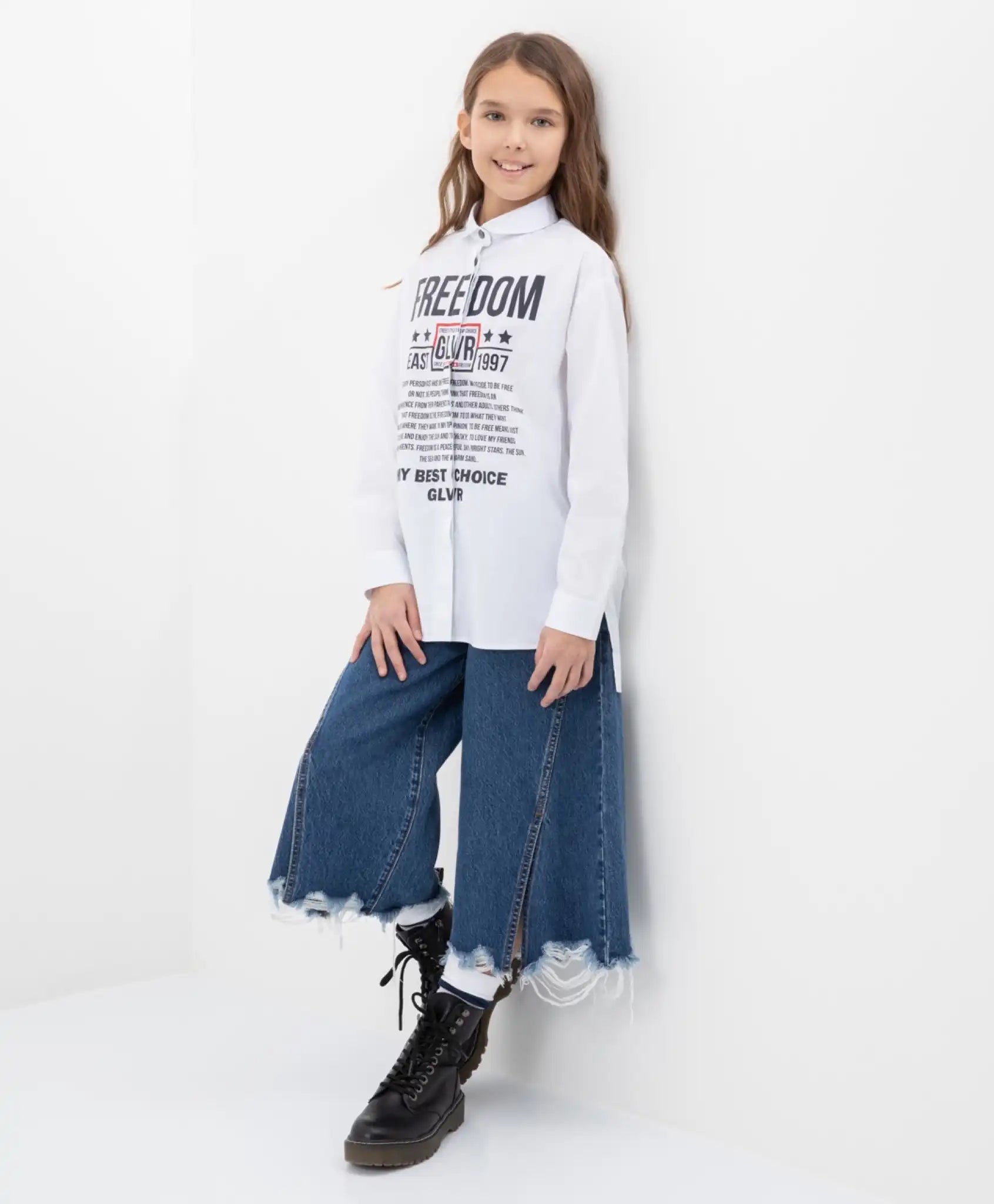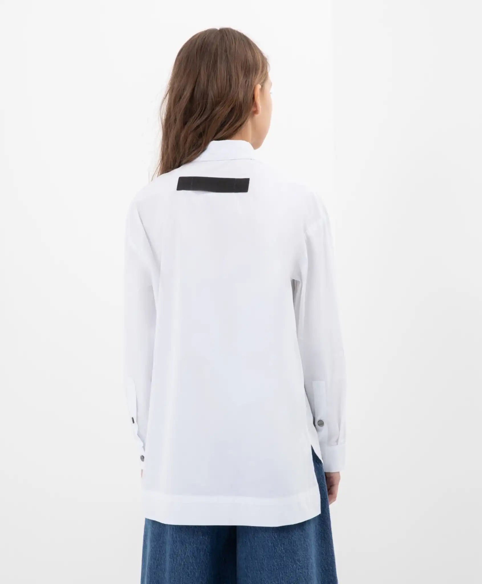 Cămașă albă supradimensionată, cu umeri căzuți și spate prelungit, este un element esențial în garderoba unei adolescente stilate. Cămașa albă are proprietatea unică de a conferi instantaneu prospețime și modernitate oricărei ținute, combinându-se ușor și elegant cu orice pereche de blugi sau pantaloni. Designul original al acestui model o face și mai interesantă și dorită în garderoba de primăvară-vară a unei fete. Departe de a fi o variantă strictă pentru școală, acest model - cu imprimeu contrastant mare, patch și panglică pe spate - oferă multiple posibilități pentru a evidenția bunul gust și alinierea la tendințele modei.