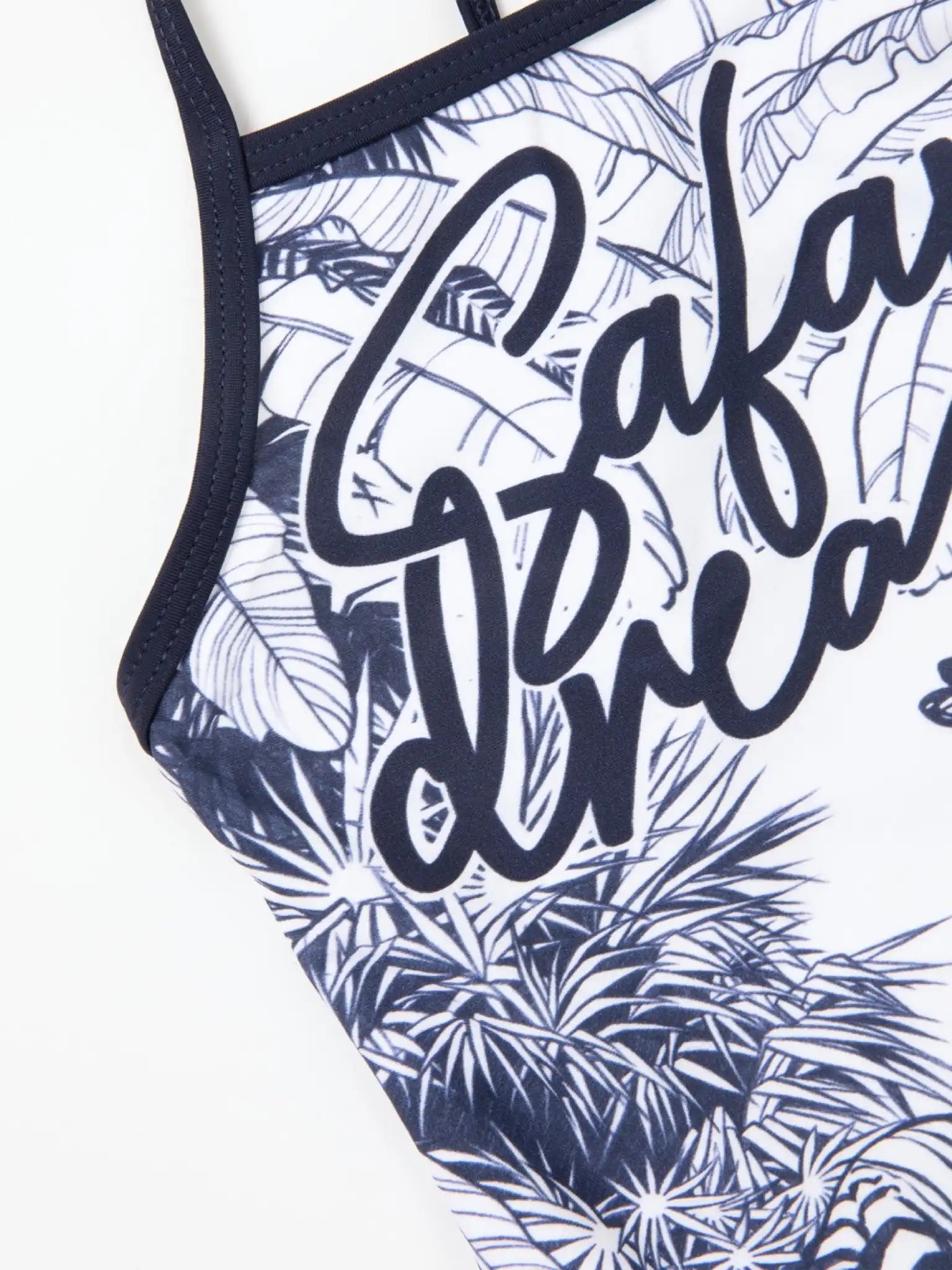 Costum de baie întreg, construit pe combinația dintre materialul de bază cu un imprimeu în stil "Toile de Jouy" și finisaje albastre uni – varianta ideală pentru relaxarea la apă. Costumul de baie arată frumos, interesant, neobișnuit, creând o ținută de plajă vibrantă și originală.