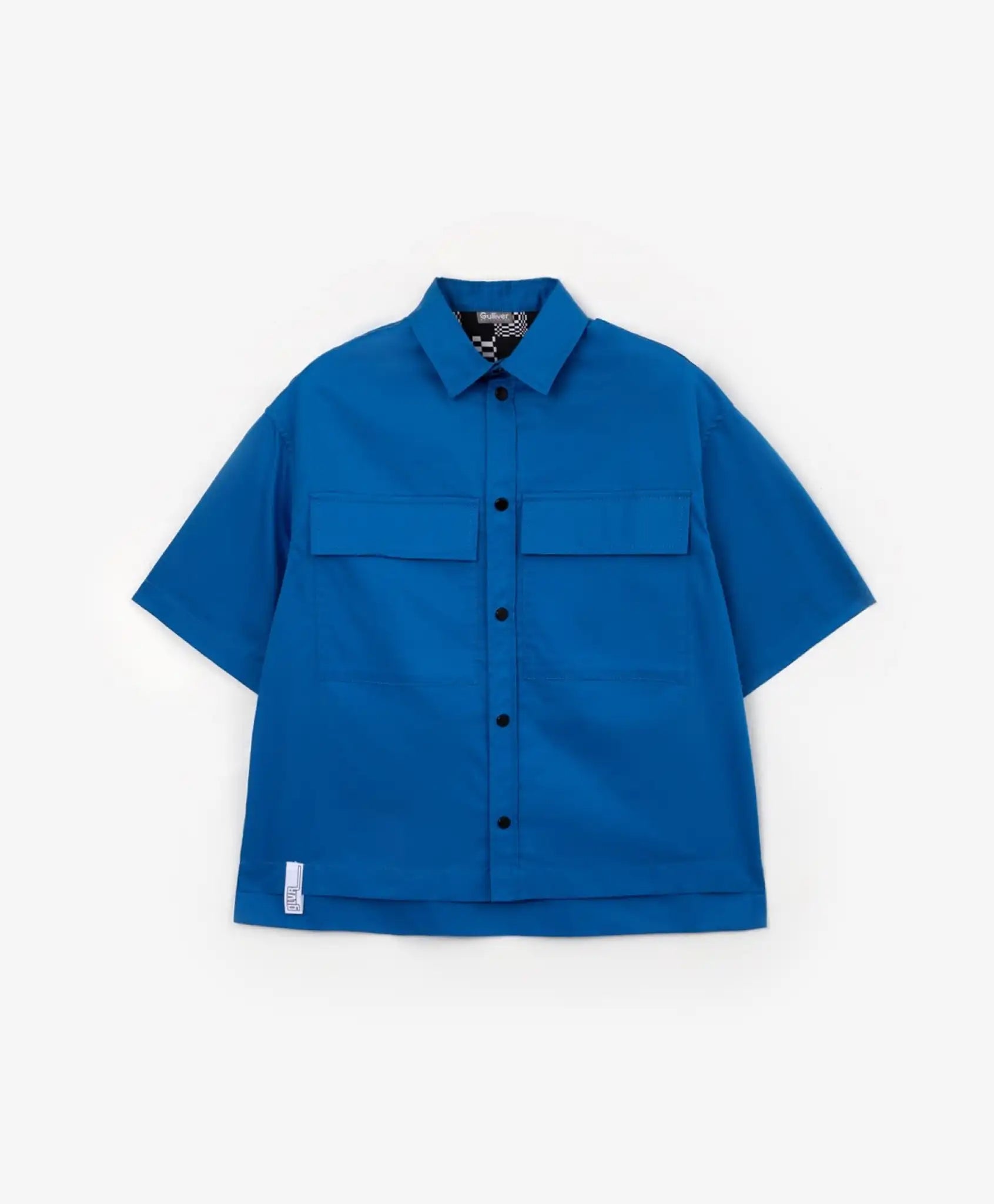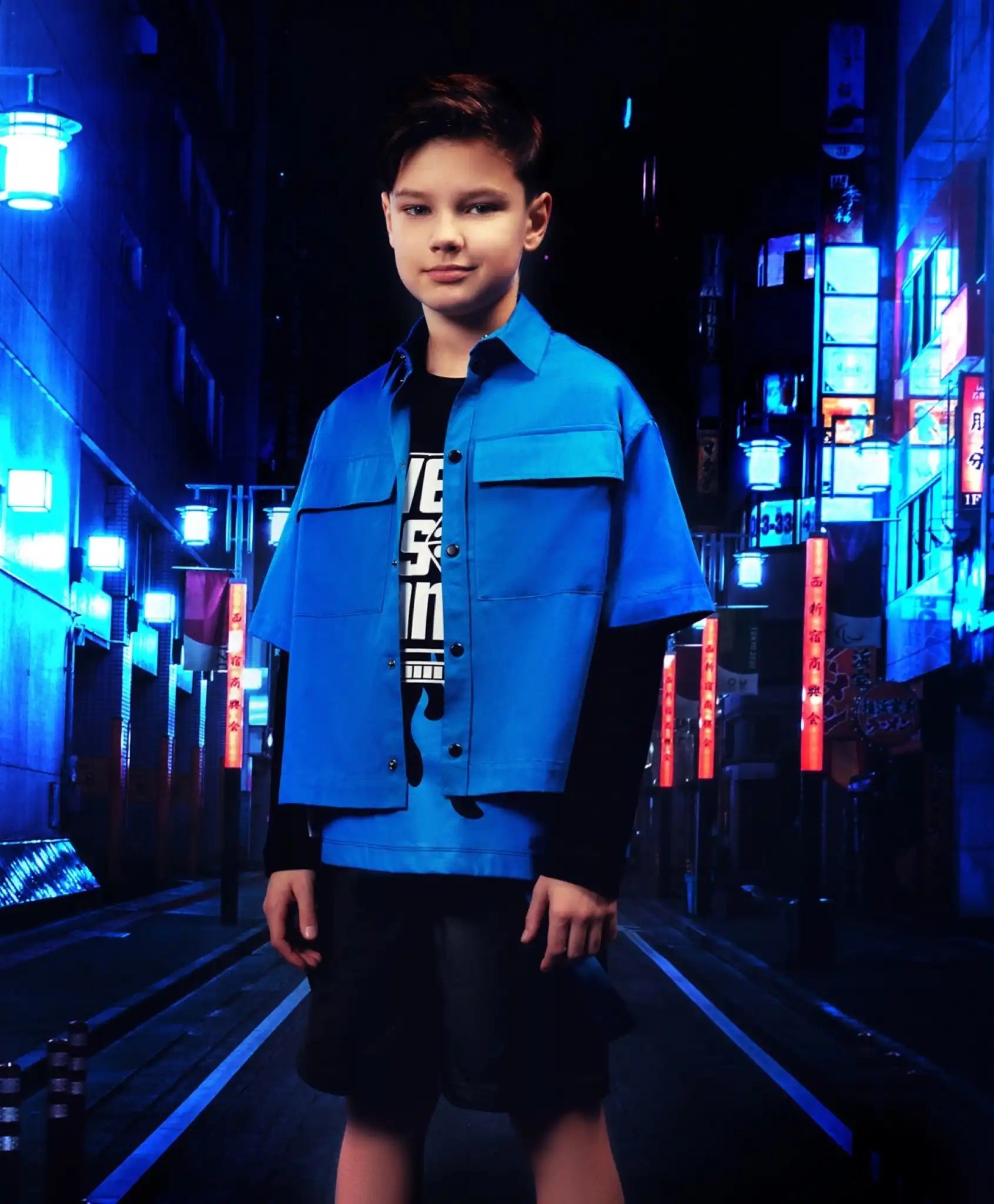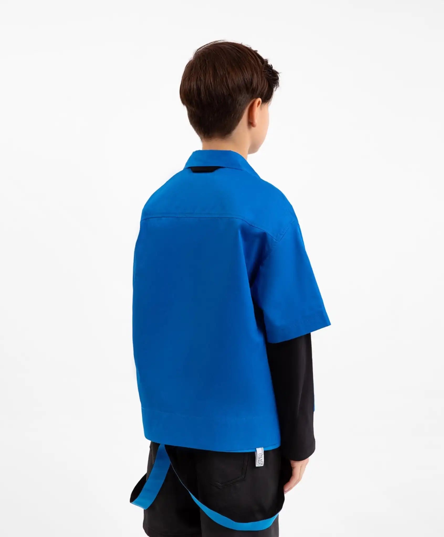 Cămașa albastră din poplin, cu croială lejeră, va adăuga un plus de libertate și relaxare stilului băiatului. Silueta oversize, spatele prelungit și tăieturile laterale permit purtarea cămășii atât ca piesă independentă, cât și în combinație cu un tricou, transformând-o într-un element al unui outfit stratificat. Designul cămășii include un patch sub formă de steag și elemente tipografice. Cămașa se încheie cu nasturi.