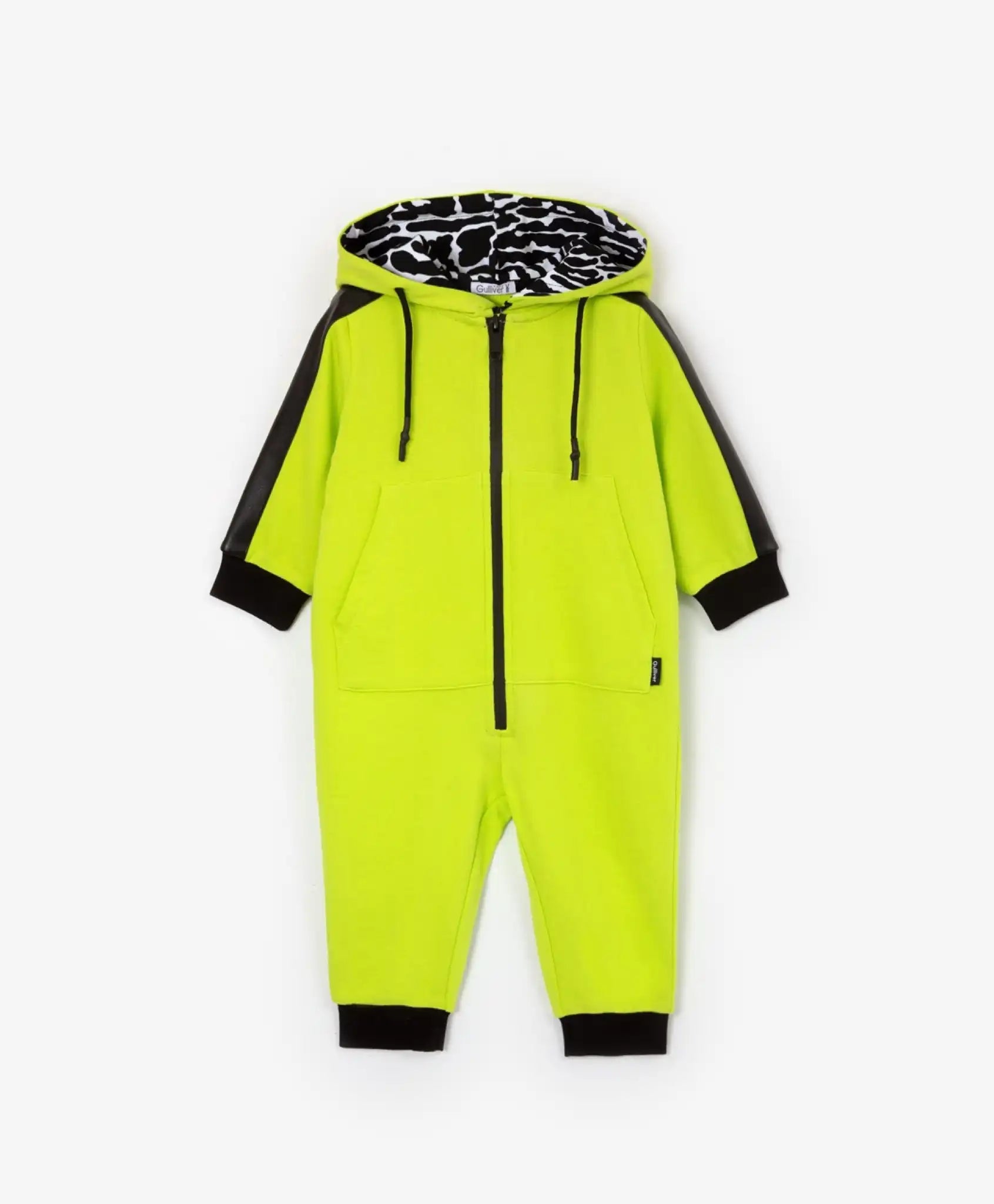 Salopetă cu glugă – bestseller Gulliver. Indiferent dacă este purtată acasă, la plimbare sau în timpul somnului în cărucior, această salopetă oferă confort maxim, esențial pentru un copil mic. Designul modelului este inspirat din stilul sportiv, având un contrast cromatic între materialul principal și elementele decorative, dungi personalizate pe mâneci și detalii tipografice, care fac salopeta captivantă și memorabilă. Căptușeala glugii, realizată din tricot cu imprimeu animalier, adaugă un aer extravagant și contribuie la conturarea unui stil îndrăzneț pentru micul dandy.