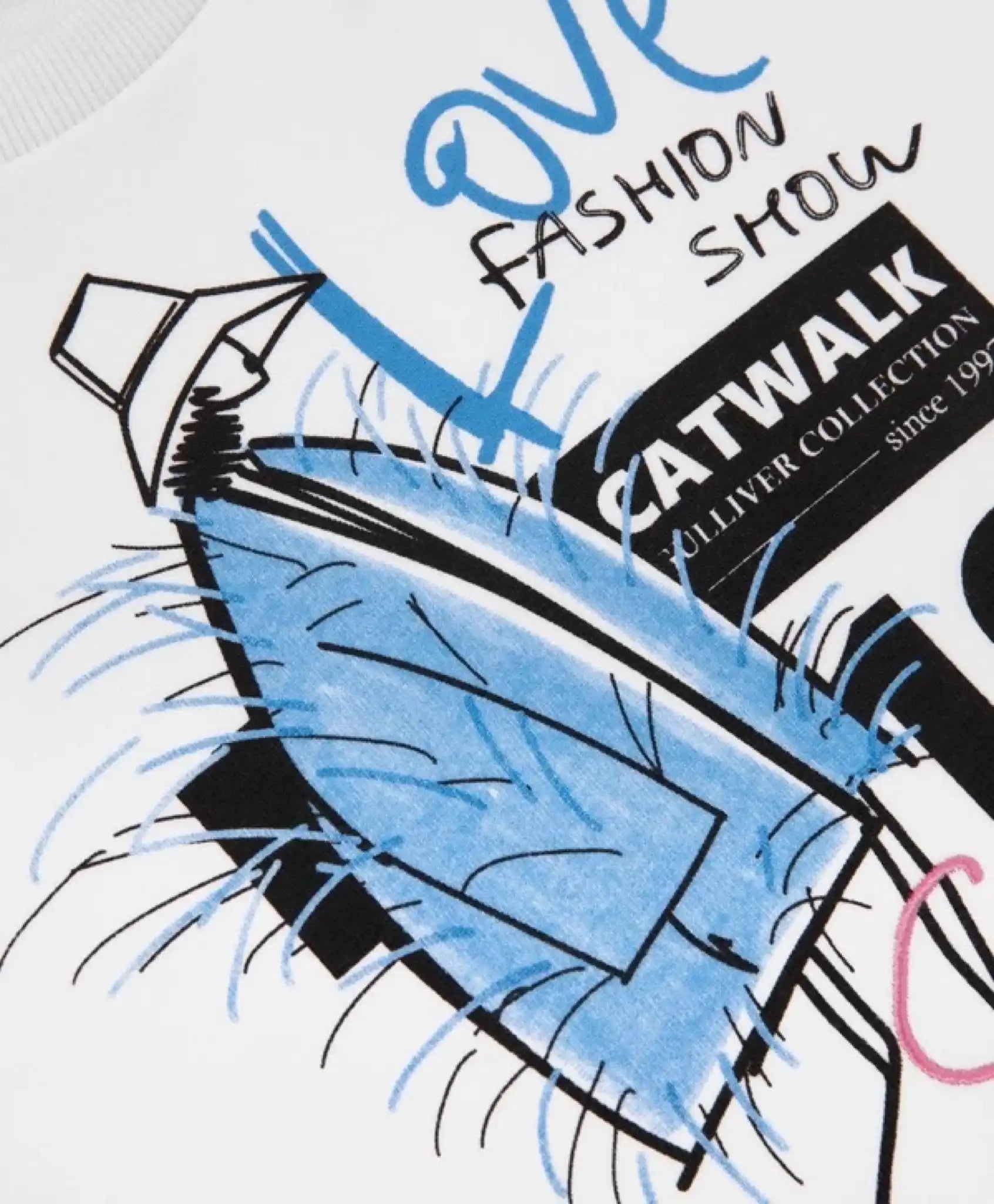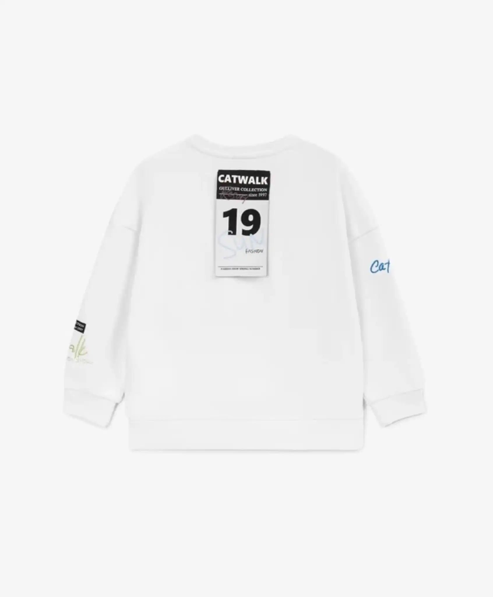 Hanoracul alb din material fleece arată proaspăt și expresiv! Croiala lejeră cu umerii căzuți și linia joasă a spatelui conferă modelului un aer modern și actual. În decor sunt utilizate imprimeuri tematice interesante și petice din colecția Gulliver „Podium”, precum și o etichetă detașabilă pe spate, cu grafică tipografică informativă.