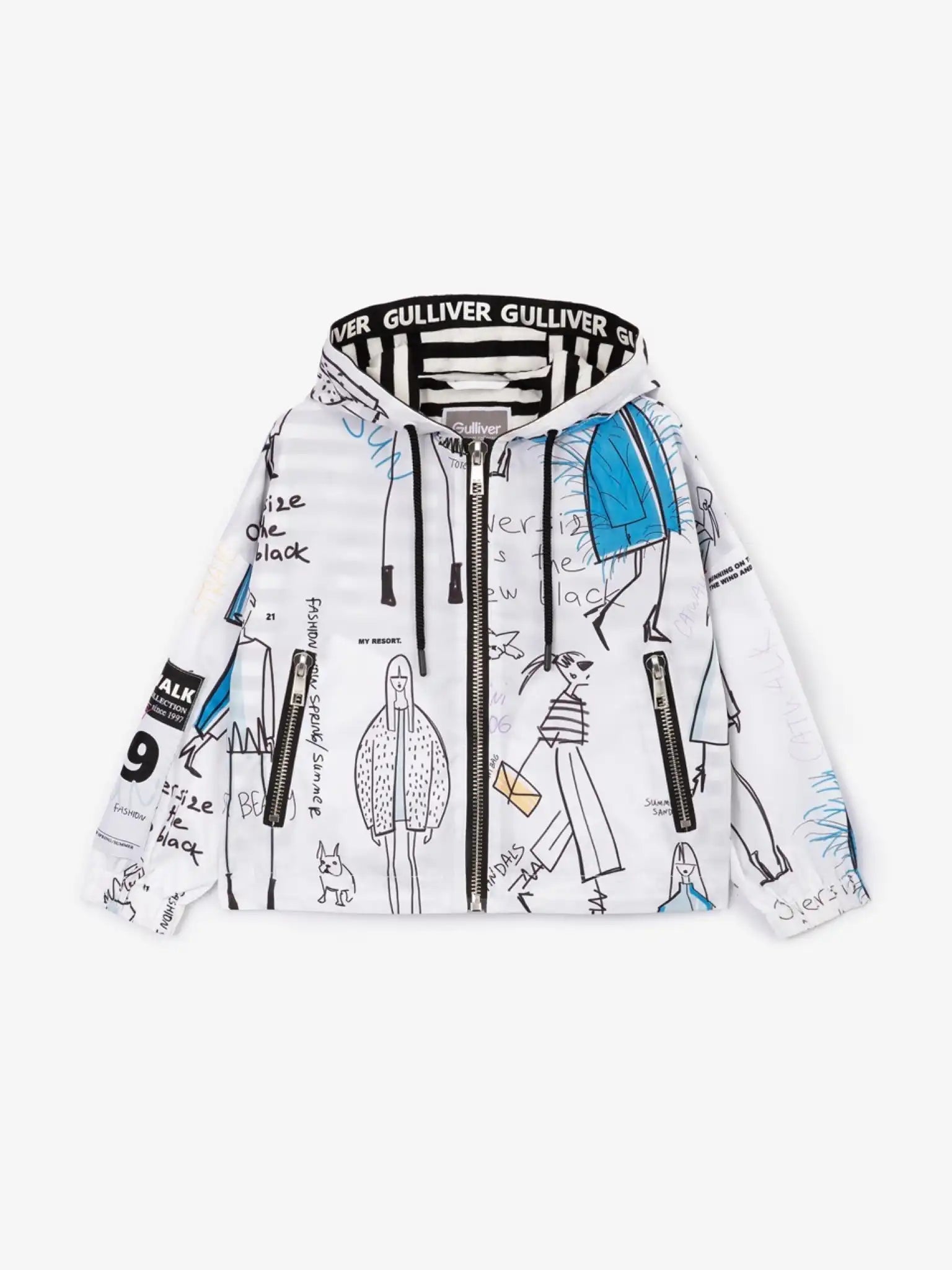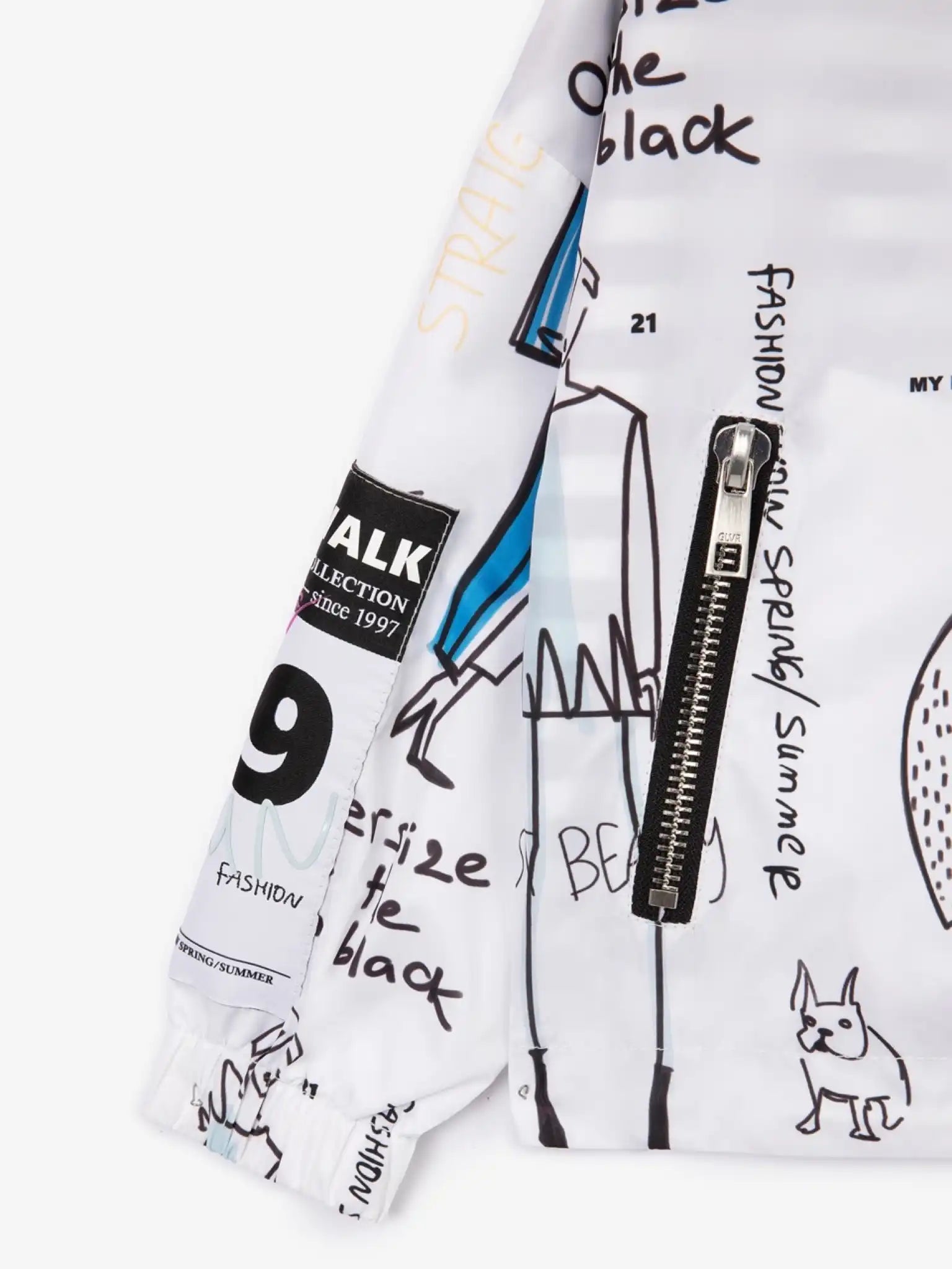 Jachetă de vânt oversize – un element stilistic de impact în garderobă! Designul modelului se bazează pe grafisme puternice și expresive. Schițele, inscripțiile și notițele creează un fundal artistic pentru detaliile funcționale minimaliste – fermoare metalice la închiderea centrală și buzunare, finisaje contrastante impermeabile. Căptușeala tricotată în dungi adaugă un aer fresh și dinamic, inspirat din stilul marin. Modelul este decorat cu un patch din cauciuc, inscripții în relief și un chevron mare jacquard.