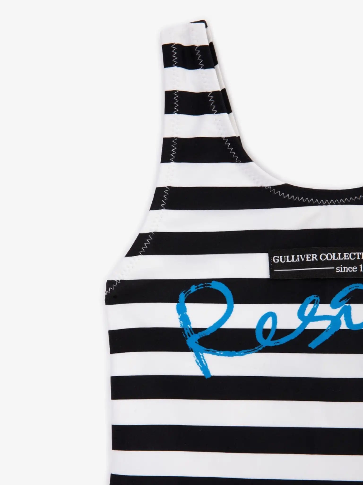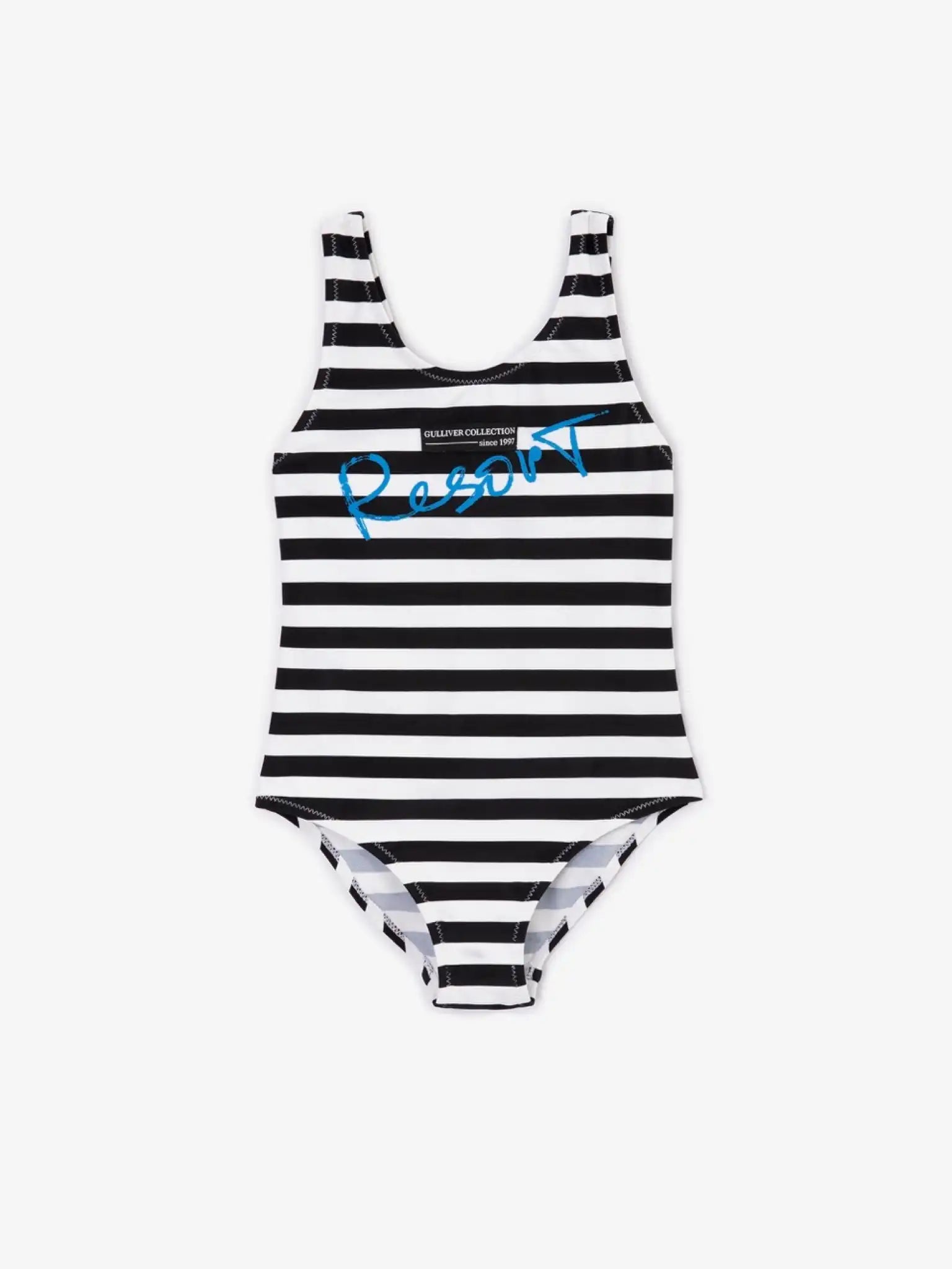 Costumul de baie în dungi, cu imprimeu și patch, este alegerea perfectă pentru vacanța la plajă! Forma modernă, dungile vibrante și dinamice, care reflectă estetica stilului marin, fac din acest costum de baie cea mai bună achiziție în așteptarea vacanței la apă.
