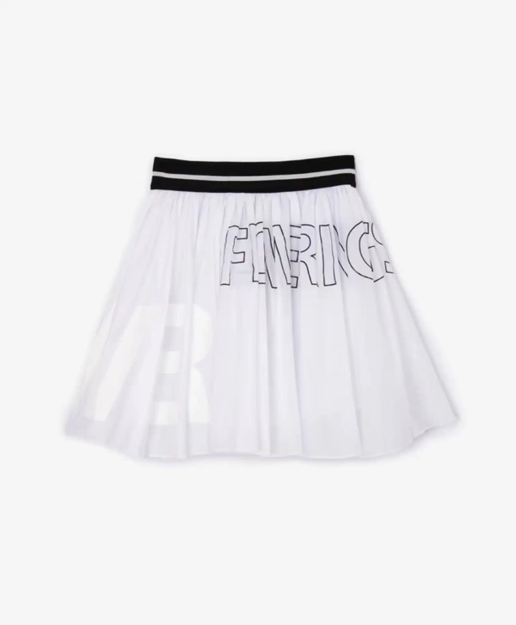 O fustă ușoară și vaporoasă, confecționată din țesătură fină cu căptușeală din bumbac, este o piesă vestimentară vibrantă și interesantă, care combină elemente romantice și sportive. Talia elastică, realizată dintr-o panglică cu dungi contrastante în mijloc și o inscripție tipografică mare, adaugă dinamism și un aer sportiv modelului.