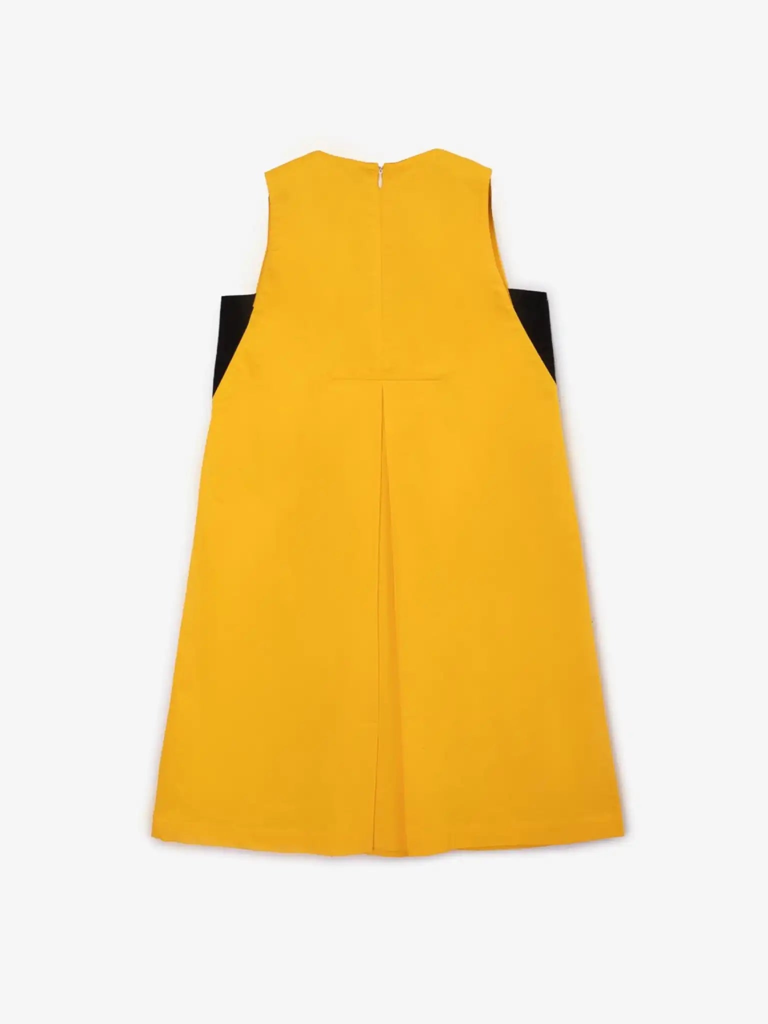 Rochia modernă galbenă din poplin creează o stare de spirit pozitivă! Rochia are o siluetă trapezoidală confortabilă, accentuată de pliuri mari cu fundă în față și în spate. Modelul este construit pe contrastul dintre materialul de bază și decor. Detaliile geometrice negre ale rochiei imită stratificarea, creând impresia unui top purtat dedesubt. Împreună cu buzunarele mari, aceste elemente negre subliniază stilul sportiv al designului, făcând rochia vibrantă și dinamică. În design este utilizat un imprimeu delicat cu elemente tipografice. Rochia se închide cu un fermoar pe spate.