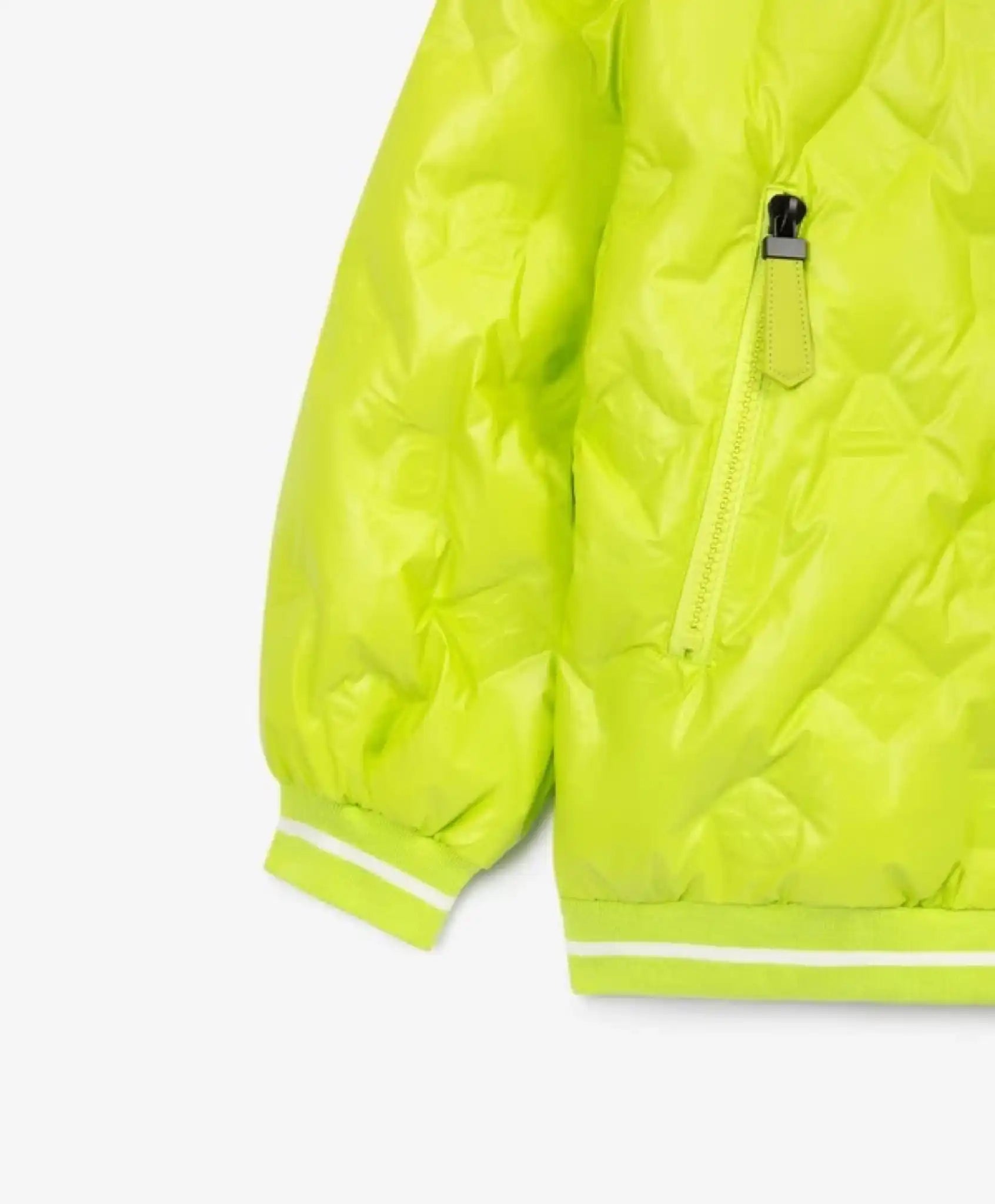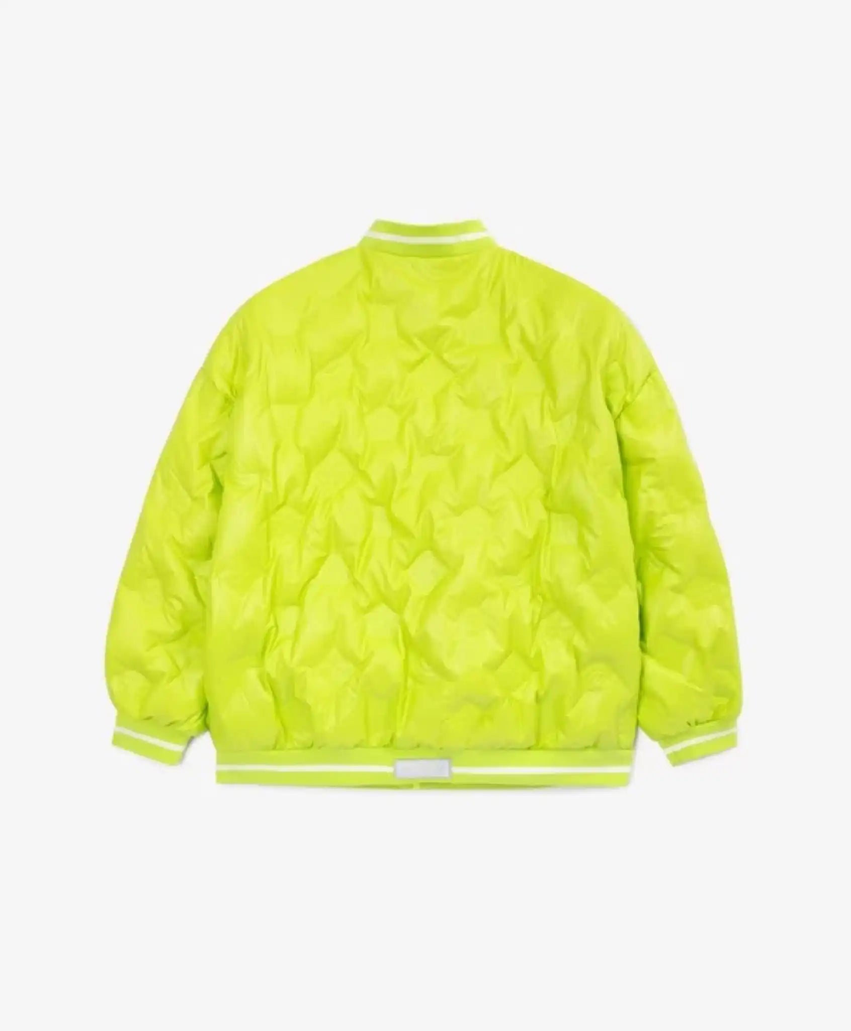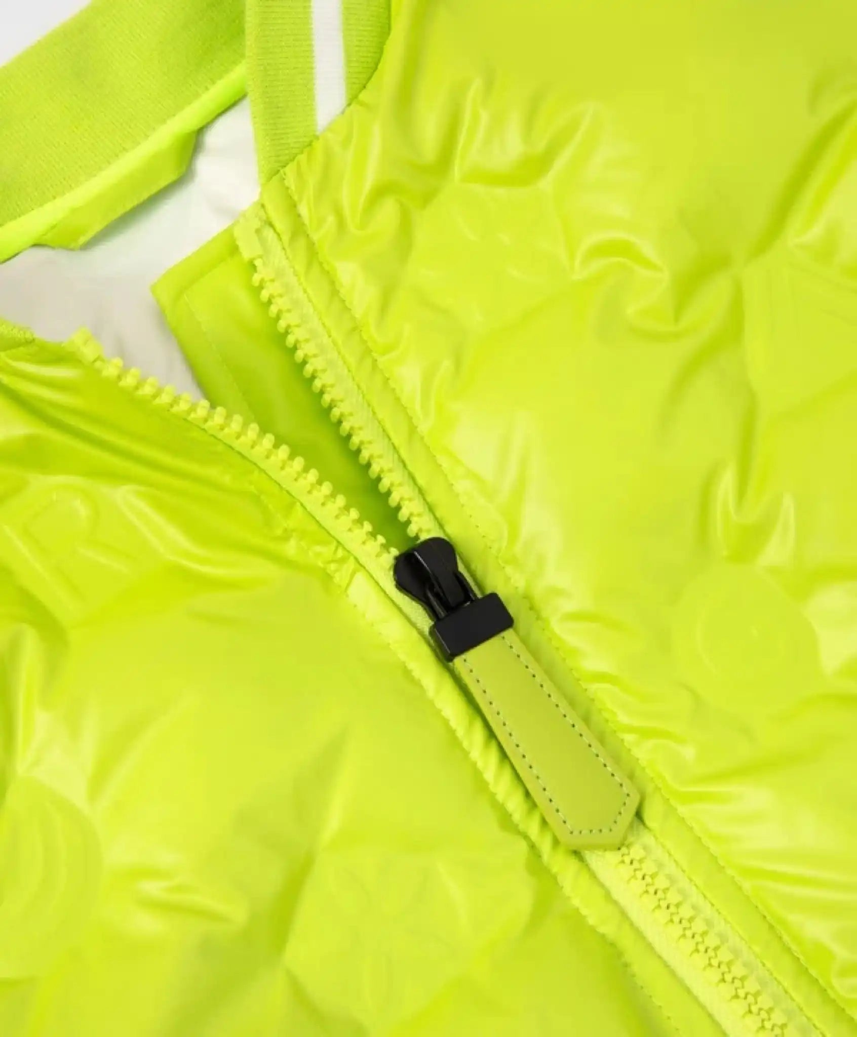 Jachetă bomber izolată, cu o culoare suculentă de lime din material rezistent la apă - cel mai bun mod de a sublinia starea de spirit primăvăratică! Forma liberă voluminoasă face jacheta foarte confortabilă. Modelul din material cu un desen imprimat în ritmuri prestabilite, similar cusăturilor strânse, conferă modelului o textură interesantă. Jacheta se închide cu un fermoar de tractor.