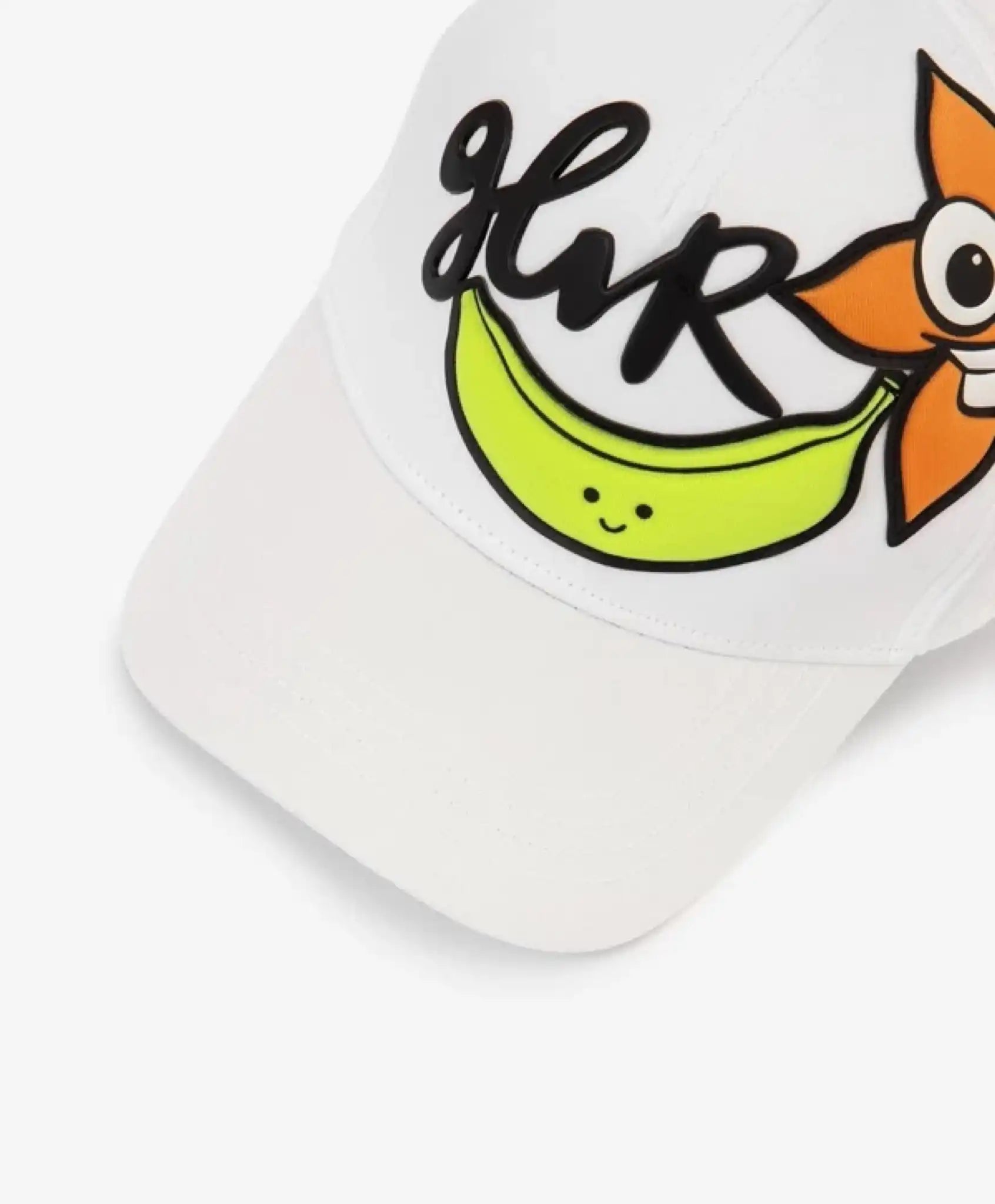 Șapcă albă de baseball cu decorațiuni vibrante și active va crea o atmosferă de vară! În designul modelului sunt utilizate imprimeuri și elemente volumetrice stilizate.