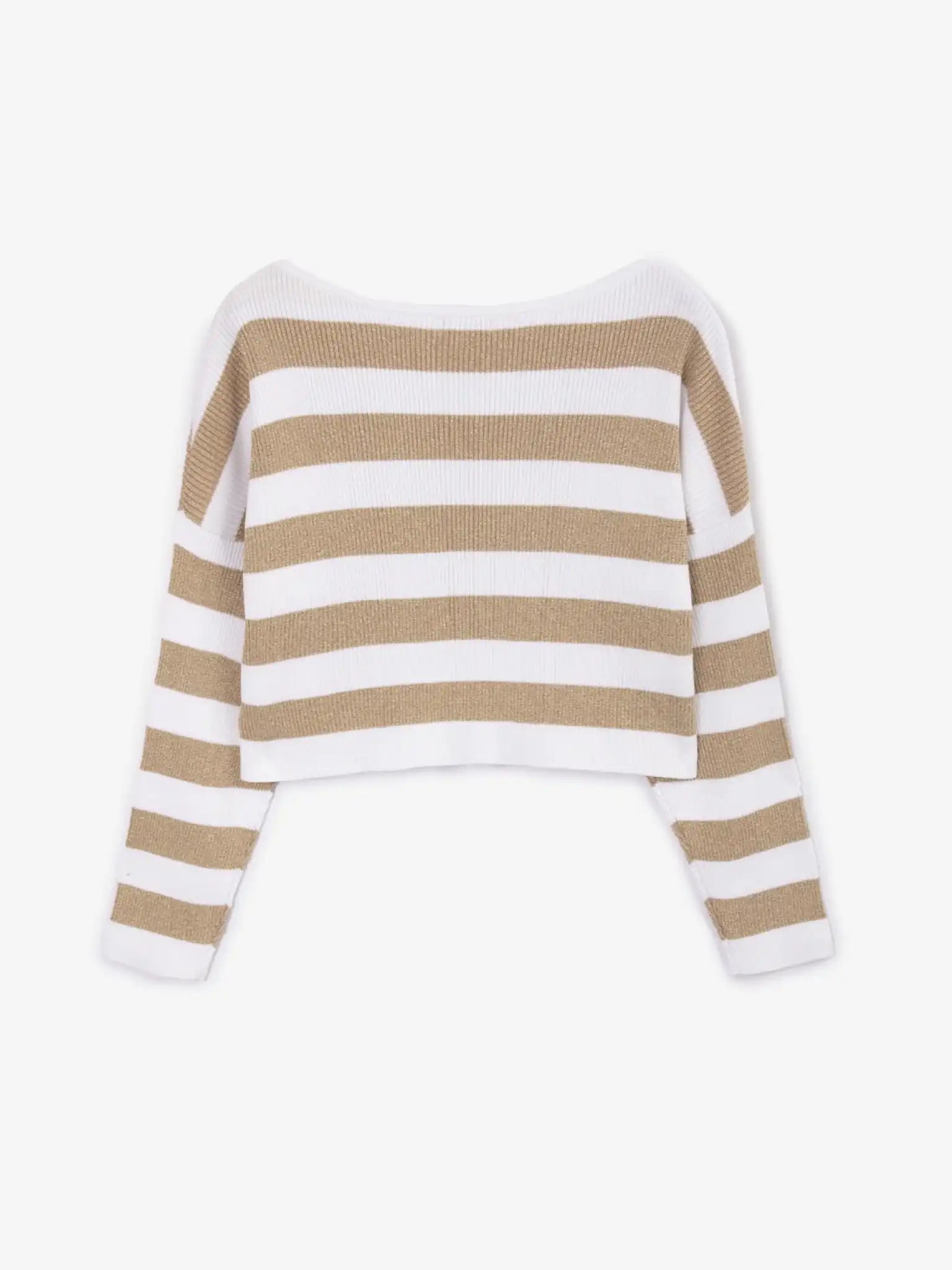 Acest pulover tricotat cu dungi orizontale late și un ușor luciu auriu datorat firelor delicate de lurex este un exemplu de abordare minimalistă în designul vestimentar. Puloverul este tricotat în relief din fire de bumbac cu un mic procent de vâscoză, ceea ce contribuie la finețea, elasticitatea și păstrarea formei produsului. În combinație cu pantaloni, blugi sau fustă, puloverul va arăta elegant, rafinat și sofisticat, conferind imaginii fetei un farmec aparte.