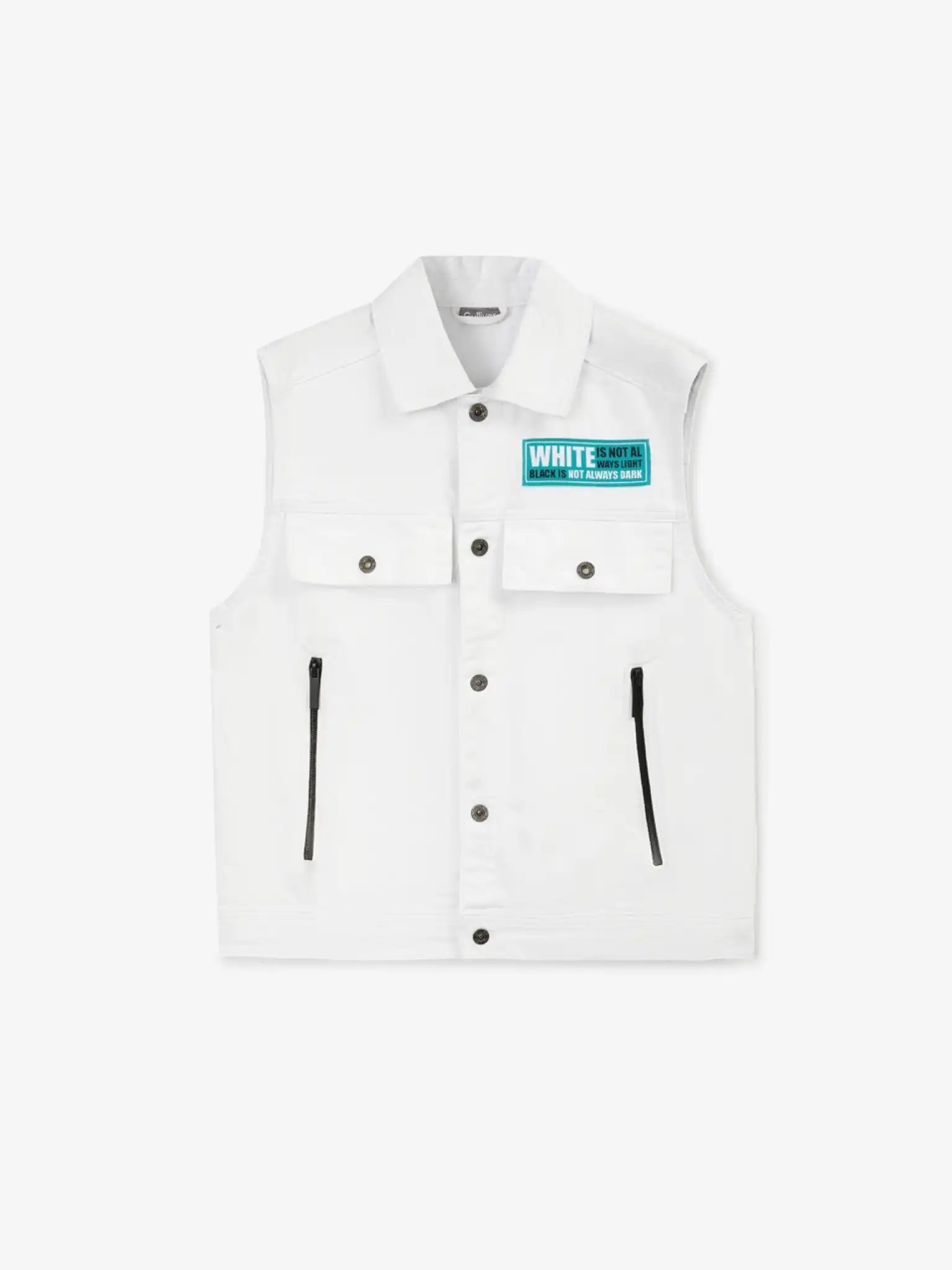 Vestă din denim alb – o modalitate excelentă de a face ținuta mai interesantă și stratificată! Modelul are o croială voluminoasă și lejeră, ceea ce o face ușor de combinat cu tricouri și cămăși oversized. Designul modelului, bazat pe o combinație de elemente structurale clasice ale denimului și detalii noi de finisare și decor, oferă produsului un caracter distinctiv. Vestă are două buzunare funcționale cu fermoare modelate. Designul include un patch din piele de marcă și un chevron brodat elegant. Vestă se închide cu nasturi.