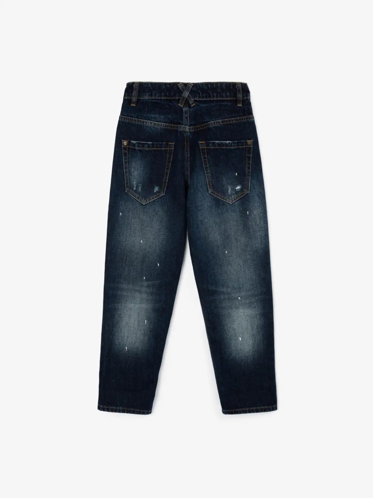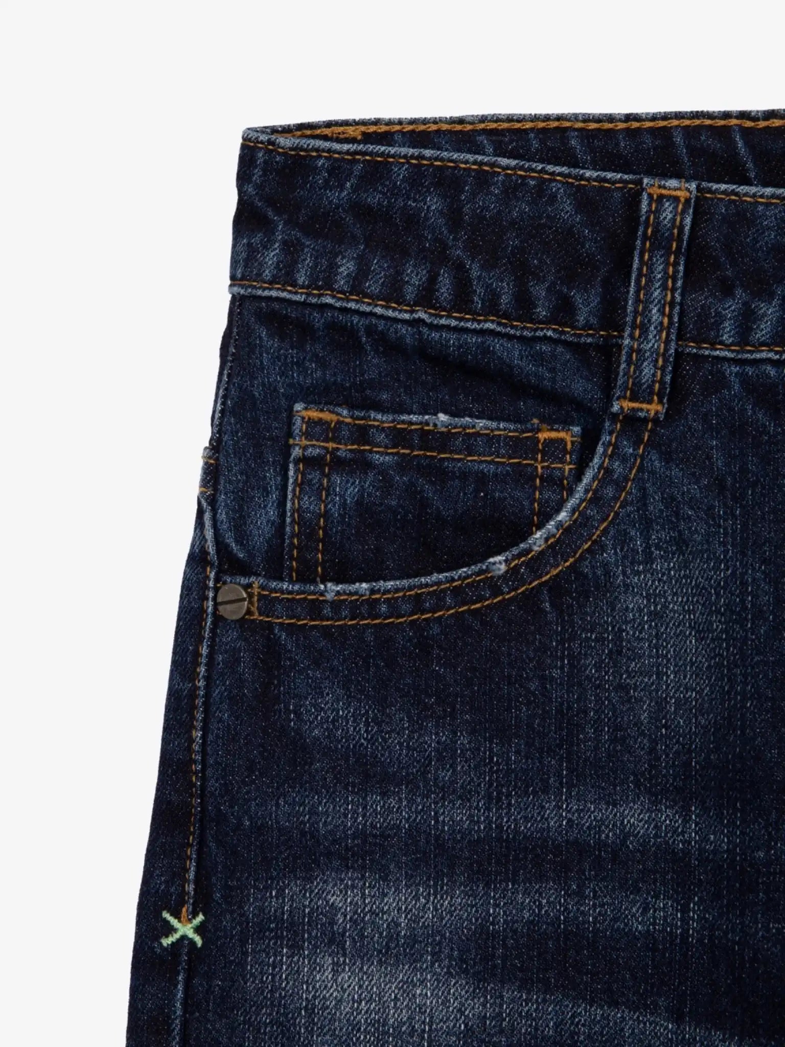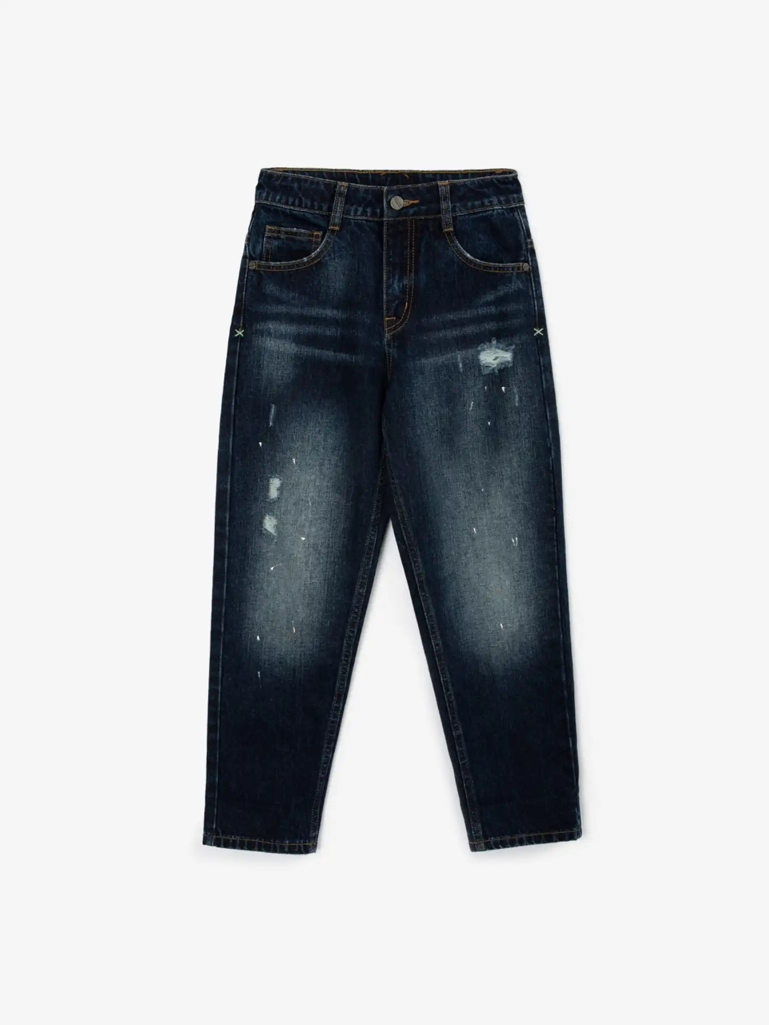 Blugii albaștri, groși, cu croială dreaptă și ușor conică, au toate caracteristicile unui element vestimentar îndrăzneț, modern și interesant. Efectele de uzură, tăieturile, tratamentul special și stropii de vopsea conferă blugilor un aspect brutal, transformându-i într-o piesă de bază pentru outfituri inspirate din stilul grunge. Designul modelului include o broderie subtilă, care se regăsește în toate elementele colecției Gulliver „Nepal”.