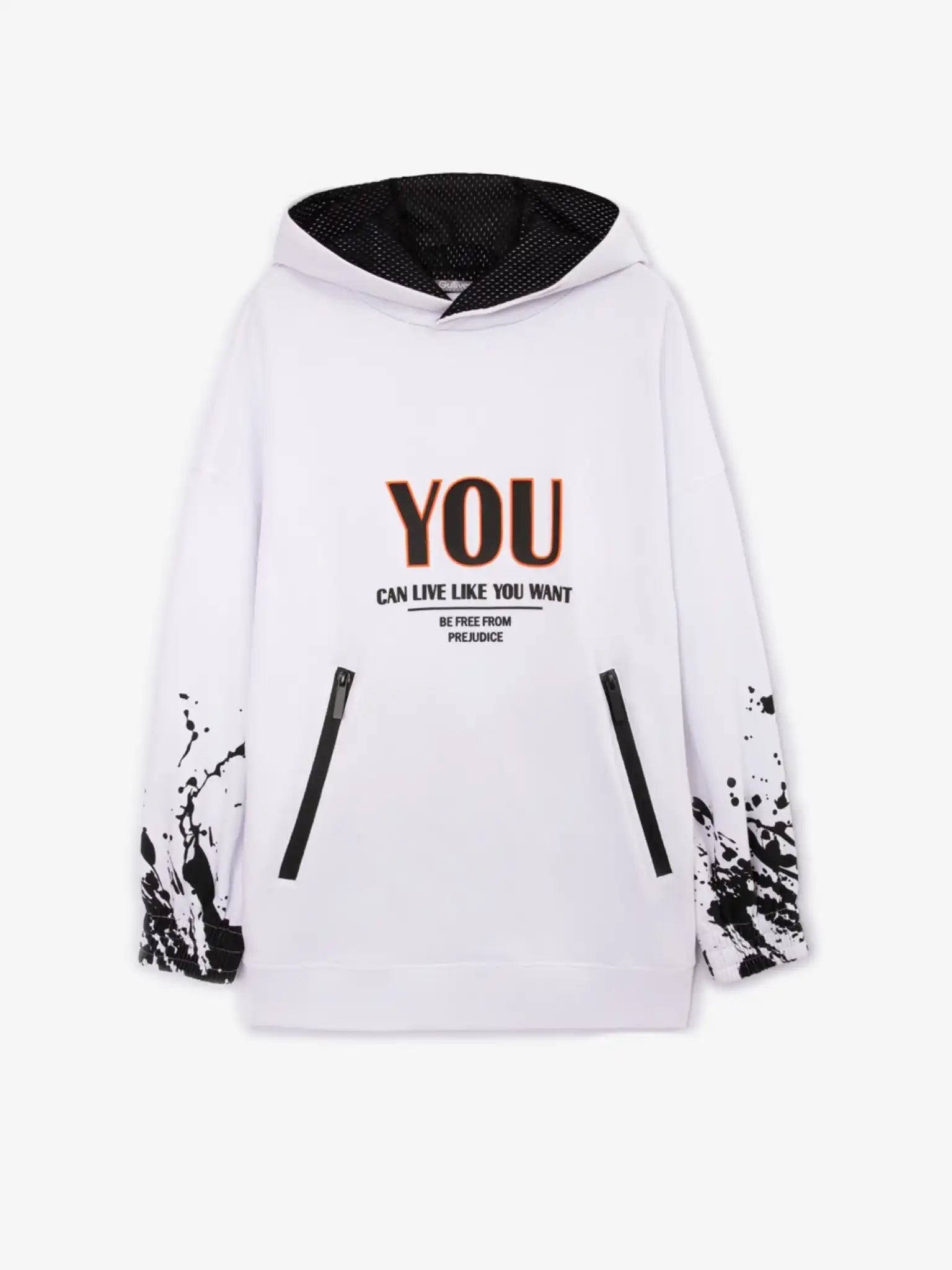 Hanoracul alb, lung și cu croială oversize, este piesa perfectă pentru a crea un look sportiv neconvențional! Designul se bazează pe accente contrastante: inscripții mari, fermoare negre pe buzunare, plase reflectorizante pe spate și stropi haotici pe mâneci. Toate aceste detalii conferă hanoracului un aer dinamic și modern. Acest model va atrage cu siguranță un băiat creativ, care caută combinația ideală între simplitate și originalitate.