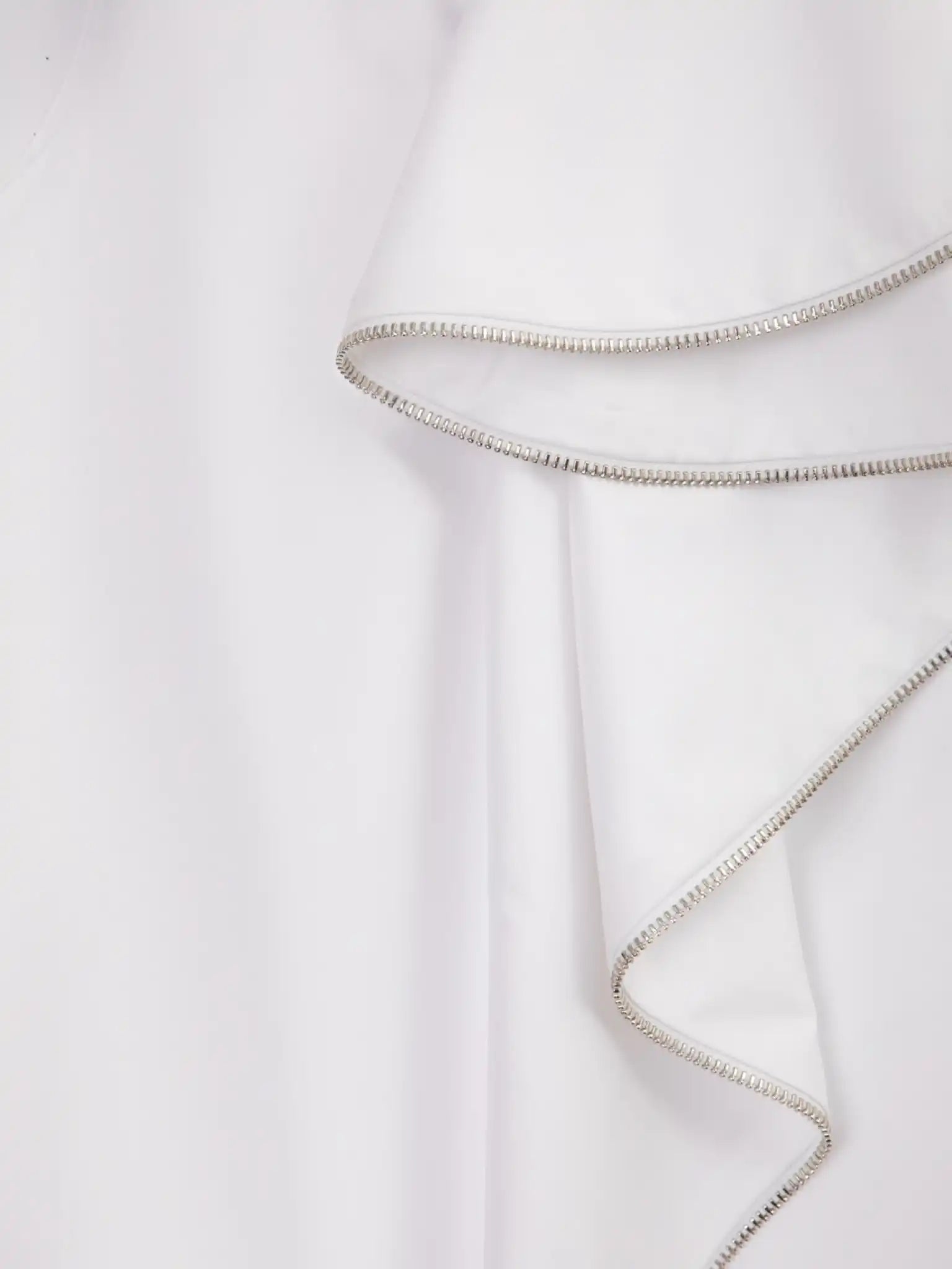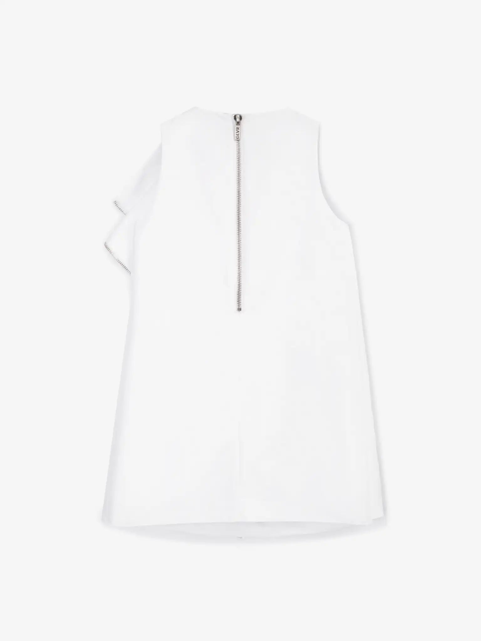 Rochia albă tip tunică este o alegere stilată și elegantă! Este confecționată dintr-un material textil neted, plăcut la atingere, cu un finisaj mat delicat. Elementul central al designului este croiala arhitecturală, inspirată din cele mai noi tendințe de design vestimentar. Un volan mare asimetric cu inserții suprapuse în zona gâtului, finisat cu o bandă cu dinți metalici argintii, face ca rochia să fie unică și chiar extravagantă. Acest detaliu este completat de un fermoar metalic accentuat pe spate, care servește atât ca element funcțional, cât și decorativ. Rochia are o căptușeală subțire din bumbac, oferind un contact tactil plăcut cu pielea fetiței.
