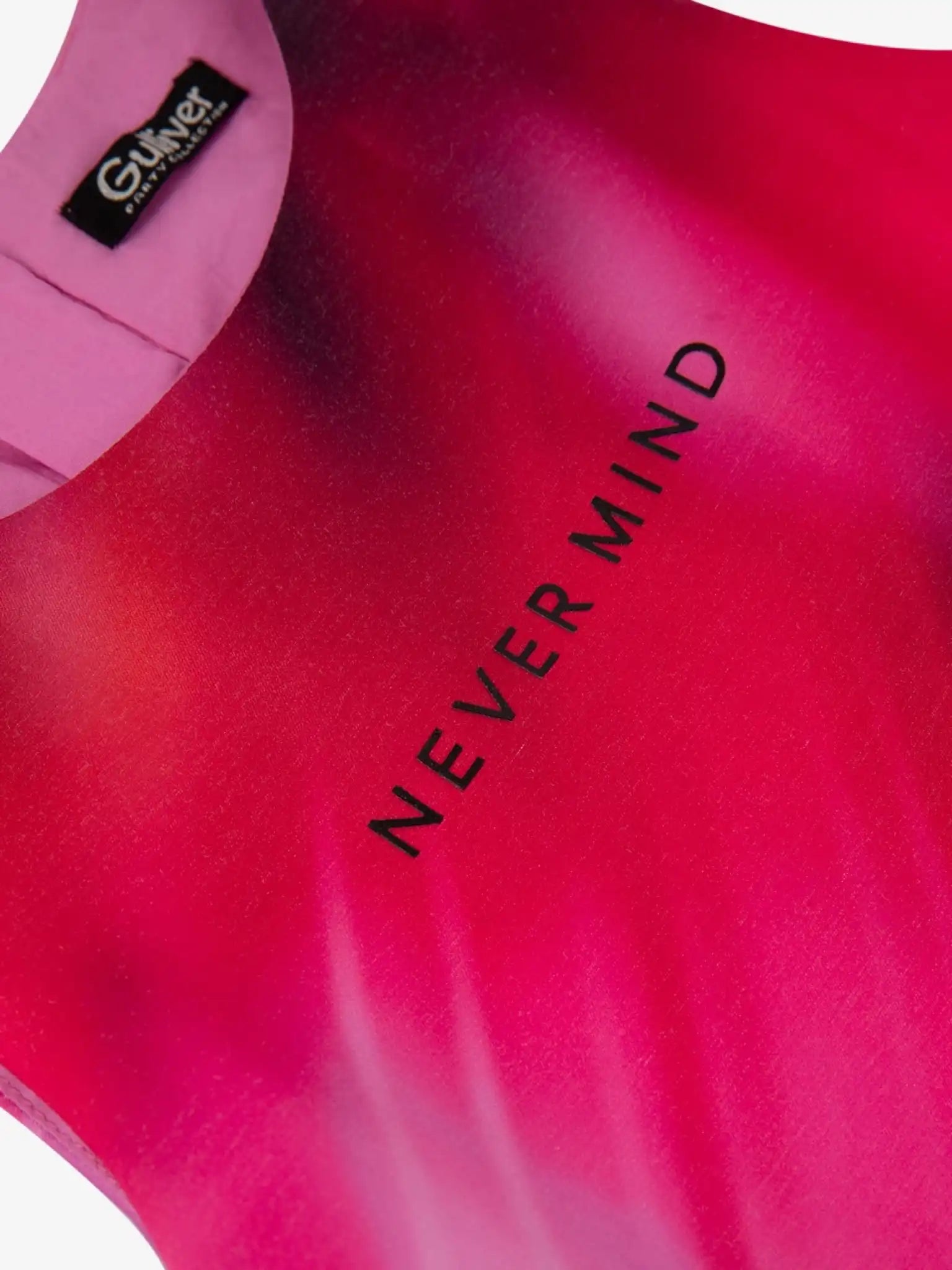 Rochia realizată din material textil din mătase densă, cu un conținut predominant de vâscoză, arată stilată, interesantă și proaspătă. Silueta trapezoidală a modelului, accentuată de un volan larg dublu și asimetric, creează un contur feminin delicat. Culoarea intensă și imprimeul abstract, inspirat dintr-o tendință a sezonului estival – efectul glitch (deplasare, estompare, distorsiune a imaginii) – fac ca rochia să fie vibrantă, neobișnuită și memorabilă. Designul include un imprimeu tipografic subtil, subliniind combinația originală dintre romantism și sport. Rochia se închide cu un fermoar ascuns pe spate. Căptușeala subțire din bumbac oferă un contact plăcut cu pielea copilului.