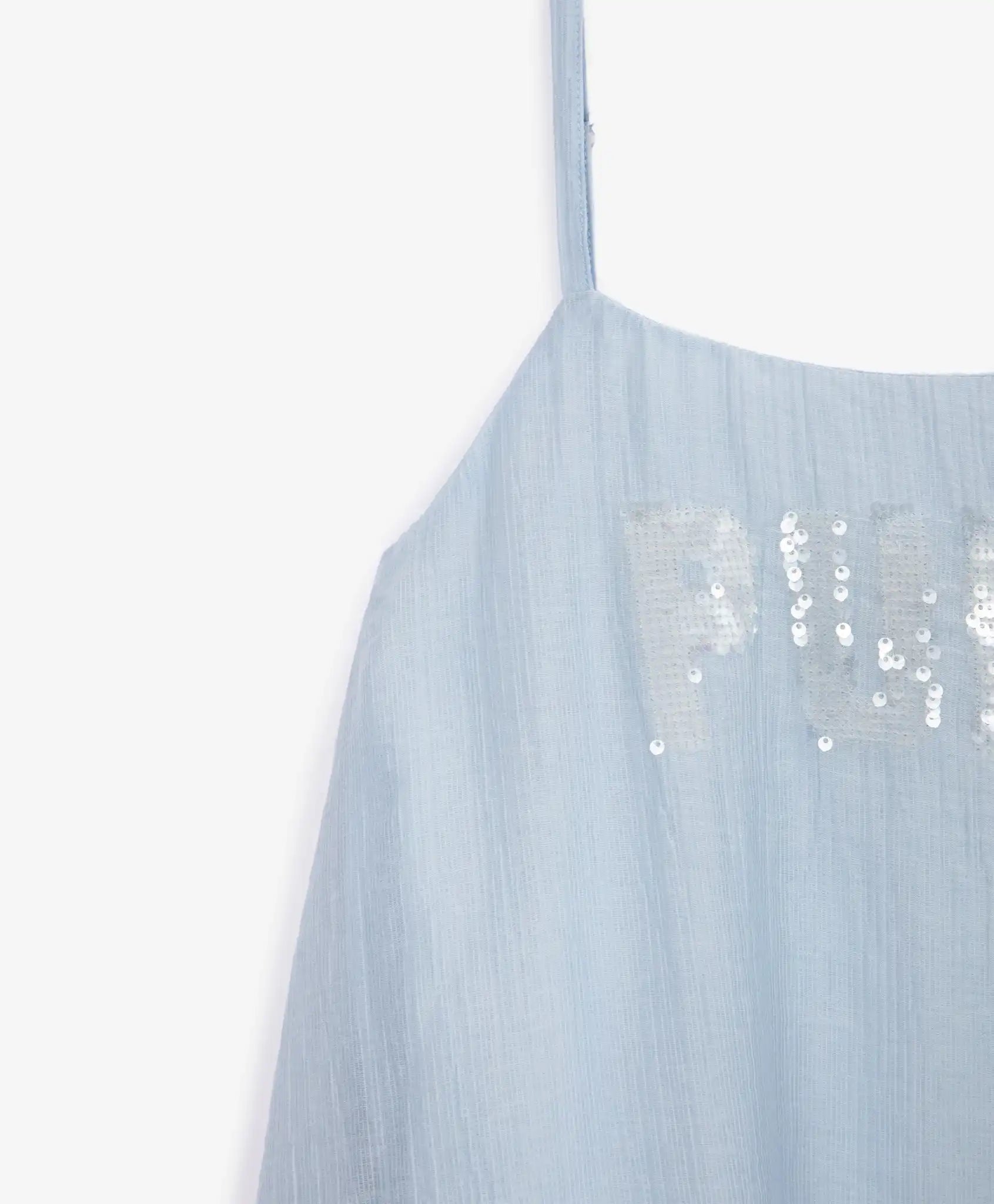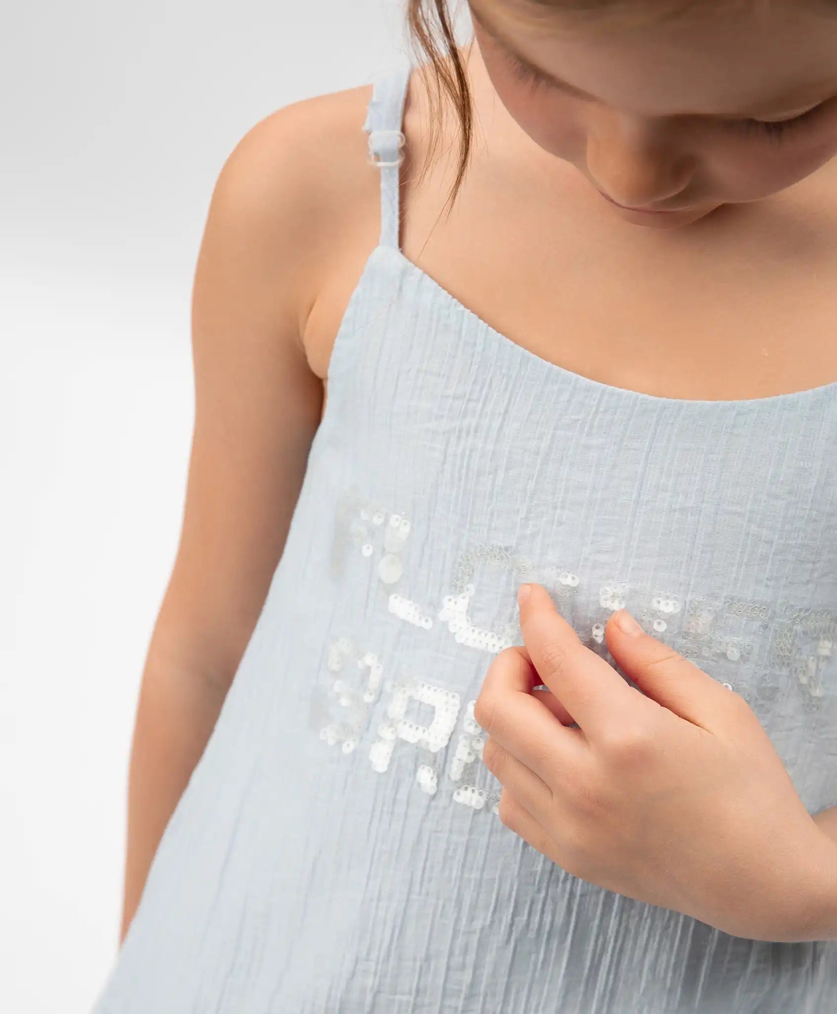 O zi toridă de vară, miros de iarbă proaspăt cosită și un cer albastru limpede – această atmosferă este creată de acest sarafan! Modelul cu siluetă în A este confecționat din vâscoză semi-transparentă, diafană, cu un luciu perlat nobil. Materialul ușor este extrem de plăcut la atingere, respirabil și absorbant. Căptușeala din bumbac subțire previne transparența. Sarafanul dispune de bretele reglabile și este decorat cu un motiv tipografic delicat din paiete translucide și strălucitoare.