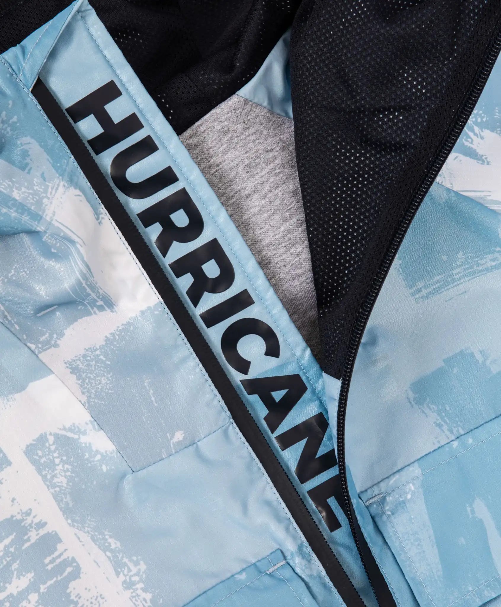 Jachetă de vânt cu imprimeu original în nuanțe alb-albastru – creată pentru activități în aer liber în orice condiții meteorologice. Gluga integrată cu guler înalt, materialul hidrofug și fermoarul rezistent la apă asigură protecție împotriva ploii. Mâneca raglan oferă un contur rotunjit, garantând libertate de mișcare. Un element de design remarcabil este imprimeul tipografic de pe banda interioară anti-vânt, vizibil doar atunci când jacheta este desfăcută sau parțial închisă, dar care adaugă un aer sportiv modelului. Această temă sportivă este subliniată de buzunarele mari, fermoarul contrastant, căptușeala din plasă albastră a glugii și chevronul decorativ de pe mânecă. Căptușeala tricotată contribuie la confortul purtării.