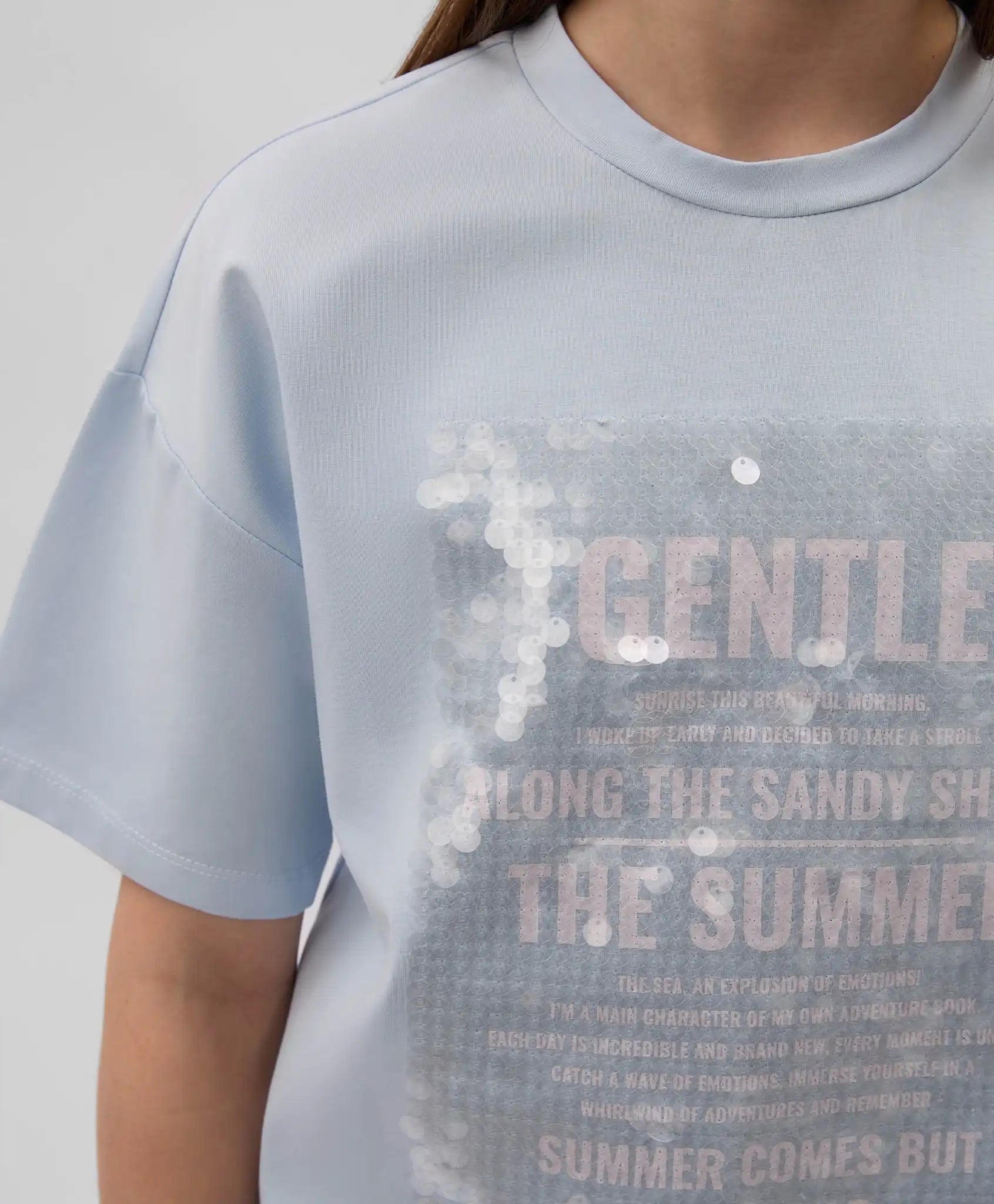 Tricou oversize pentru fată cu decorațiune din paiete transparente, albastru, Gulliver