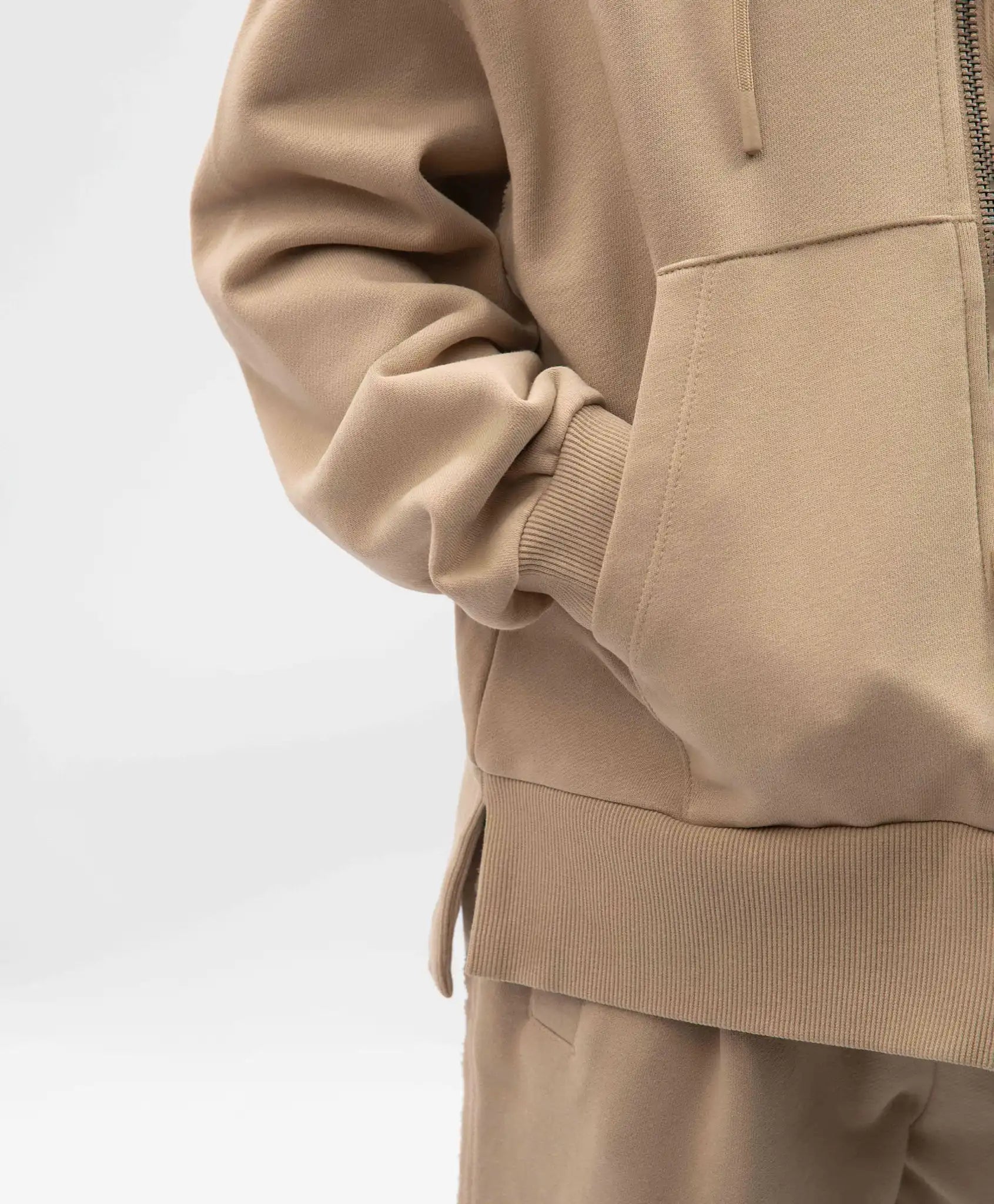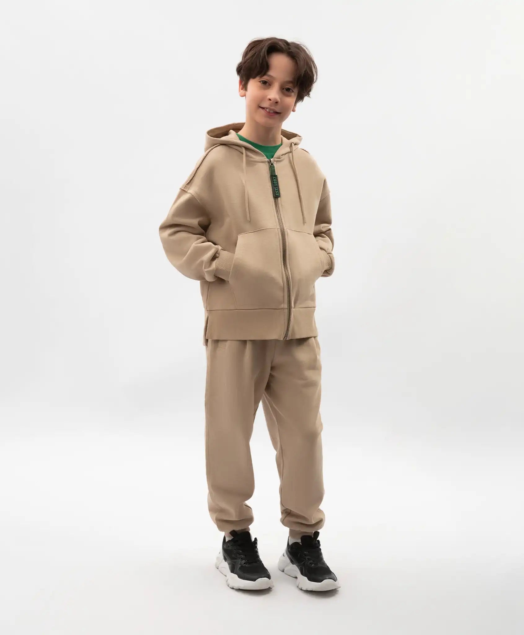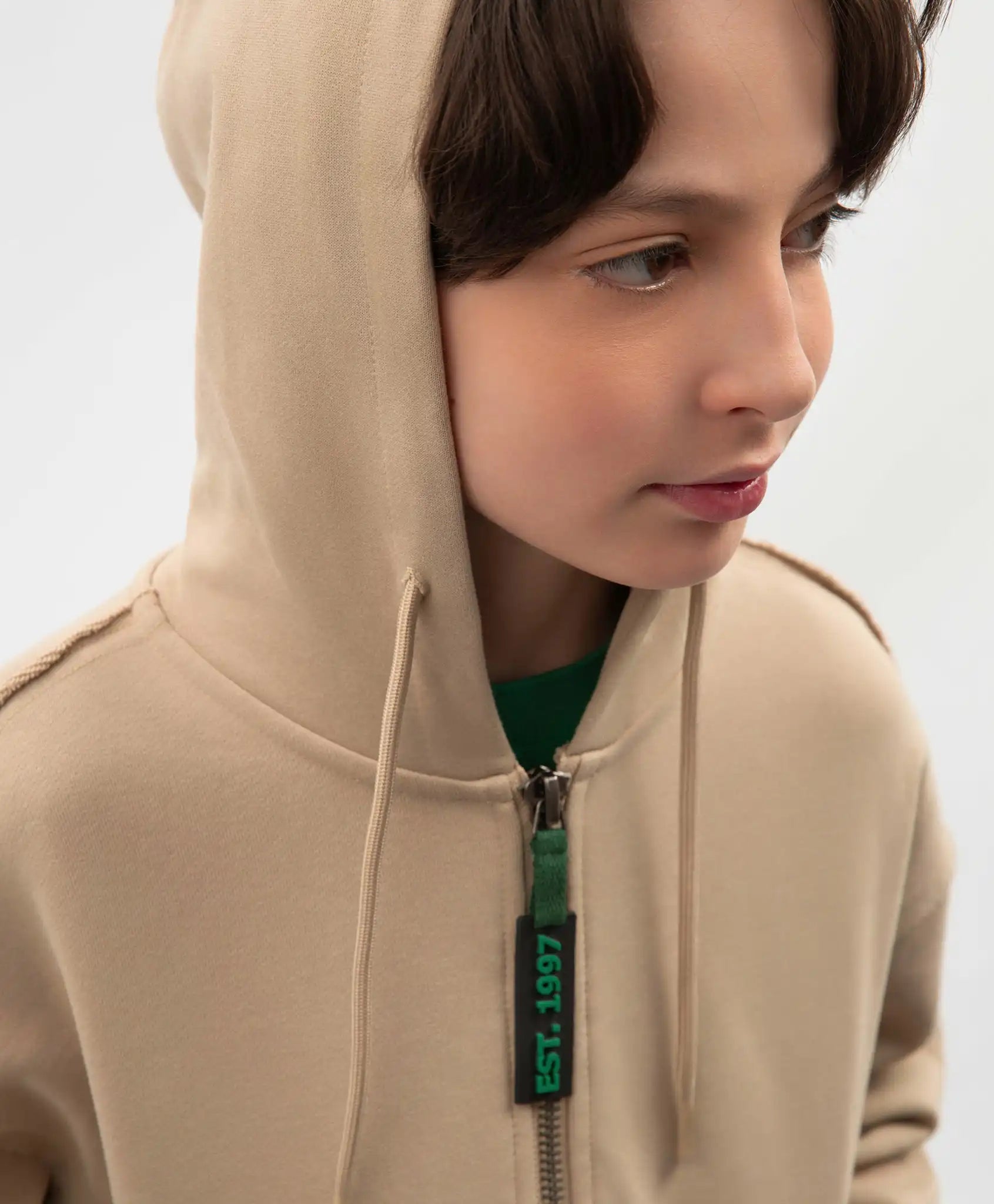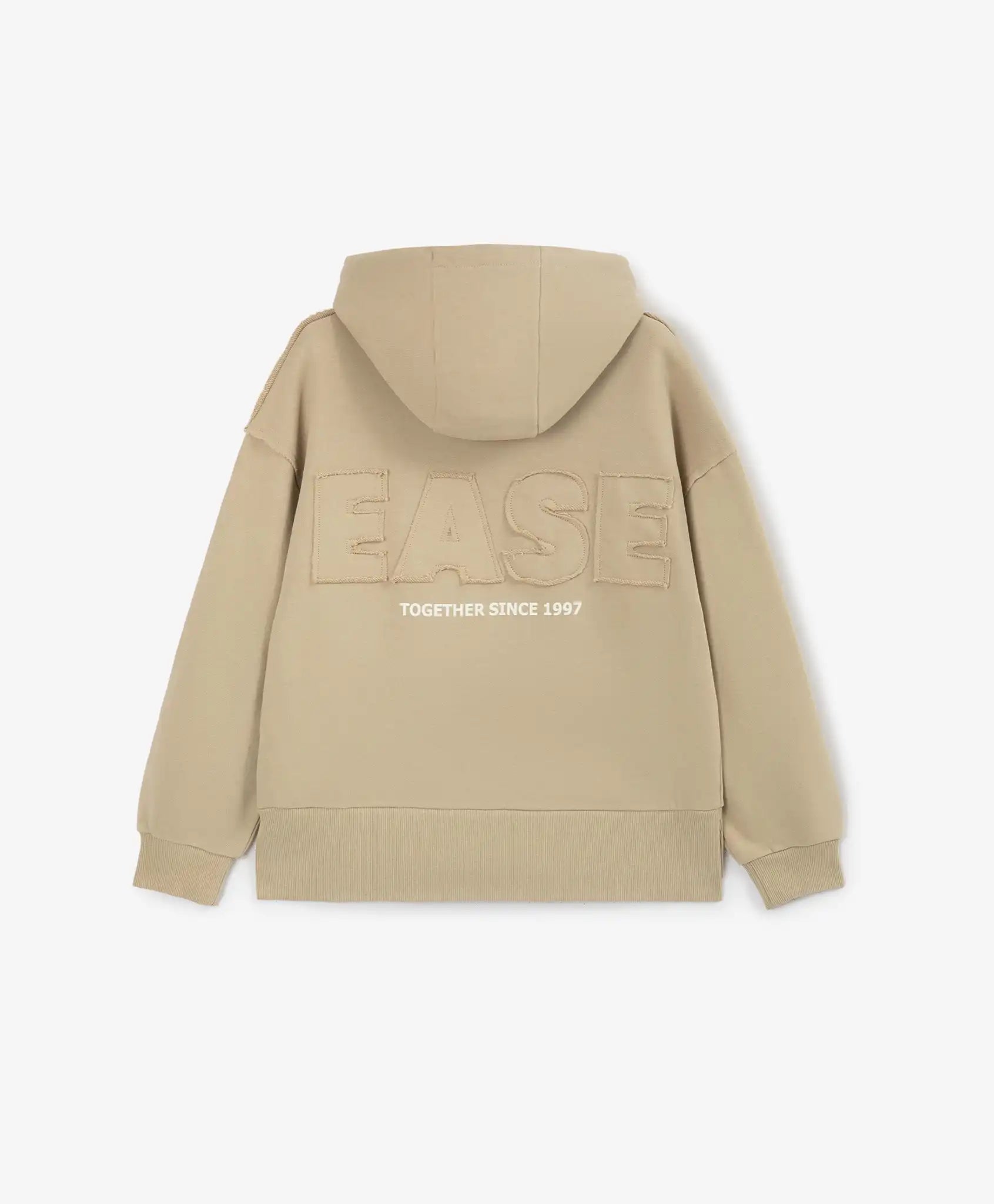 Hanoracul bej cu fermoar și glugă este creat pentru ținute relaxate și casual. Realizat din material fleece cu spate alungit și tăieturi laterale, își păstrează perfect forma, este plăcut la atingere și ușor de întreținut. Designul său este inspirat din stilul grunge, având detalii caracteristice precum imprimeu uzat și aplicații cu margini expuse. Hanoracul se închide cu un fermoar cu tragător branduit, iar cele două buzunare mari de tip „kangaroo” adaugă un plus de funcționalitate modelului.