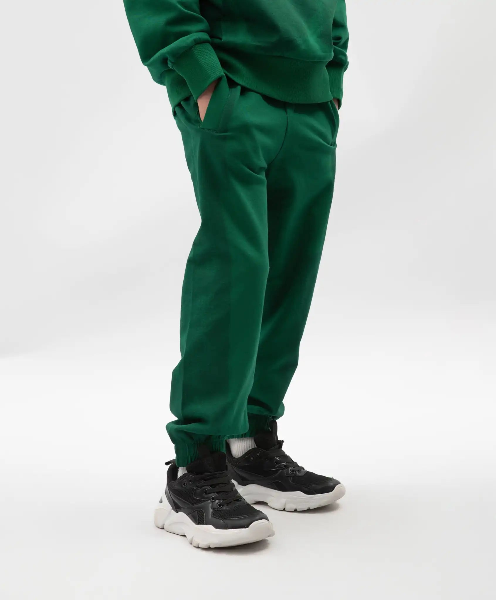 Joggerii verzi din fleece moale și durabil sunt un accent vibrant care evidențiază individualitatea adolescentului. Caracteristica distinctivă a modelului este imprimeul ton-pe-ton, care oferă pantalonilor un aspect îndrăzneț și dinamic. Centura elastică este întărită cu șireturi, asigurând confort pentru băieți cu diferite tipuri de constituție.
