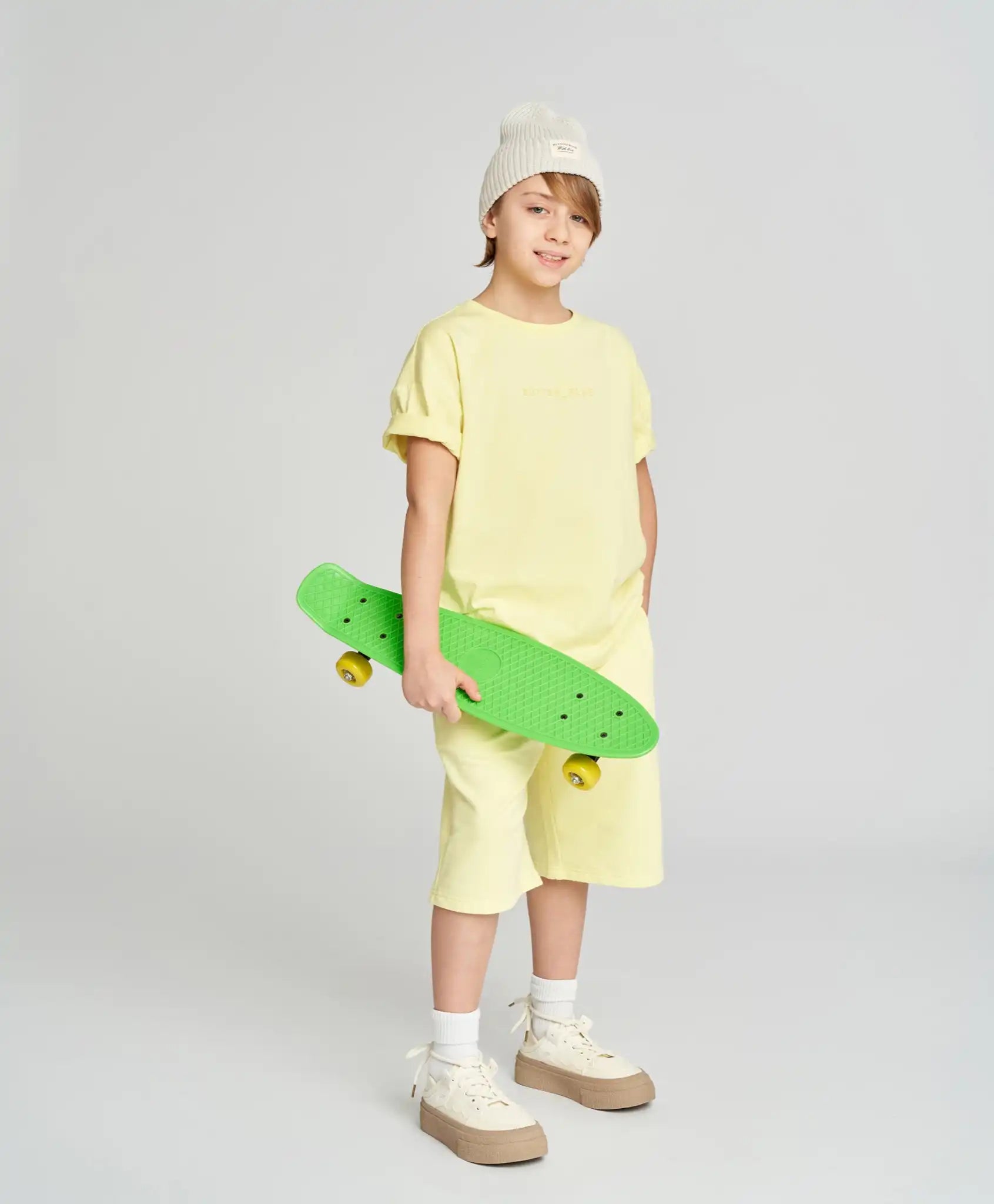 Tricoul galben cu mânecă scurtă este potrivit atât pentru băieți, cât și pentru fete. Materialul moale din tricotaj este ideal pentru pielea sensibilă a copiilor, iar croiala dreaptă, fără ajustare pe corp, nu limitează mișcarea. Tricoul de vară este răcoros, dar în același timp dens și rezistent la uzură, nu este transparent și permite pielii să respire. Decolteul rotund asigură confort, făcând îmbrăcarea și dezbrăcarea ușoară. Tricoul monocrom într-o nuanță strălucitoare de citrin se potrivește cu diverse stiluri. Imprimeul din cauciuc adaugă textură, rămânând însă discret. Modelul poate fi purtat pe tot parcursul anului – singur vara și ca prim strat în zilele mai reci.