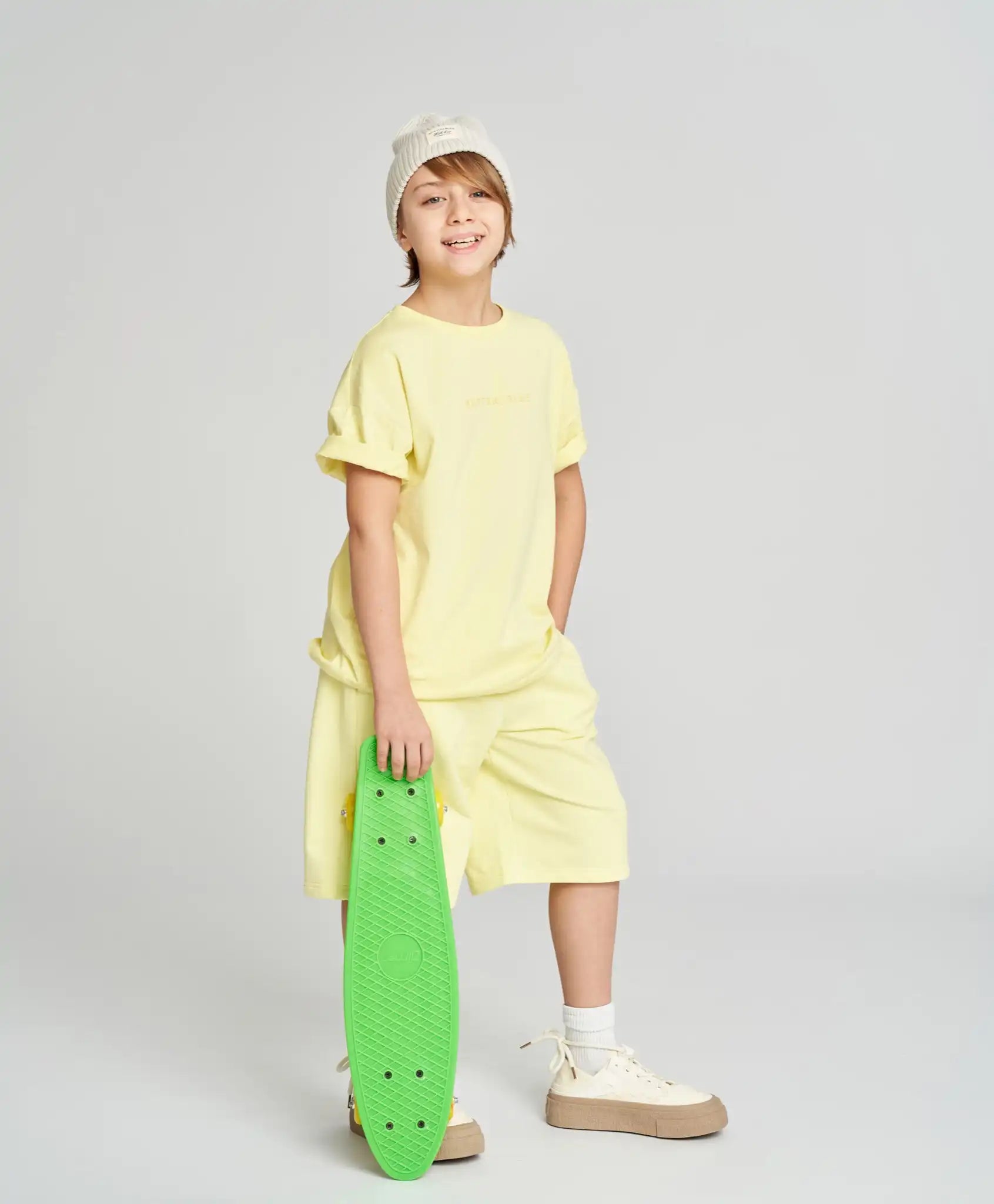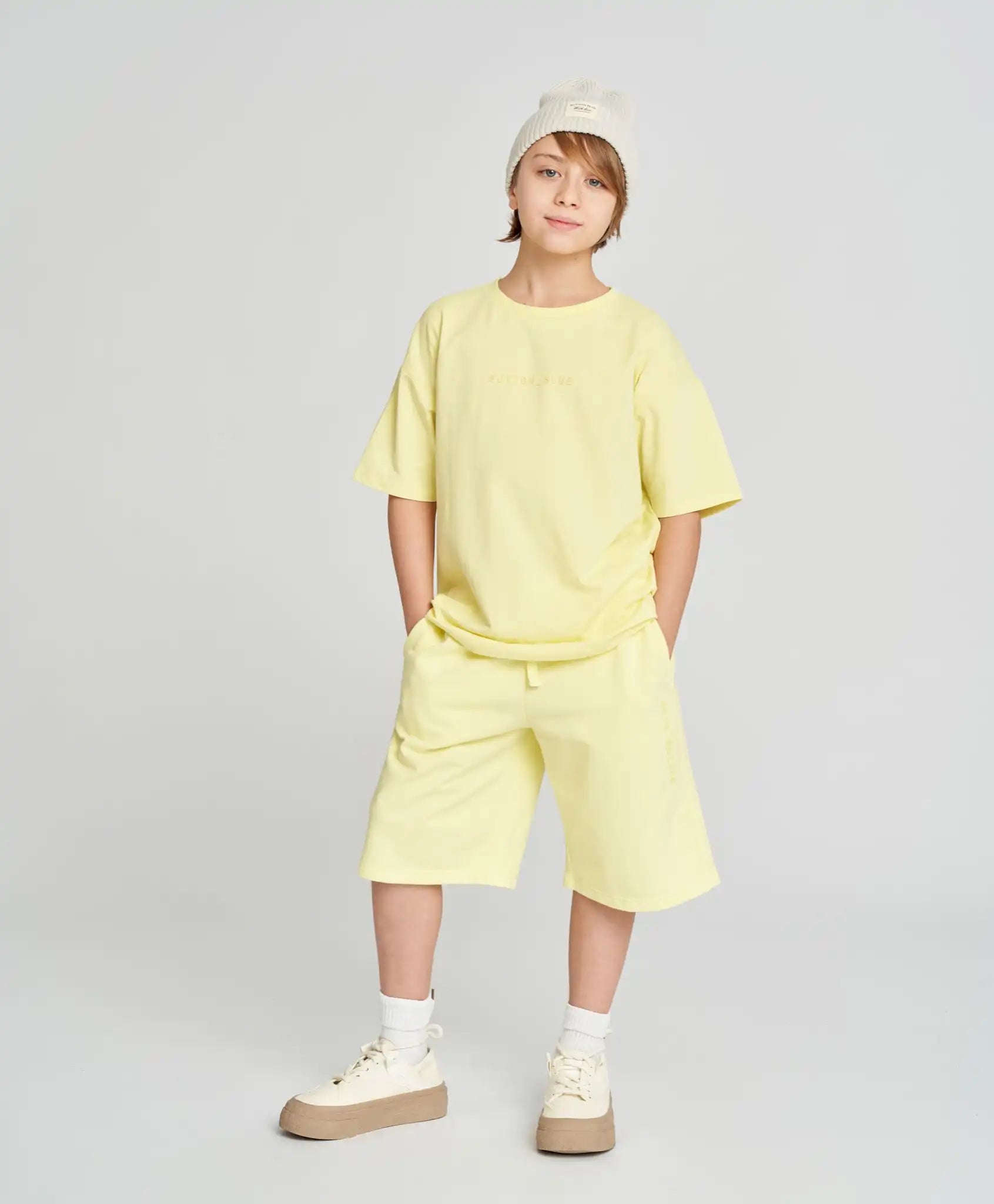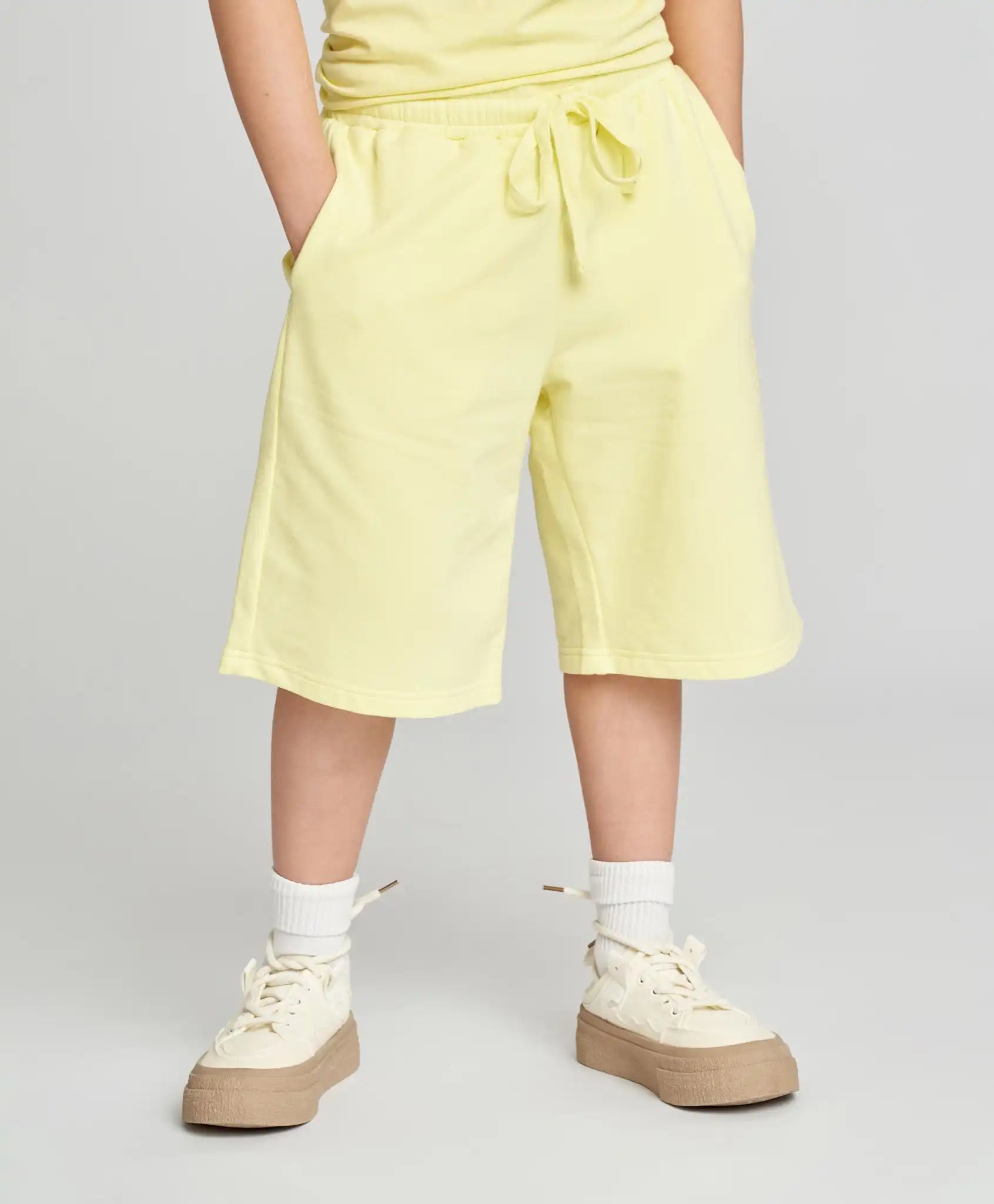 Șorturile de bază pentru băieți și fete sunt universale – potrivite pentru orice copil, indiferent de conformație. Modelul este rezistent, realizat din French Terry cu interior buclat. Țesătura mixtă, cu bumbac în compoziție, le face netede, plăcute la atingere și respirabile. Talia elastică cu șnur asigură o potrivire perfectă, iar croiala dreaptă le oferă libertate de mișcare. Dispun de două buzunare. Lungimea acestora ajunge până la genunchi. Șorturile galbene aprinse, în nuanța citrin, completează perfect ținutele pentru plimbări, călătorii și purtare zilnică. Modelul este monocromatic, cu un branding cauciucat discret.
