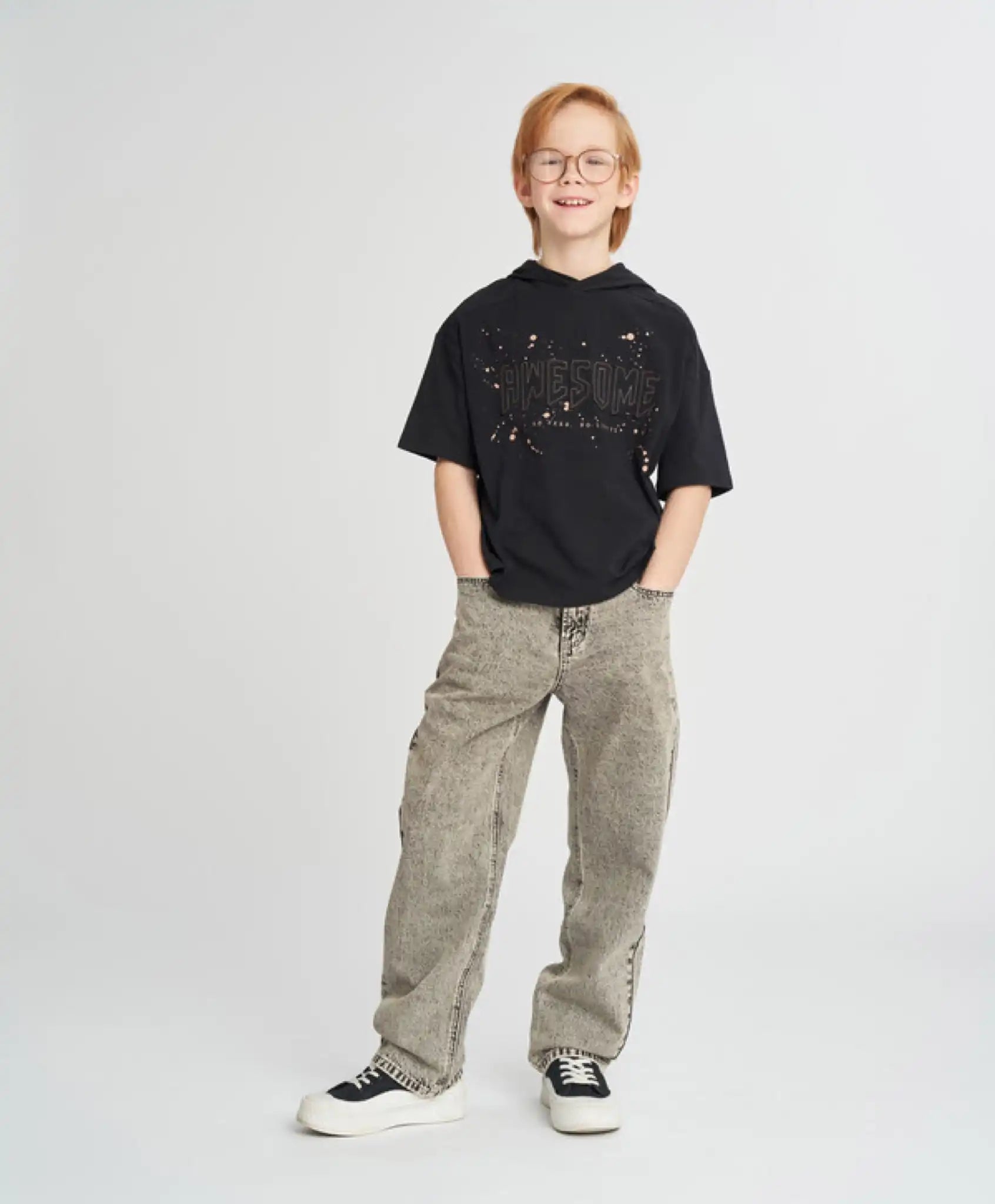 Tricoul negru pentru băieți este confecționat dintr-un material jersey din bumbac. Modelul este neted, respirabil și plăcut la atingere. Tricoul oversize pentru adolescenți, cu mânecă scurtă și umeri căzuți, oferă un aspect relaxat, ideal pentru un copil activ. Modelul în negru clasic se combină ușor cu garderoba de zi cu zi, sportivă sau de casă. Accentul modern al tricoului este dat de un imprimeu tipografic uzat, un efect de decolorare sau spălare și o imitație de buzunar pe piept.
