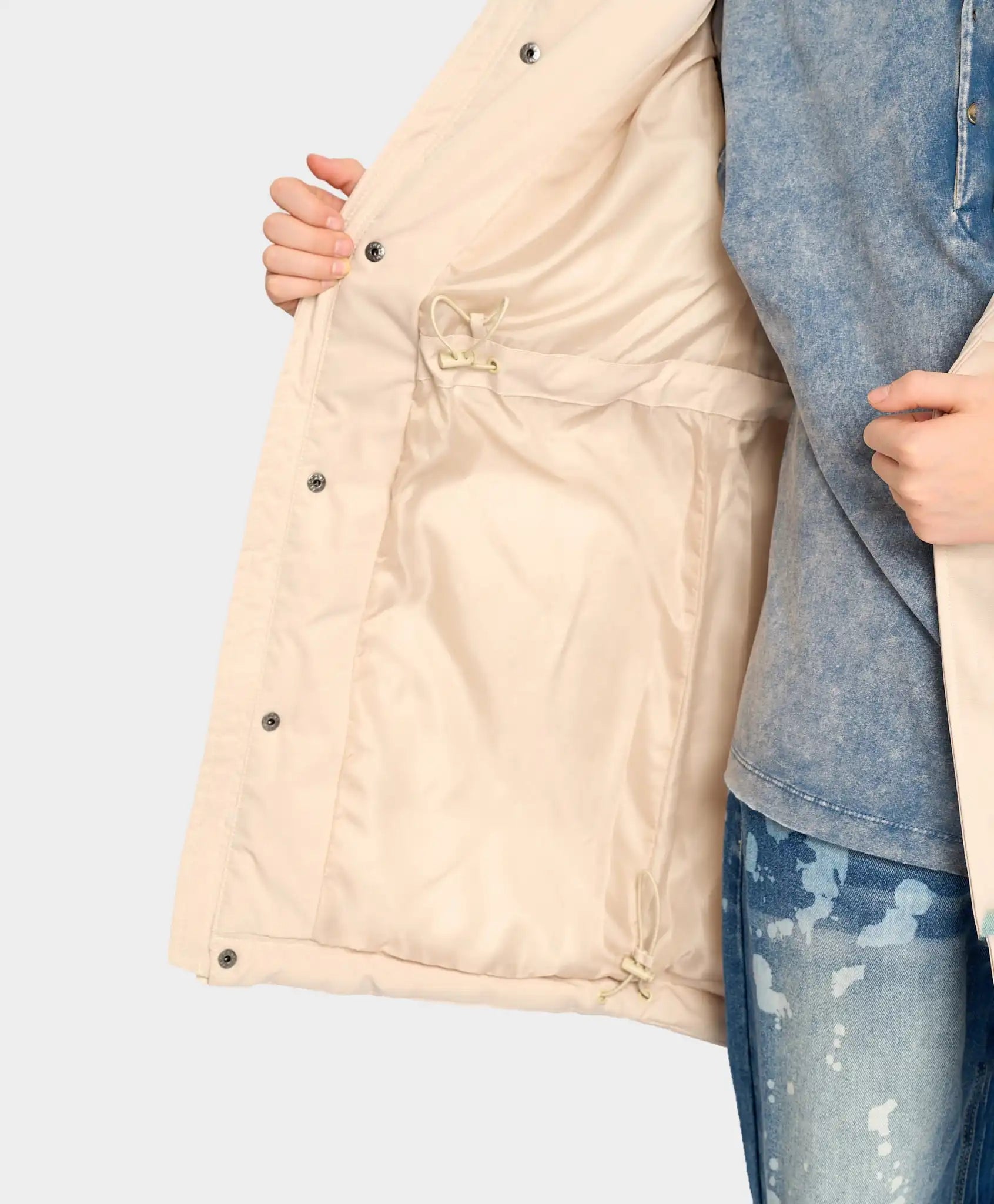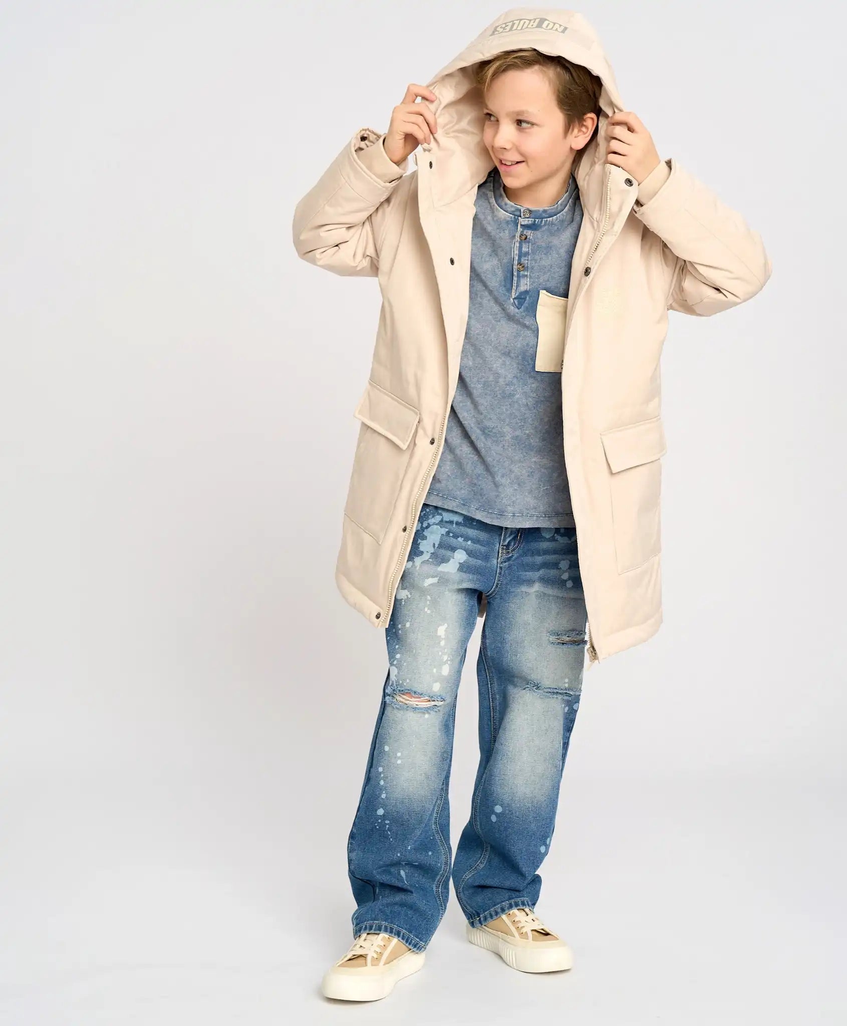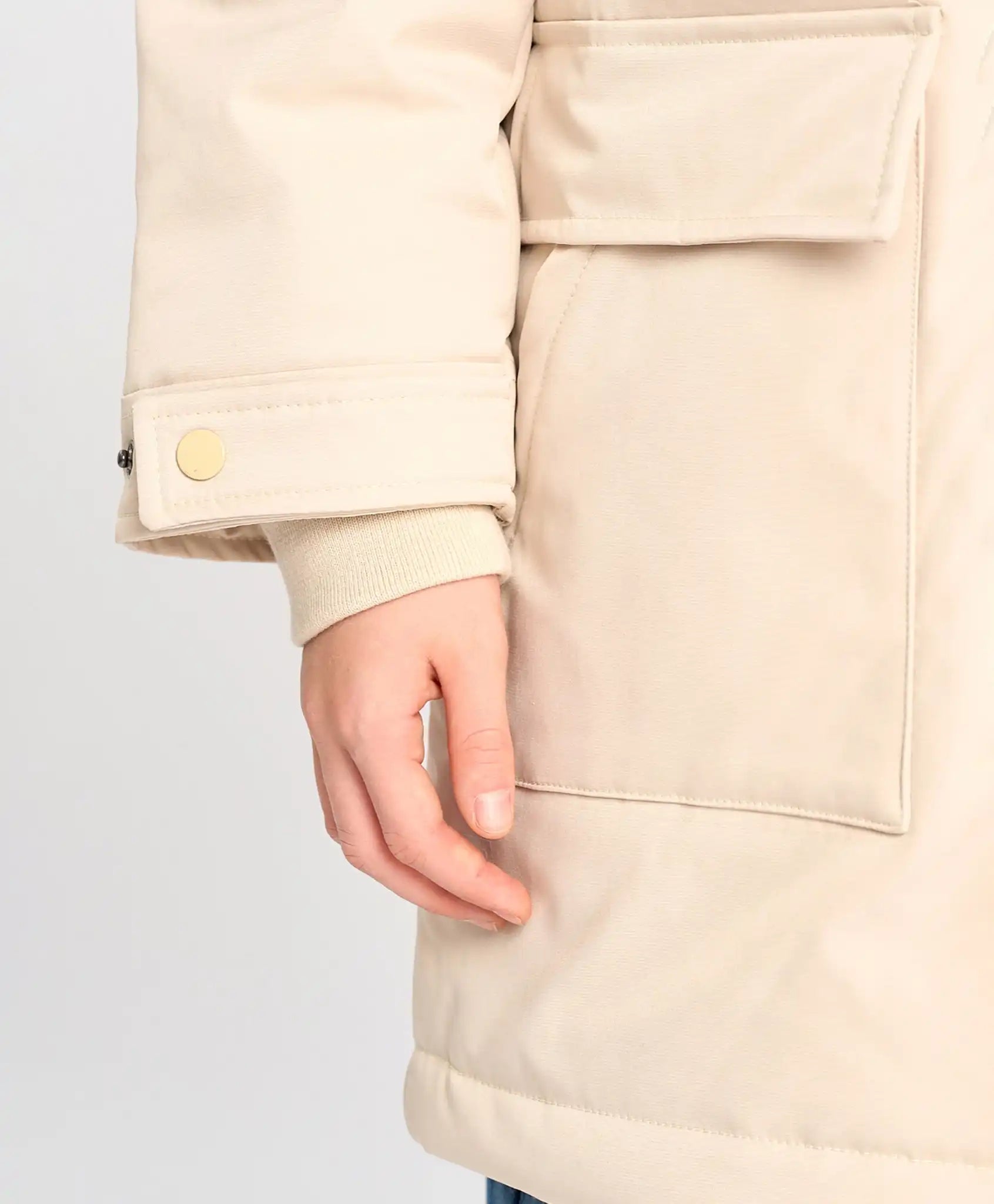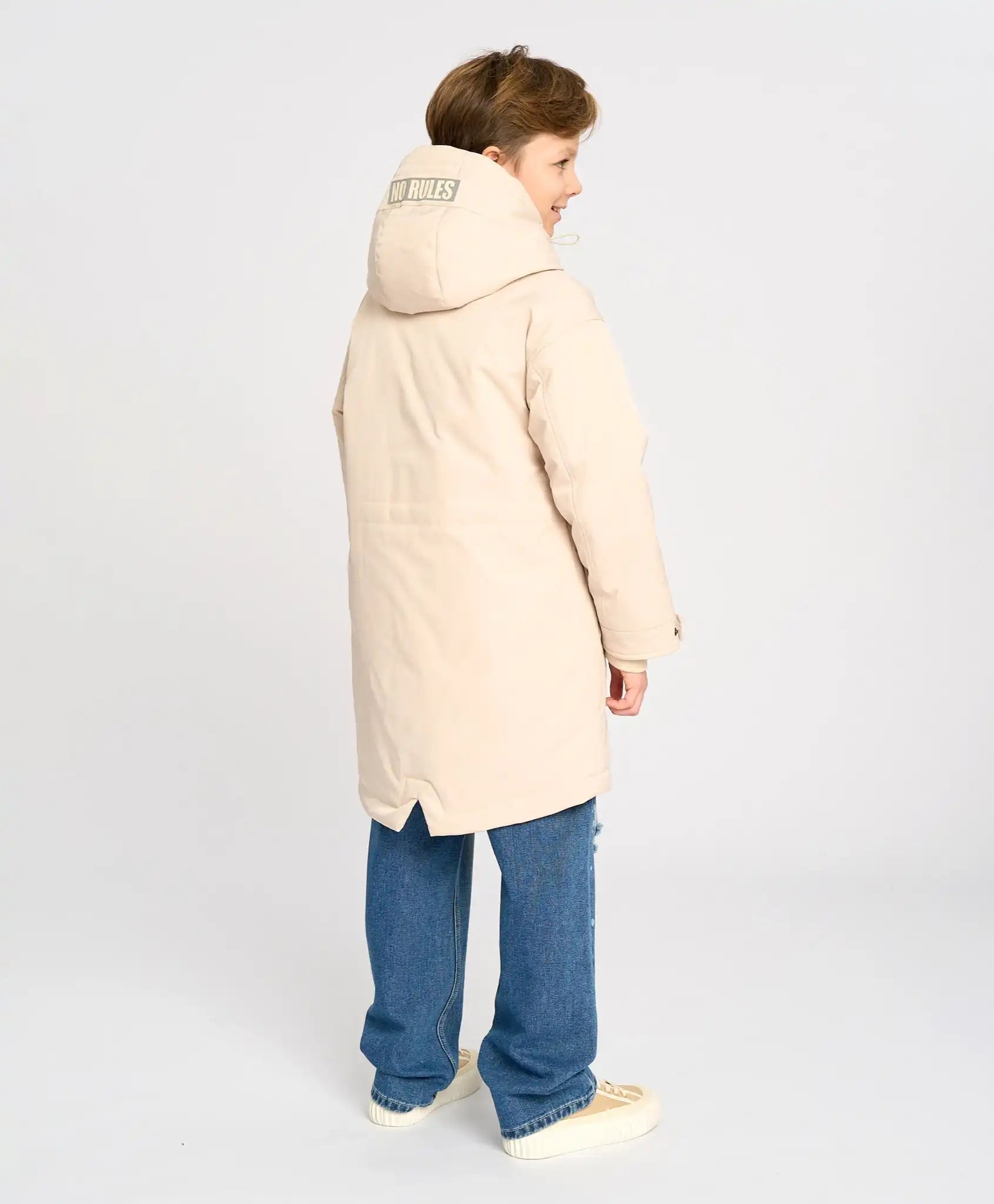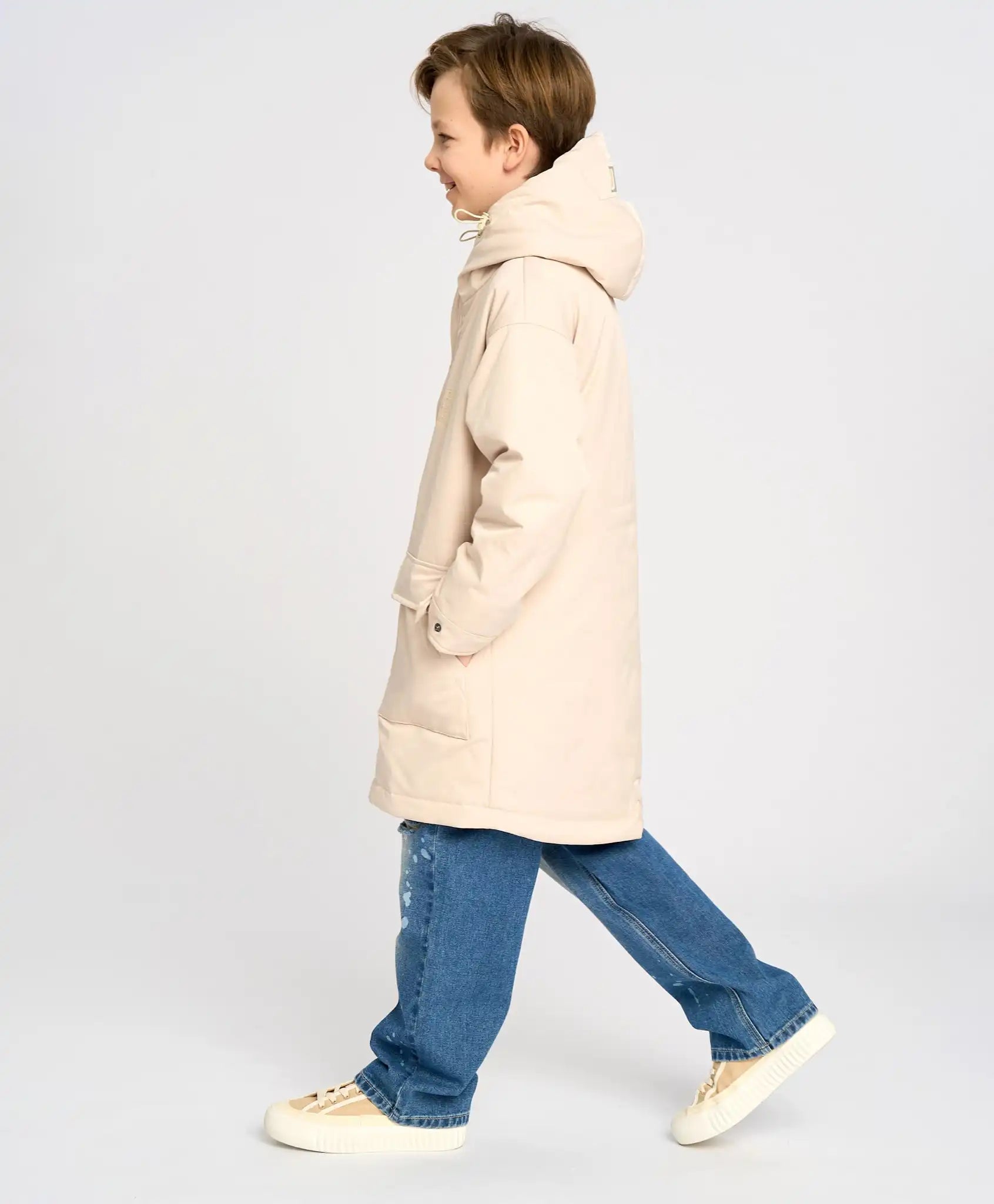 Parka pentru copii, confecționată din material impermeabil cu căptușeală textilă și izolație din sintetic de 100 g/m². Copilul va rămâne cald chiar și la +10°C. Gluga adâncă cu șnururi pentru ajustare și protecția anti-vânt previn pătrunderea vântului. Palton cu fermoar protejat pentru bărbie, mansete ribbed cu posibilitatea de reglare a lățimii cu nasturi. Croiala prelungită păstrează căldura, putând fi ajustată la partea inferioară și la talie. Buzunarele oferă spațiu pentru depozitarea obiectelor mici și pentru încălzirea mâinilor. Parka pentru adolescenți cu croială dreaptă nu limitează mișcările, iar nuanța „plajă de nisip” cu imprimeuri cauciucate arată stilat și modern. Elemente reflectorizante și un loc pentru informații de contact sunt adăugate pentru siguranță.