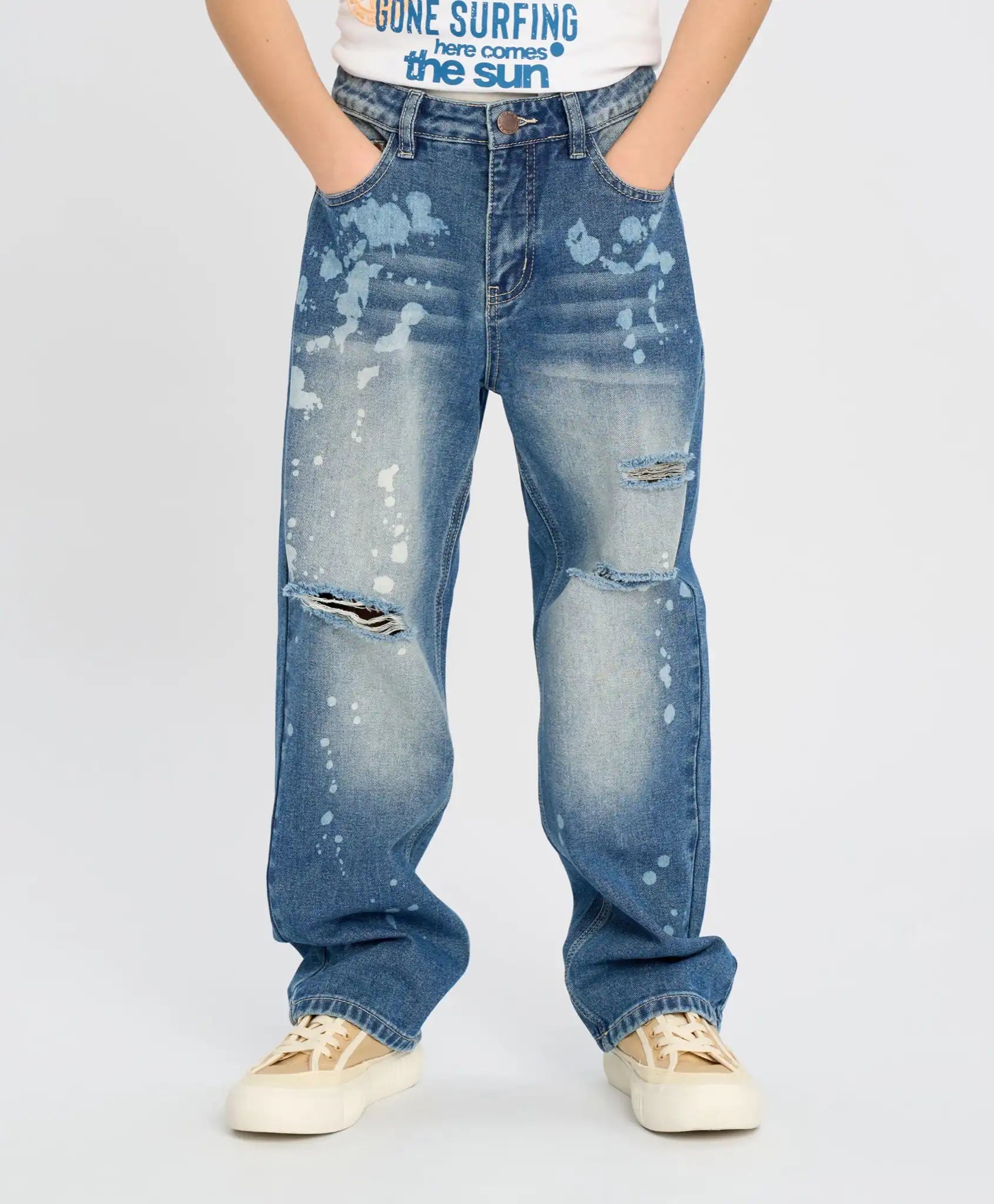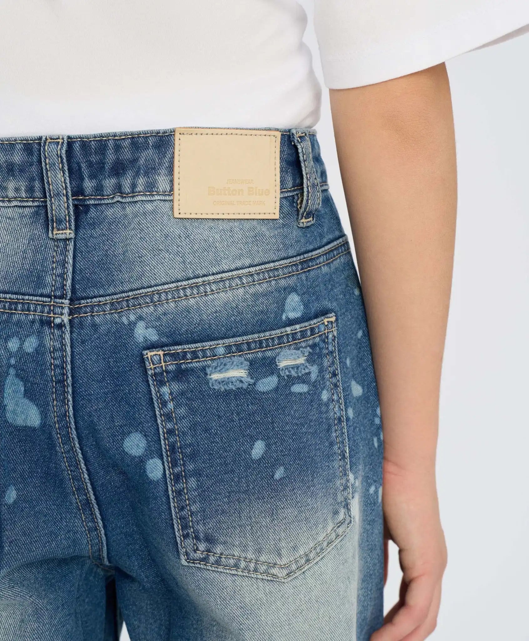 Blugi drepți pentru copii, model mom, albaștri, cu uzură, Button Blue