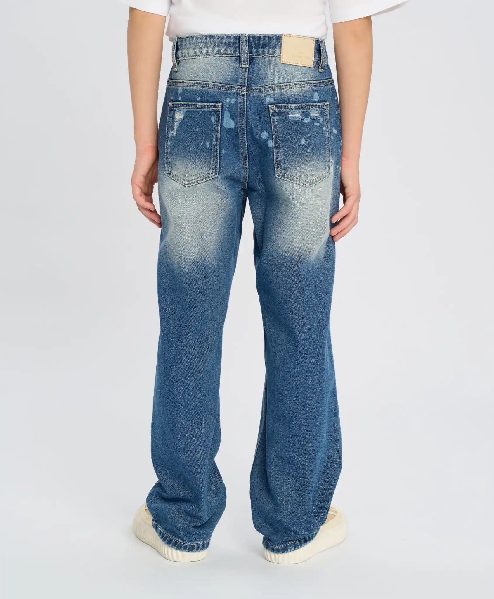 Blugii drepți pentru băieți și fete sunt universali și confortabili – potriviți pentru orice tip de siluetă. Confecționați din bumbac, sunt respirabili, dar și rezistenți. Se închid cu nasture și fermoar, au o bandă elastică interioară pentru reglarea taliei și găici pentru curea. Blugii albaștri pentru copii sunt într-o nuanță clasică, cu efect de prespălare și decolorare. Tăieturile din zona genunchilor le oferă un aspect modern. În plus, sunt comozi – se mulează bine pe talie, sunt lejeri pe întreaga lungime și ușor conici spre gleznă. Au două buzunare frontale și două la spate. Acest model este o alegere excelentă pentru viața de zi cu zi, plimbări, vizite, întâlniri cu prietenii și ocazii festive.