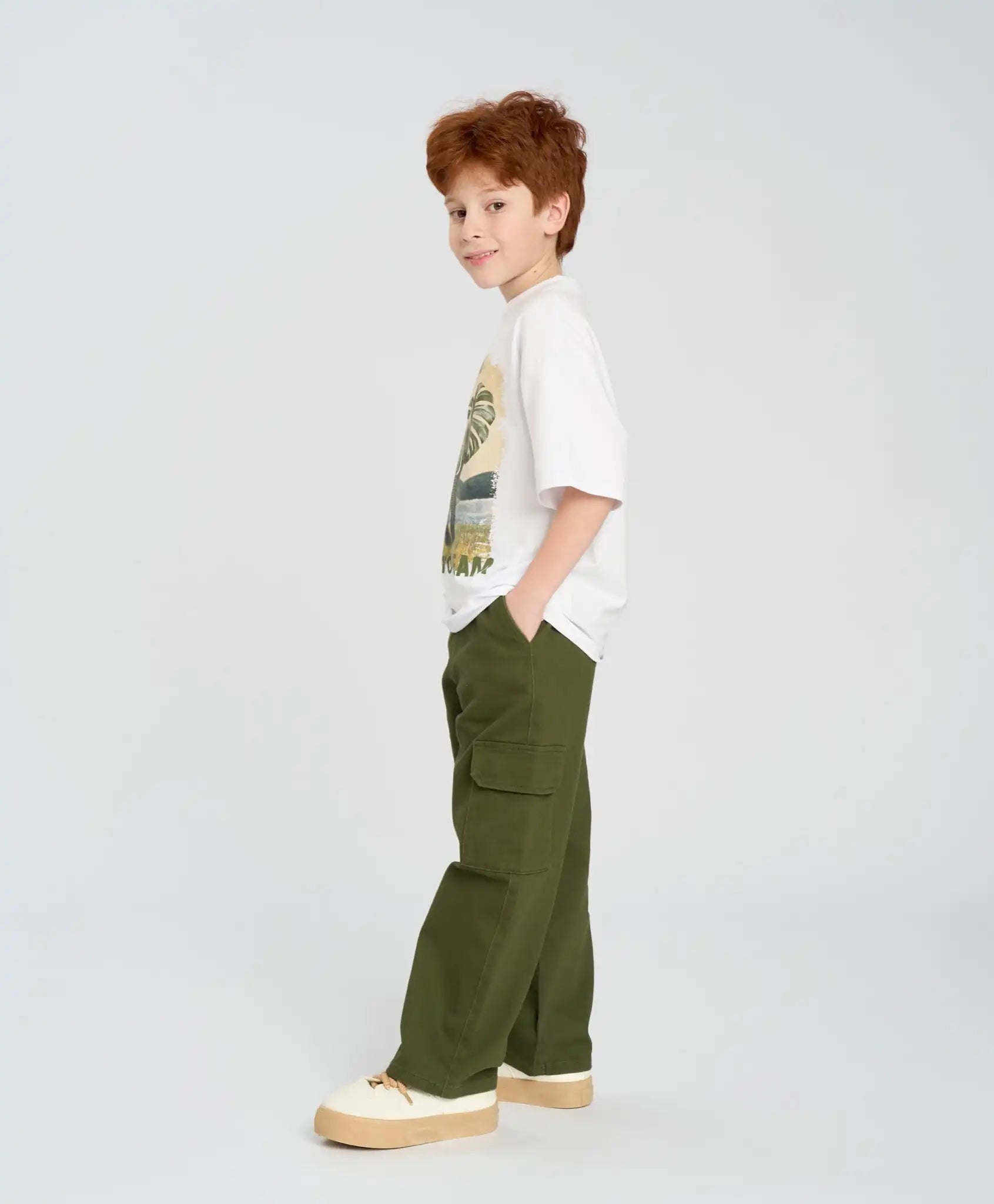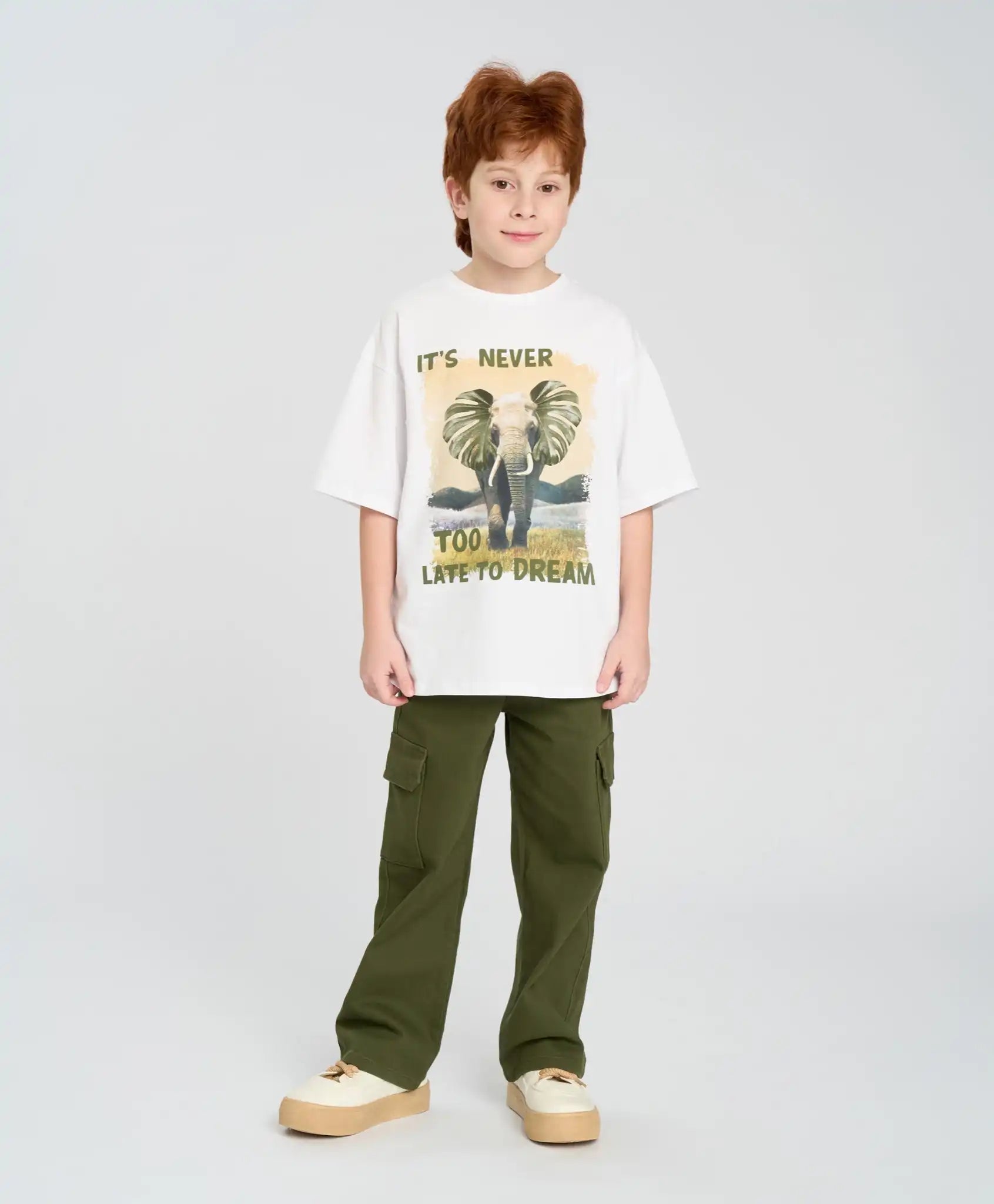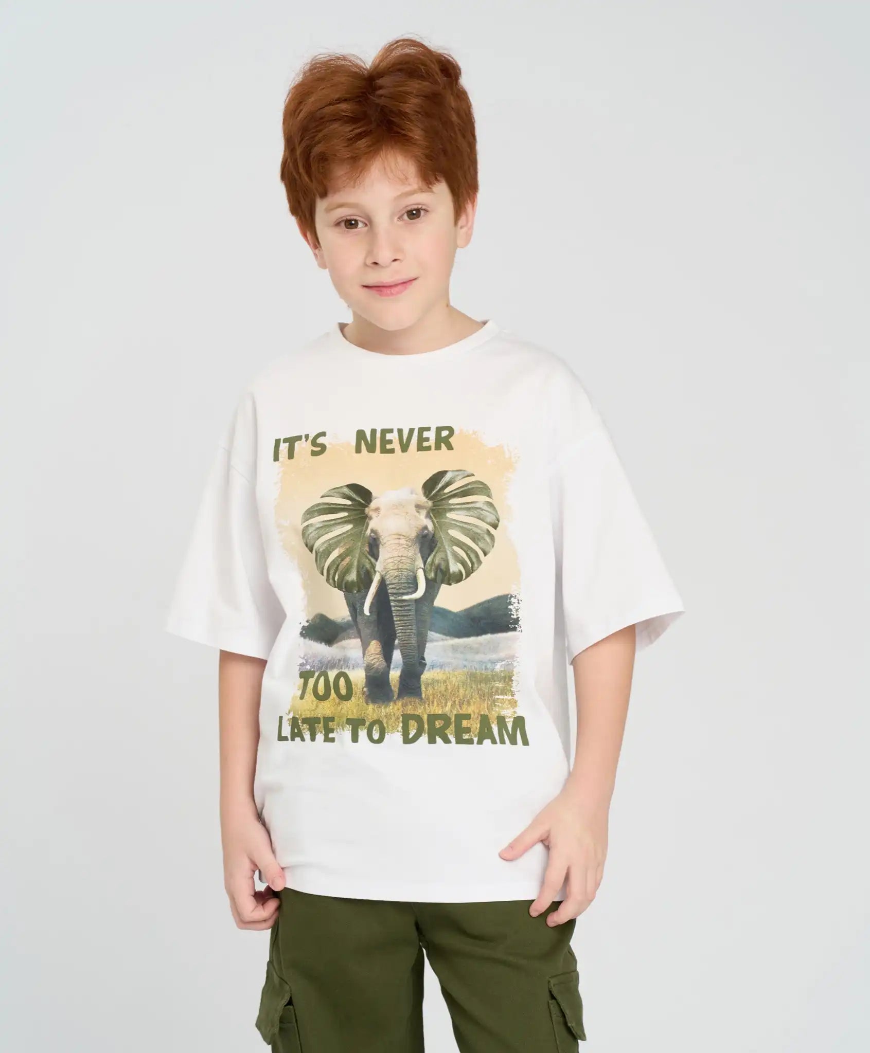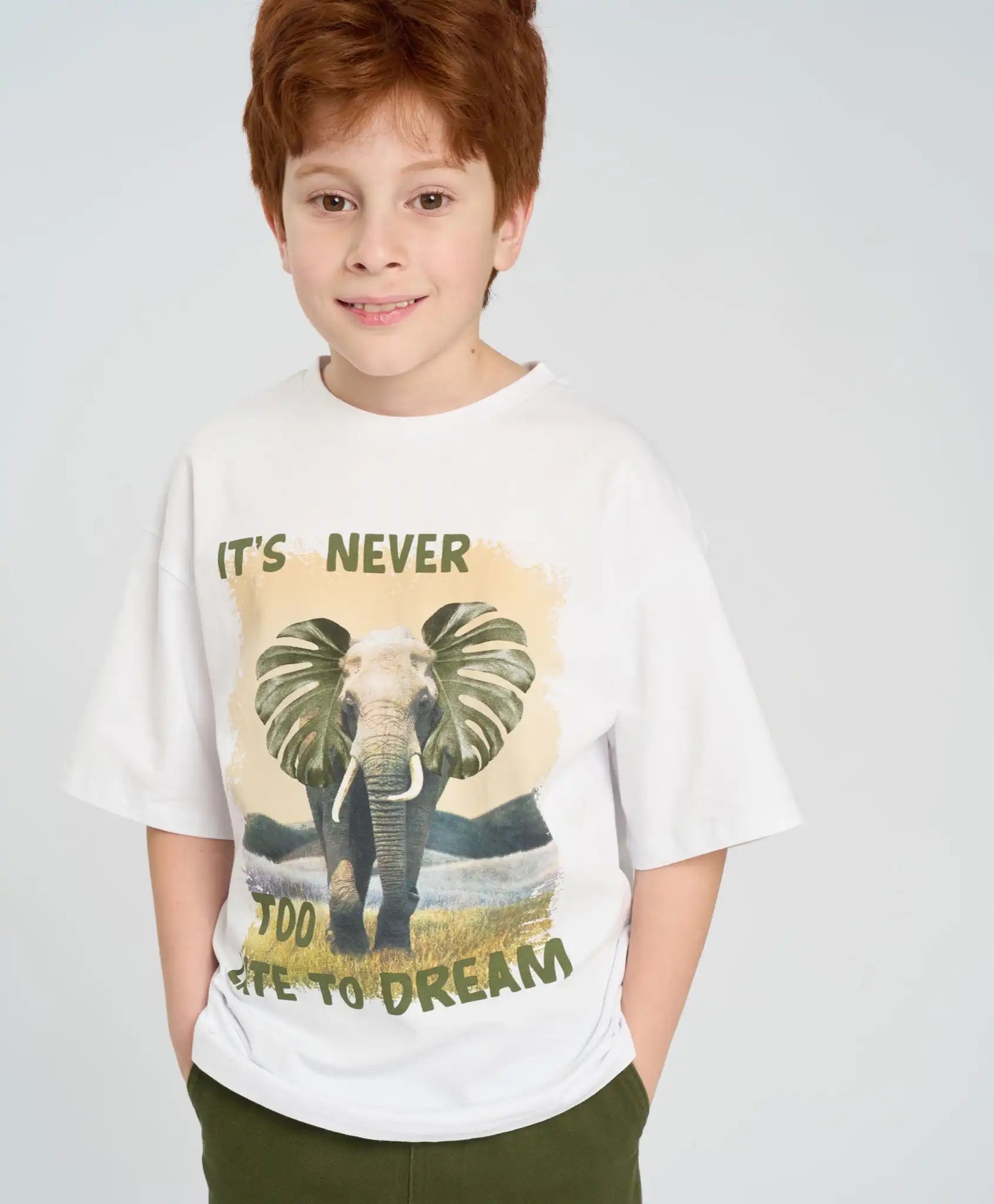 Tricoul alb oversize cu mânecă scurtă pentru băieți este confecționat din material jersey mixt cu bază din bumbac, ceea ce îl face neted, moale, respirabil și plăcut pentru piele. Linia căzută a umerilor și croiala lejeră oferă confort pentru băieții activi. Tricoul de vară are mâneci de lungime optimă – până la cot. Culoarea albă îl face ușor de combinat cu orice tip de îmbrăcăminte și potrivit pentru garderoba casual, sportivă sau de casă. Poate fi purtat pe tot parcursul anului – singur în zilele călduroase sau ca prim strat în perioadele mai reci. Imprimeul mare de pe partea frontală adaugă un accent stilat.