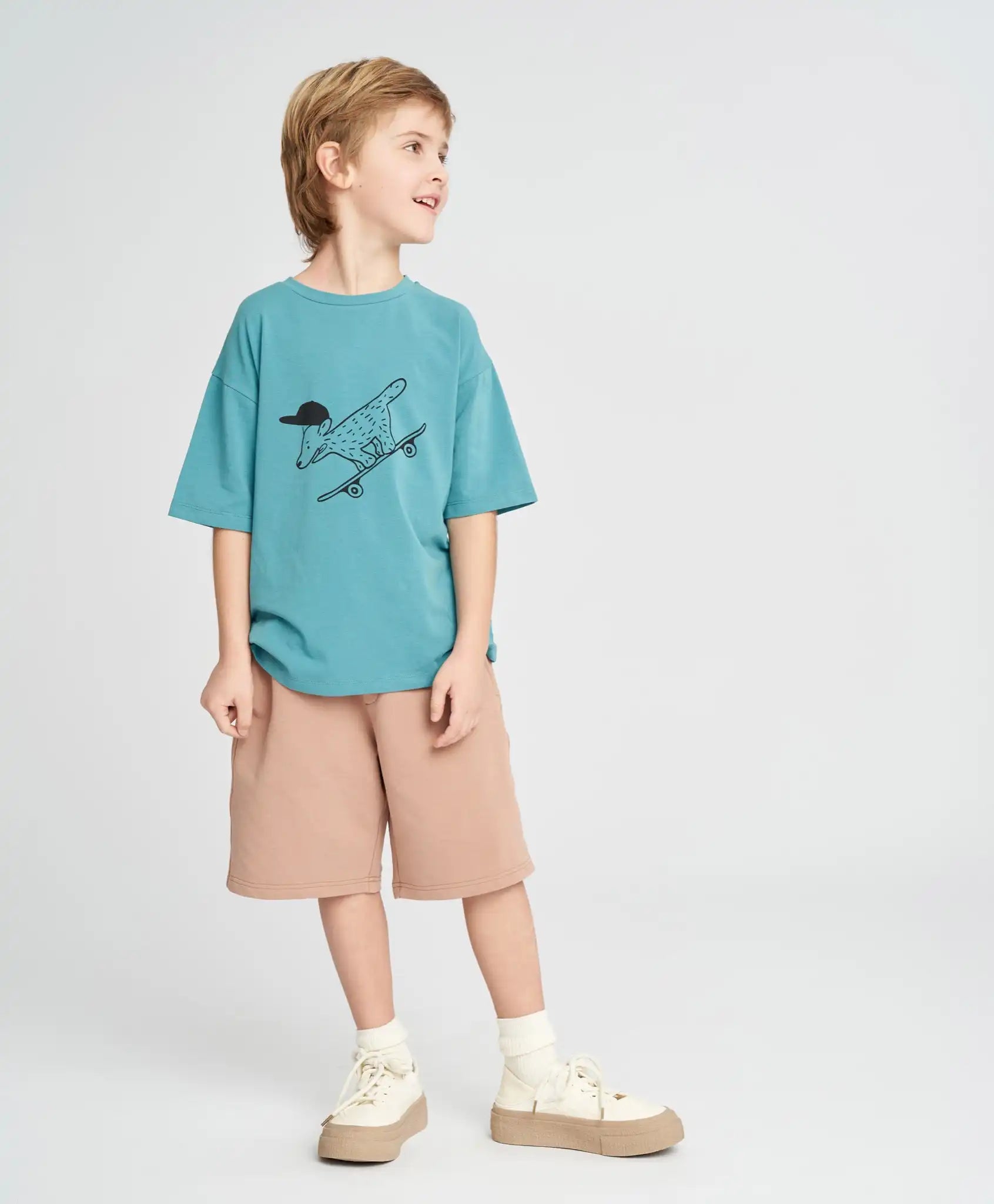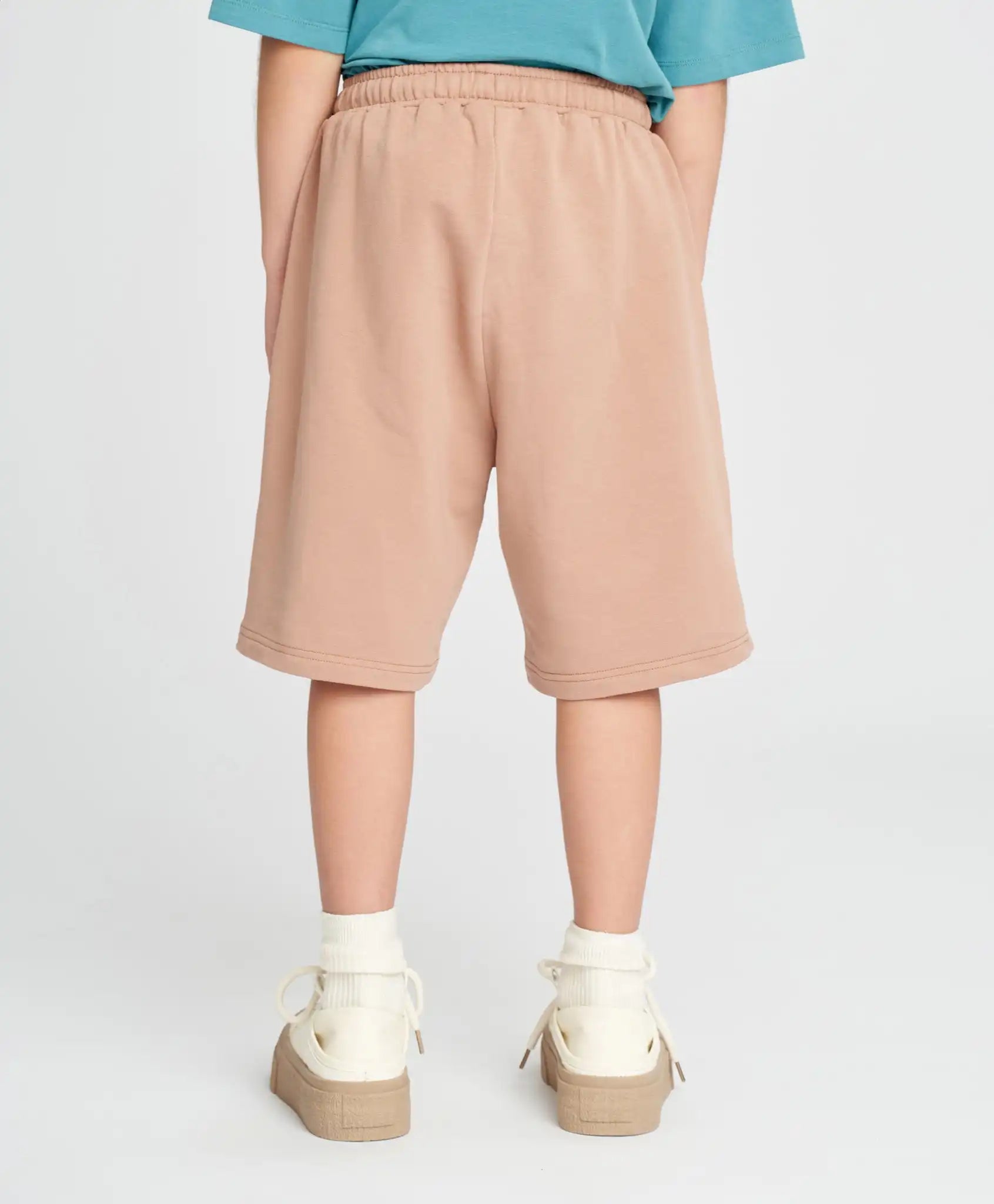 Șorturile tricotate pentru copii, în nuanță nisipie, au talie elastică și posibilitate de ajustare individuală prin șnururi integrate. Confortul modelului este sporit de cele două buzunare laterale. Țesătura mixtă moale (bumbac, poliester, elastan) garantează un microclimat optim, durabilitate și menținerea formei chiar și în cazul utilizării active. Șorturile au o suprafață netedă la exterior și un interior moale cu bucle, asigurând un plus de confort. Croiala lejeră le face potrivite pentru sport, plimbări sau purtare zilnică. În colecția capsulă Button Blue, aceste șorturi monocrome se combină ușor cu orice top, creând ținute minimaliste pentru antrenamente sau relaxare.