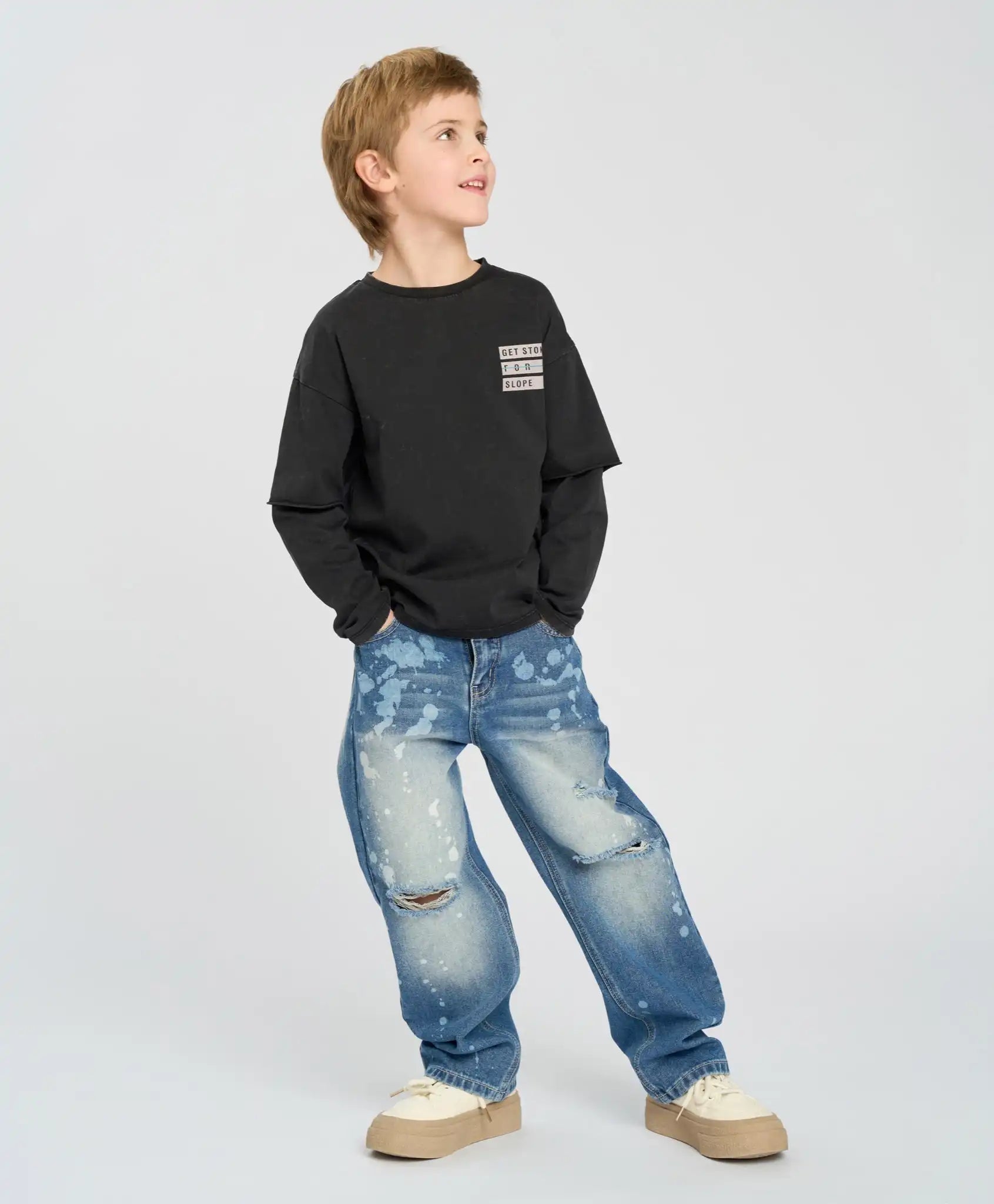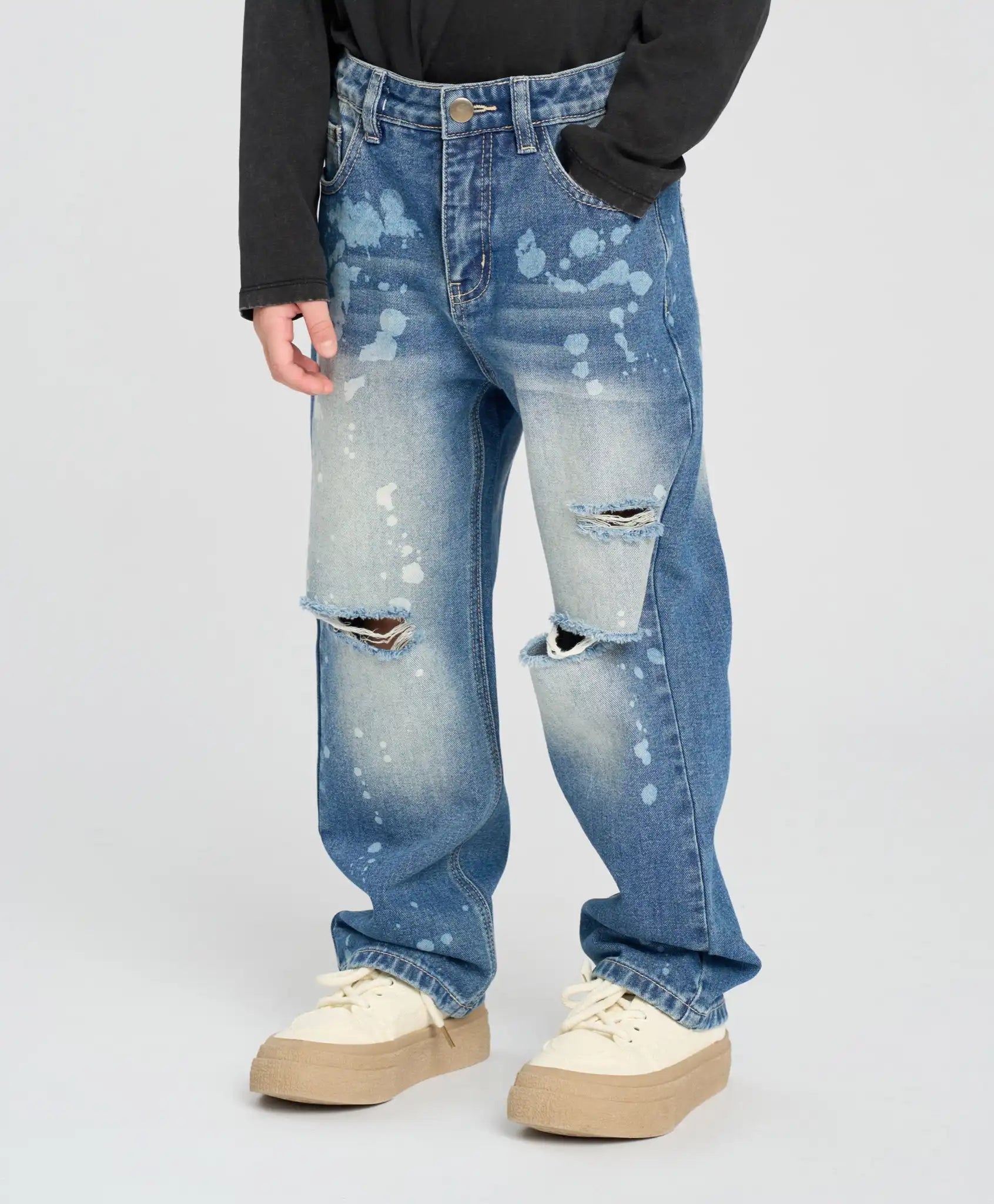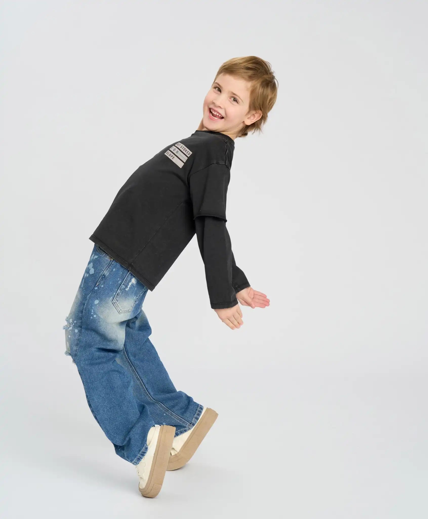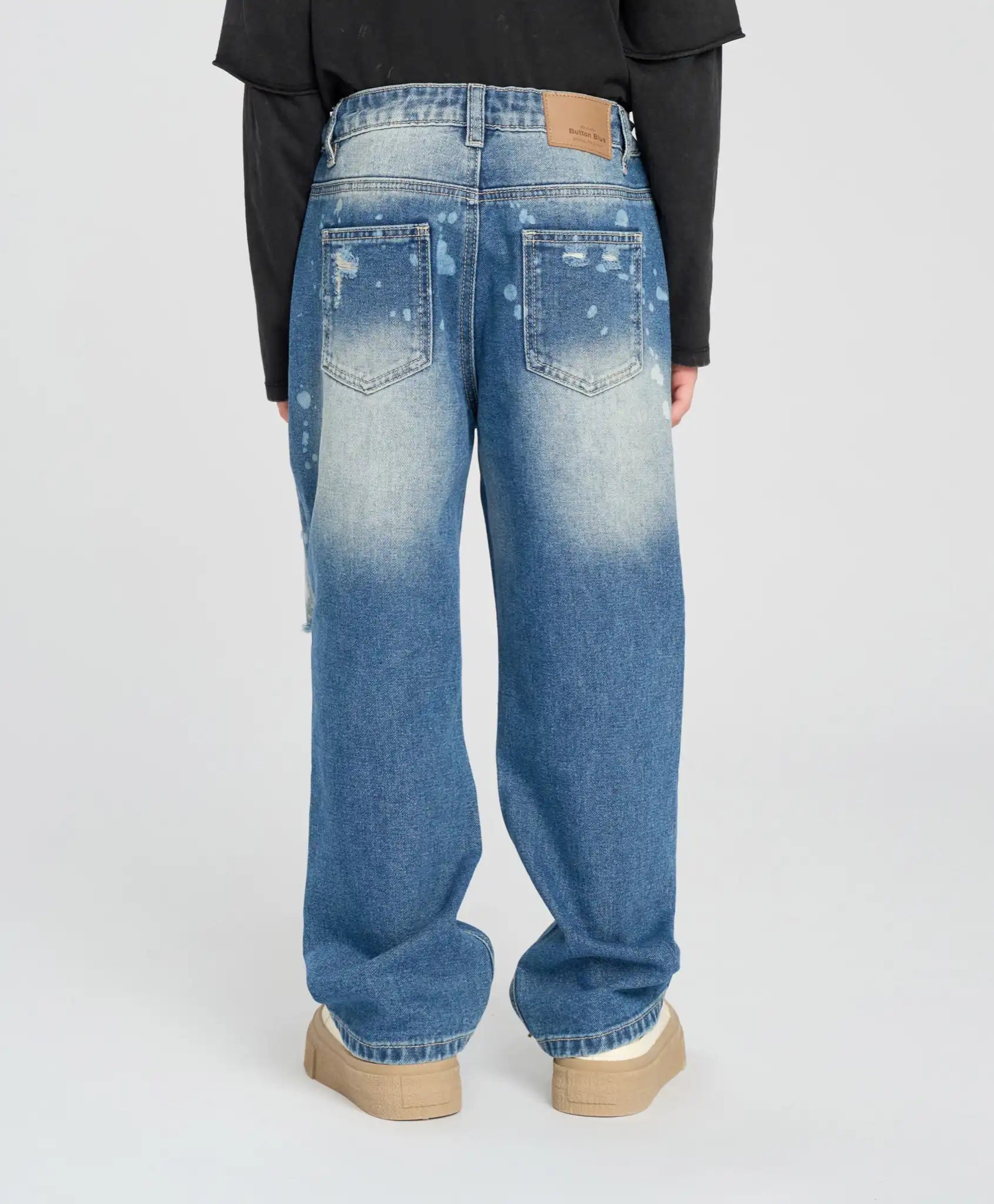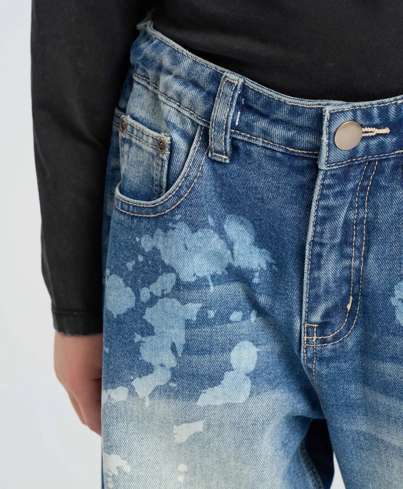 Blugii drepți pentru copii, cu efect uzat și croială mom-fit, sunt confecționați din denim dens. Compoziția din bumbac pur îi face respirabili și confortabili pentru purtarea zilnică. Sunt potriviți pentru băieți și fete cu orice tip de siluetă. Materialul de calitate își păstrează forma chiar și după jocuri active și nu se deformează la spălare. Blugii sunt decorați cu efecte de uzură pe întreaga lungime a cracilor. Se închid cu cârlig și fermoar. Urmați recomandările de îngrijire de pe eticheta interioară.