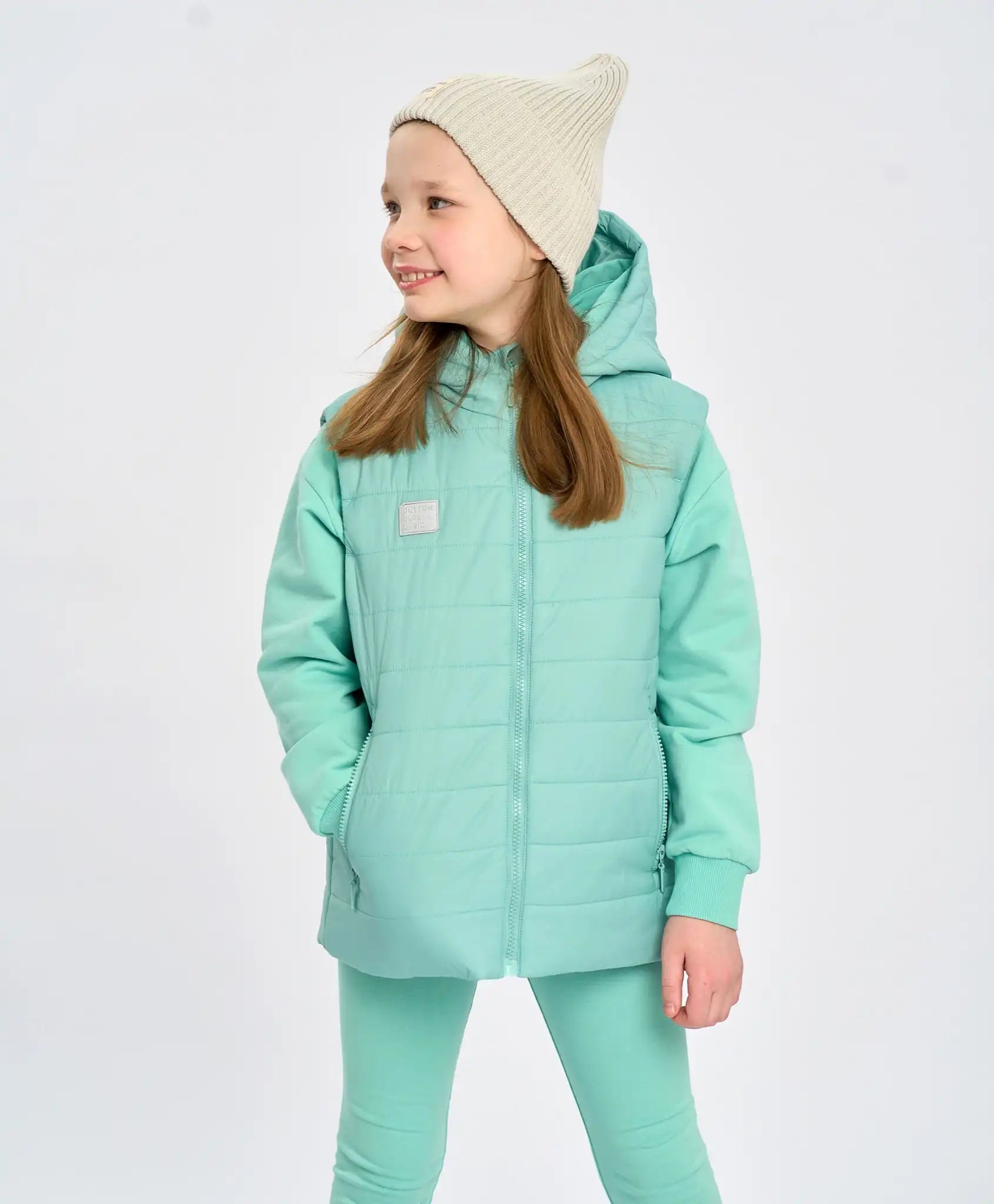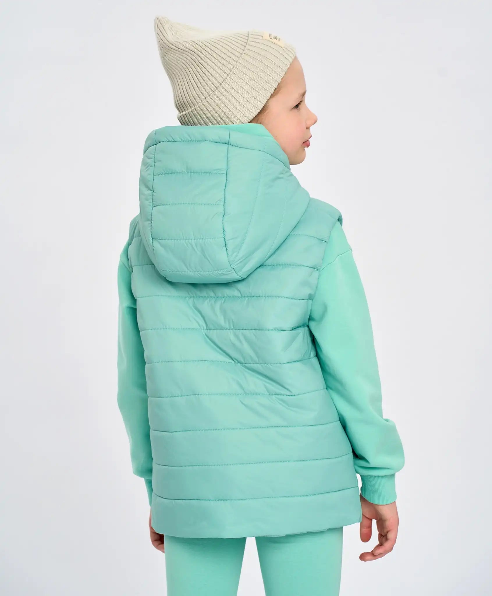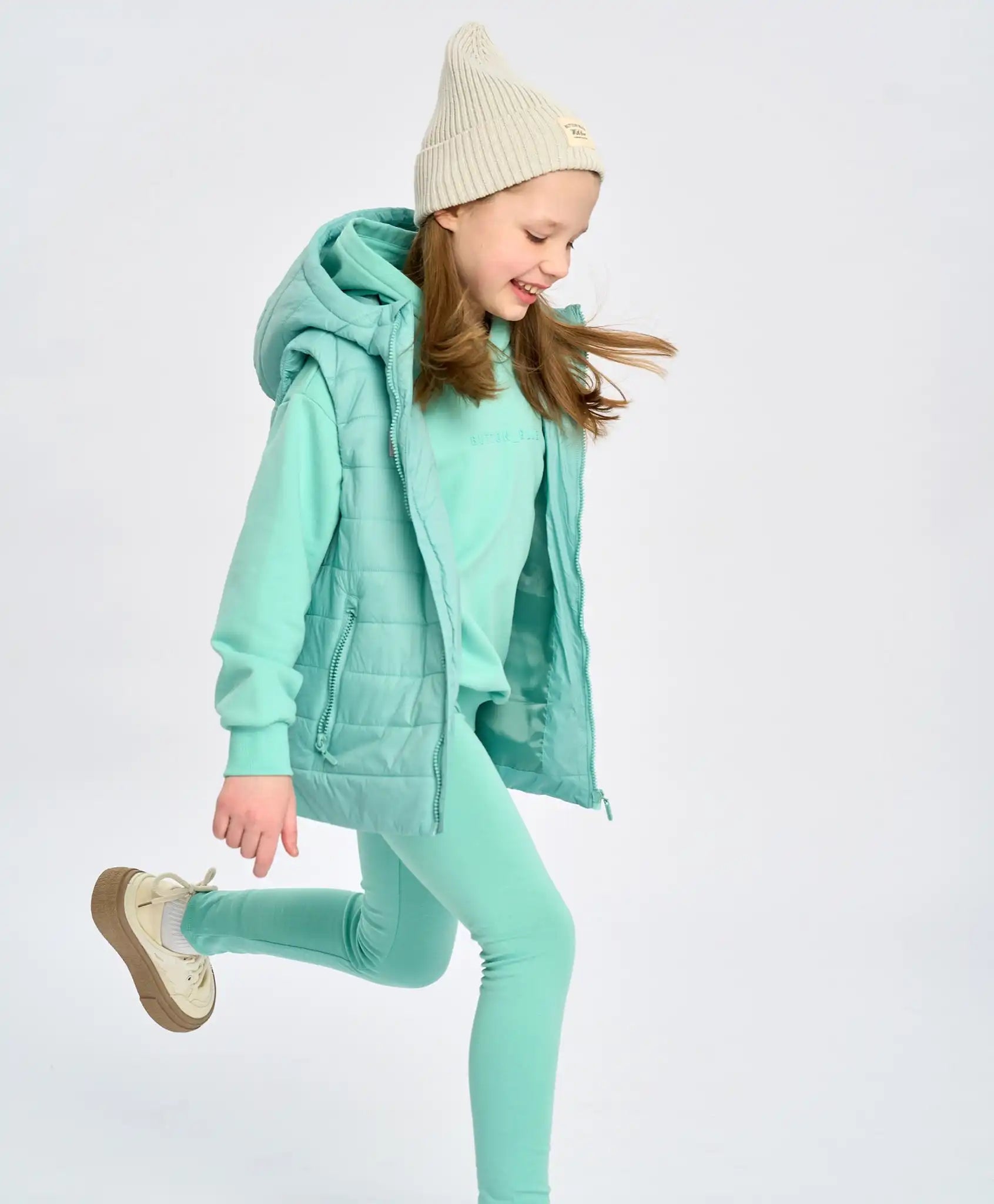 Vestă mentolată din material impermeabil. Umplutura de sintepon 120 g/m², căptușeala textilă netedă și gluga adâncă cu guler înalt fac acest model ideal pentru primăvară și toamnă. În această vestă călduroasă, copilul se va simți confortabil chiar și la +10°C. Potrivită pentru plimbări, călătorii, cumpărături sau școală. Buzunarele cu fermoar permit depozitarea obiectelor mici sau încălzirea mâinilor. Modelul se închide cu un fermoar cu protecție împotriva ciupirii. Croiala dreaptă nu strânge și nu restricționează mișcarea. Pentru siguranță, vestă are elemente reflectorizante și etichetă pentru nume, iar nuanța proaspătă „lagună” adaugă un plus de stil. Modelul universal este potrivit atât pentru băieți, cât și pentru fete.