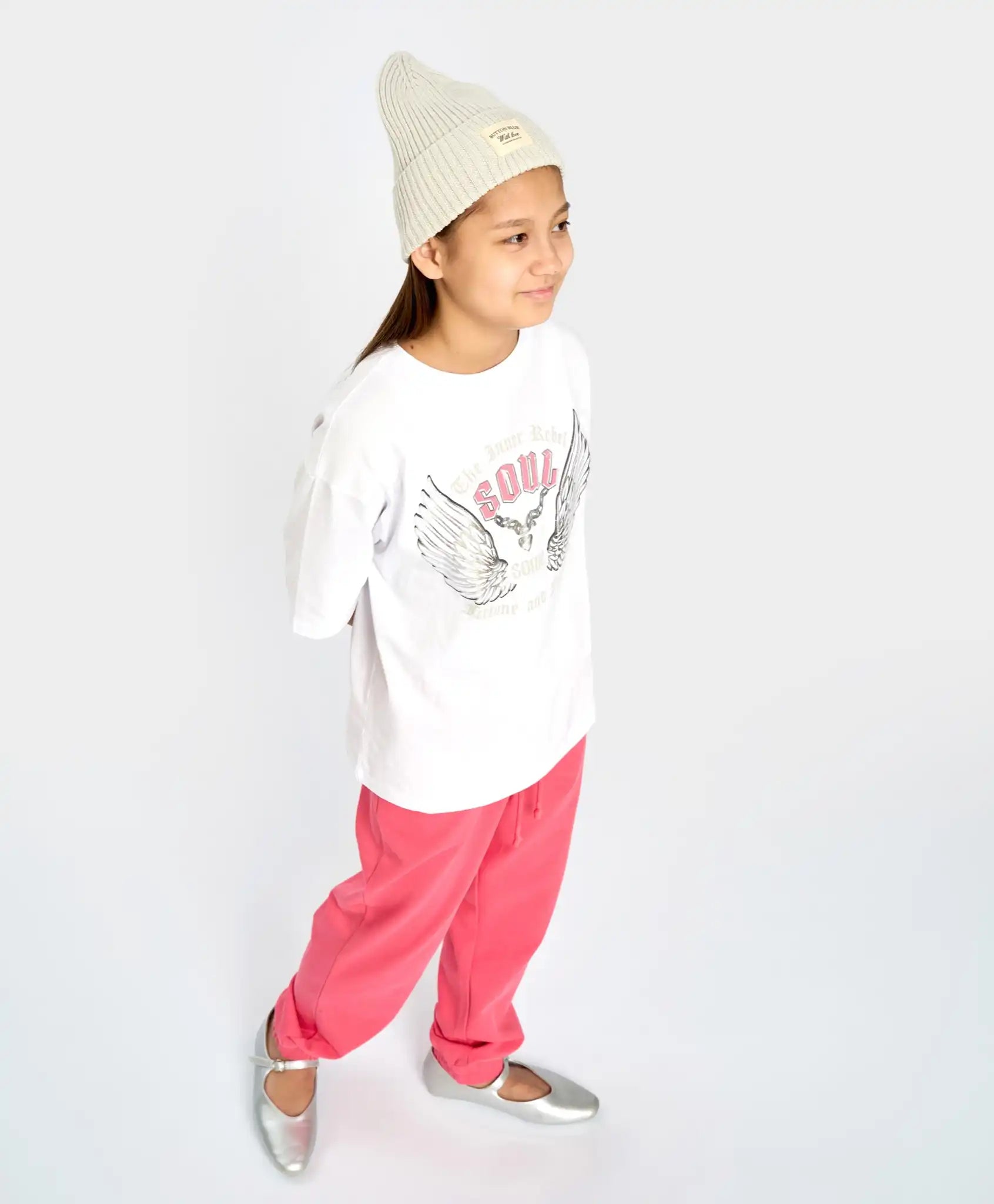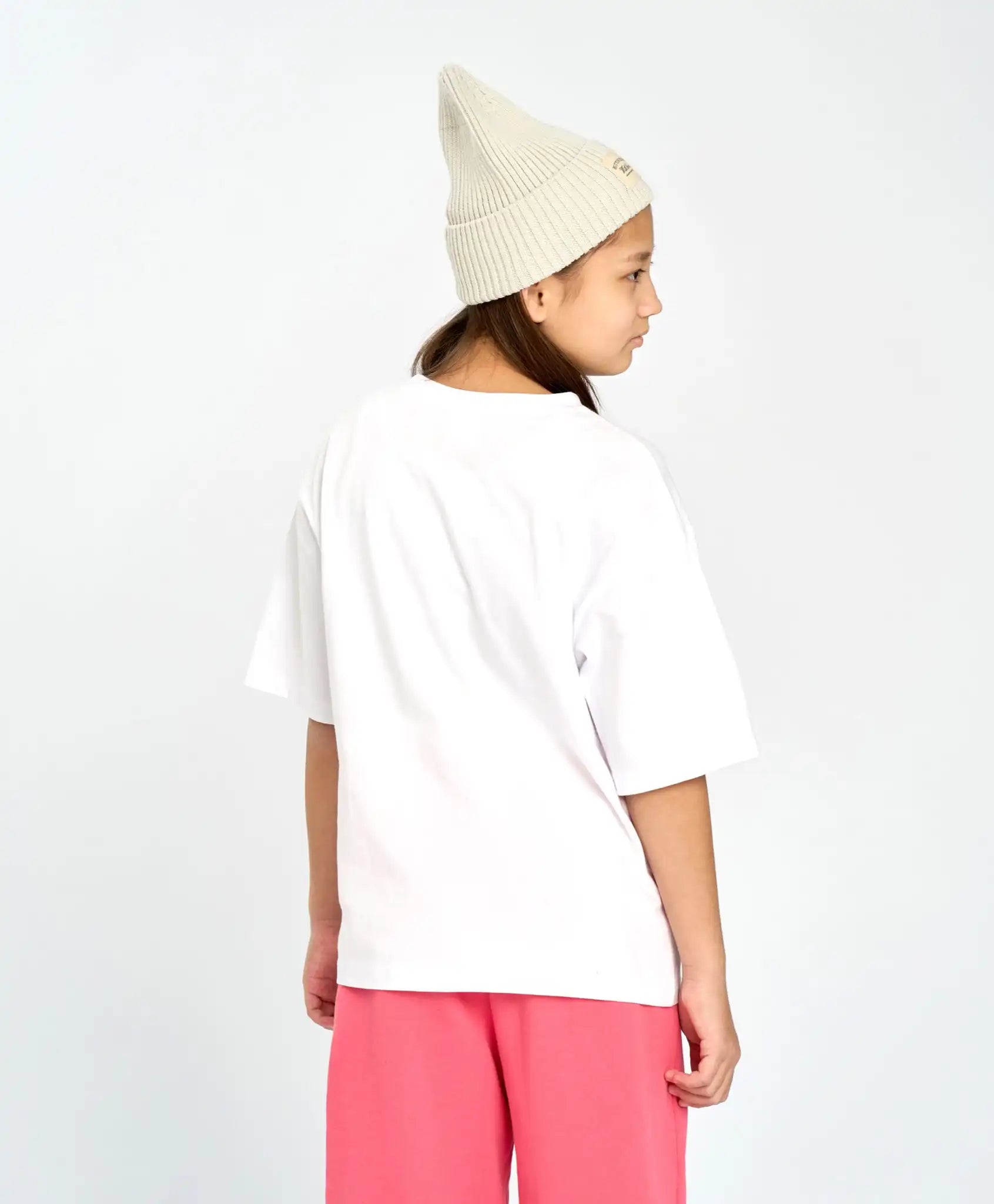 Tricoul oversize cu mânecă scurtă pentru fete este confecționat din material jersey mixt cu bază din bumbac, ceea ce îl face moale, respirabil și plăcut la atingere. Linia căzută a umerilor și croiala lejeră sunt create pentru fete active. Tricoul de vară pentru copii are mâneci de lungime optimă – până la cot. Culoarea albă se combină ușor cu diverse piese vestimentare pentru utilizare zilnică, sportivă sau de casă. Modelul poate fi purtat pe tot parcursul anului – singur în zilele calde sau ca prim strat în zilele reci. Imprimeul metalizat adaugă un accent trendy.