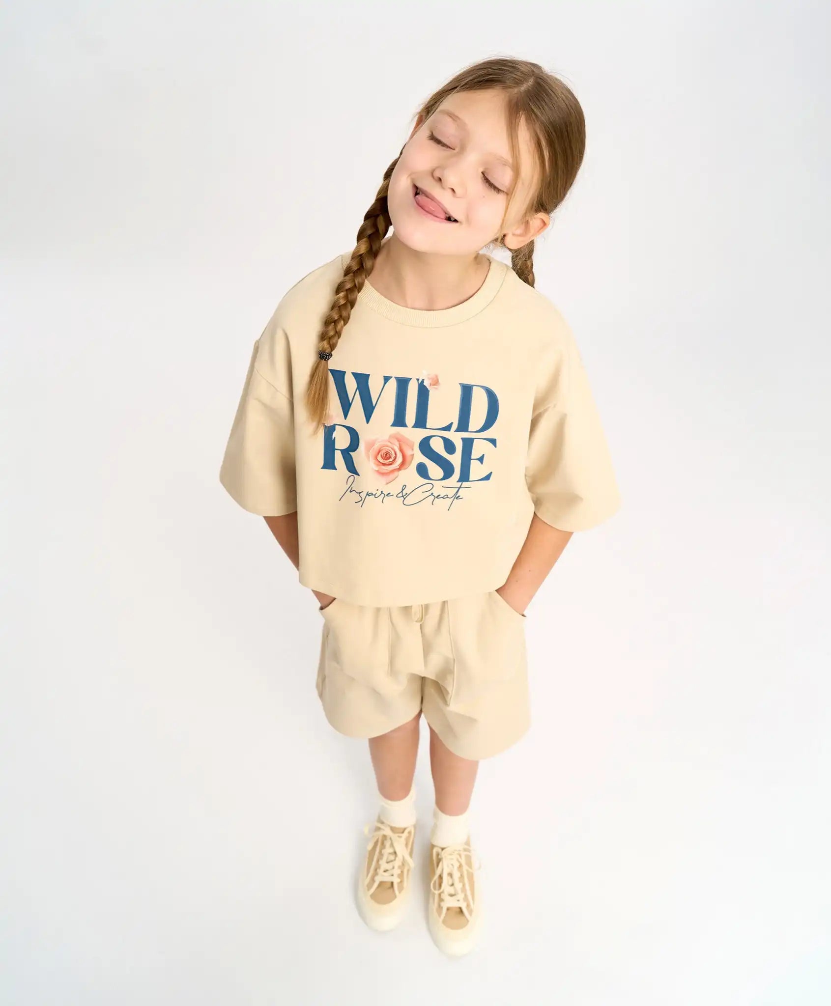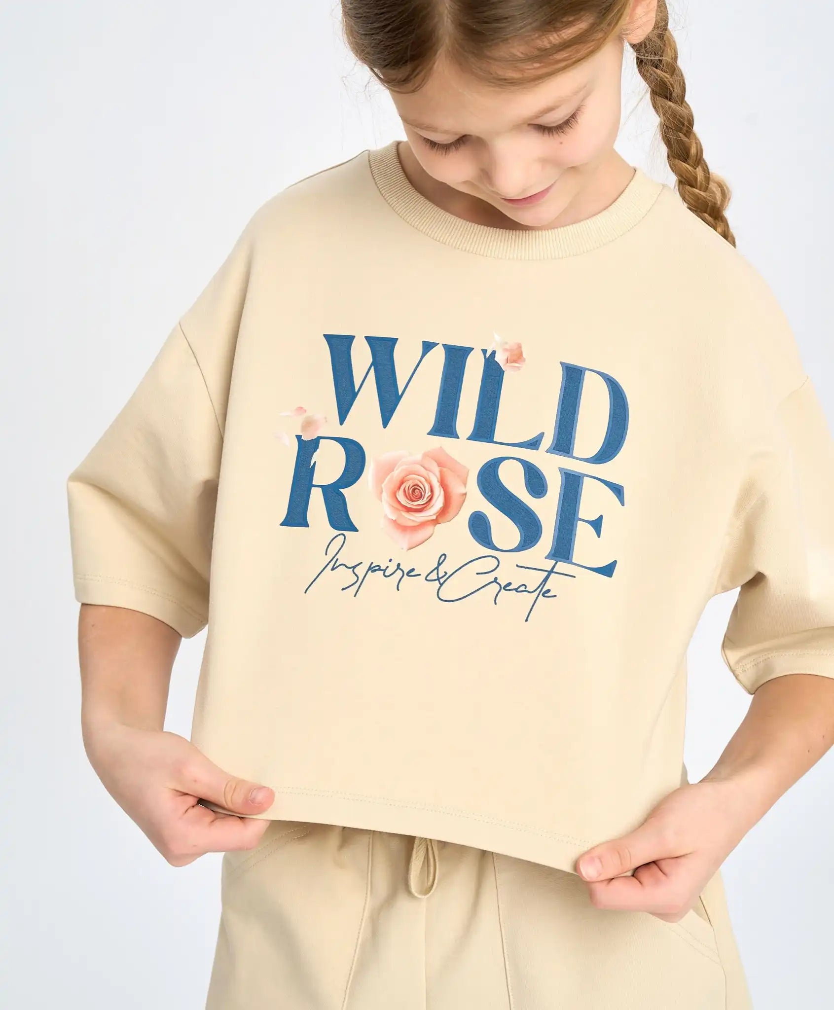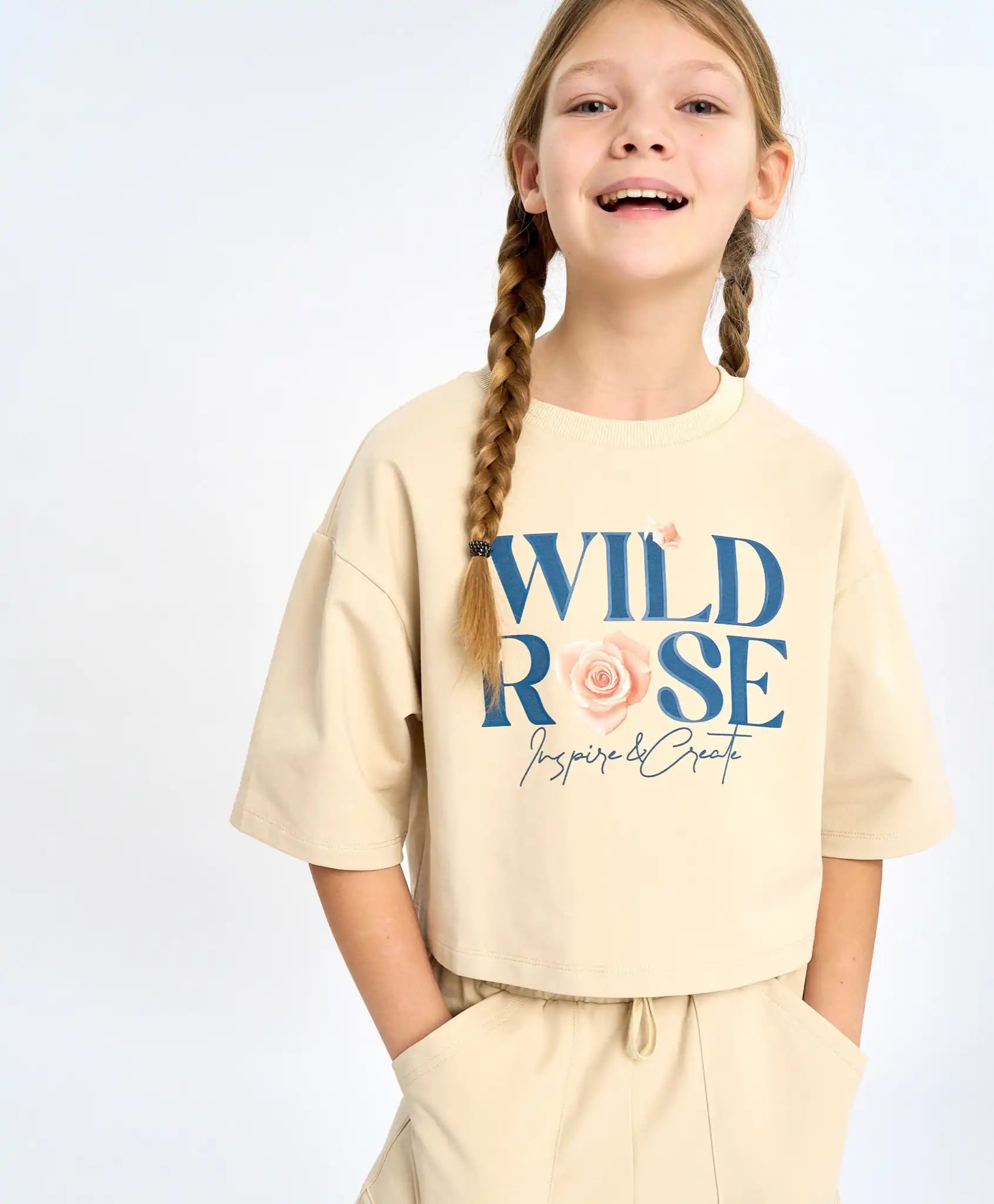 Tricou cropped cu mânecă scurtă pentru fete, confecționat din material french terry cu interior buclat, ceea ce îl face dens, respirabil și ușor de întreținut. Linia căzută a umerilor și croiala oversize îl fac extrem de confortabil pentru fetele active. Tricoul scurt de vară are mâneci de lungime optimă – până la cot. Modelul se combină ușor cu garderoba casual, sportivă și de casă. Tricoul are un design interesant datorită imprimeului floral și tipografic, precum și contrastului dintre texturi. Practicitatea este accentuată de nuanța bej delicată „nisip auriu”.