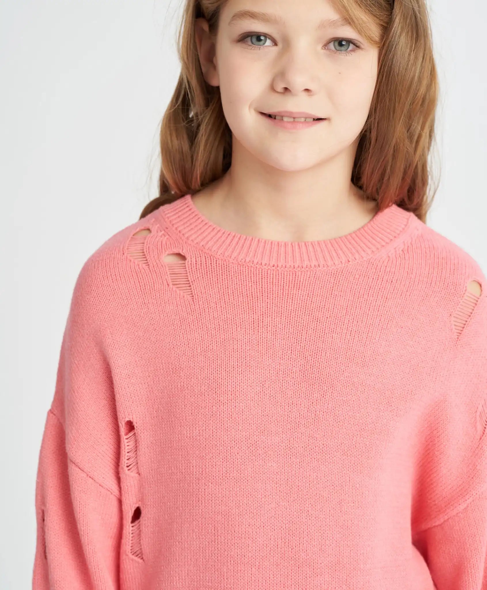 Pulover pentru fete corai cu efect de rupturi, oversized Button Blue