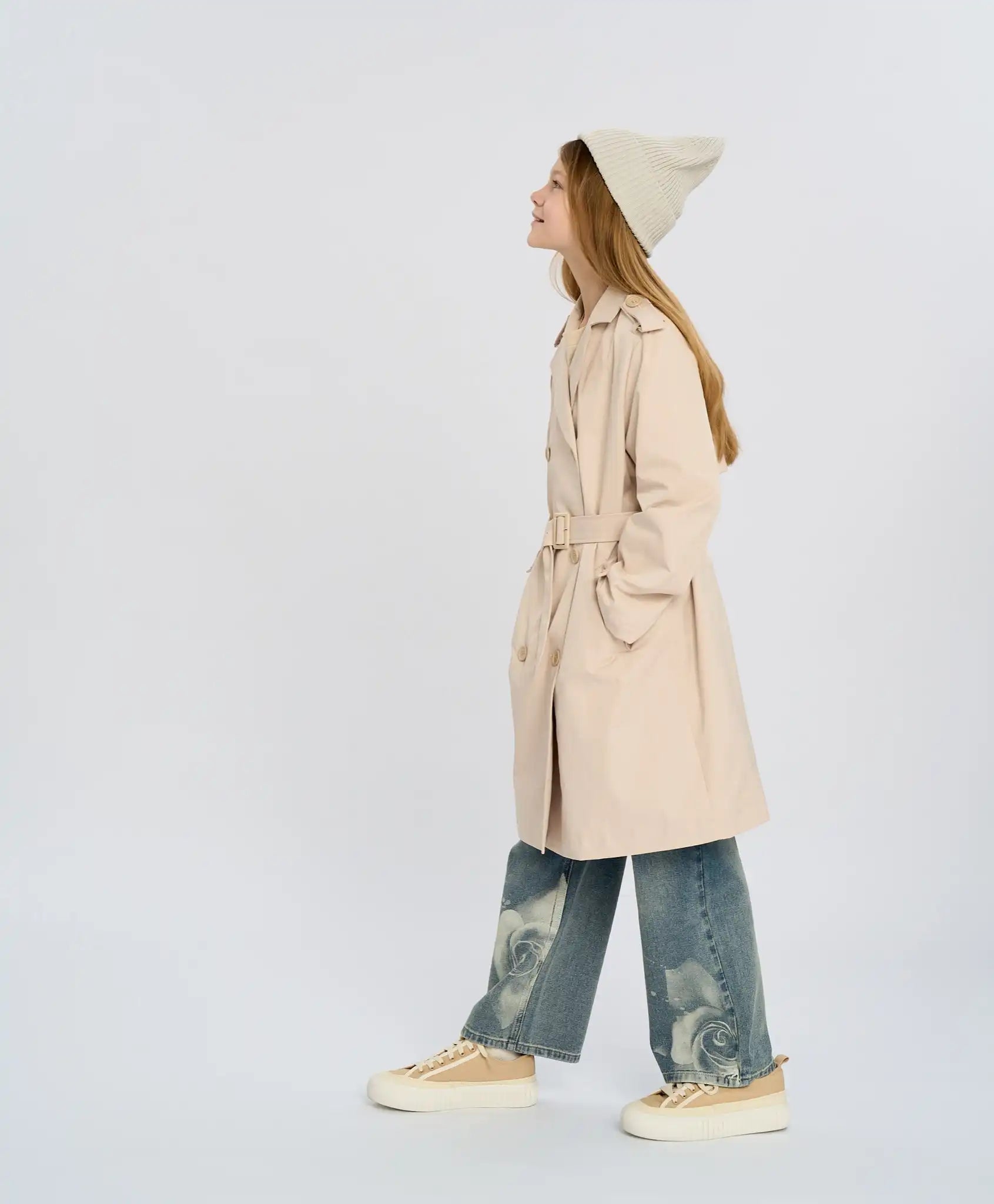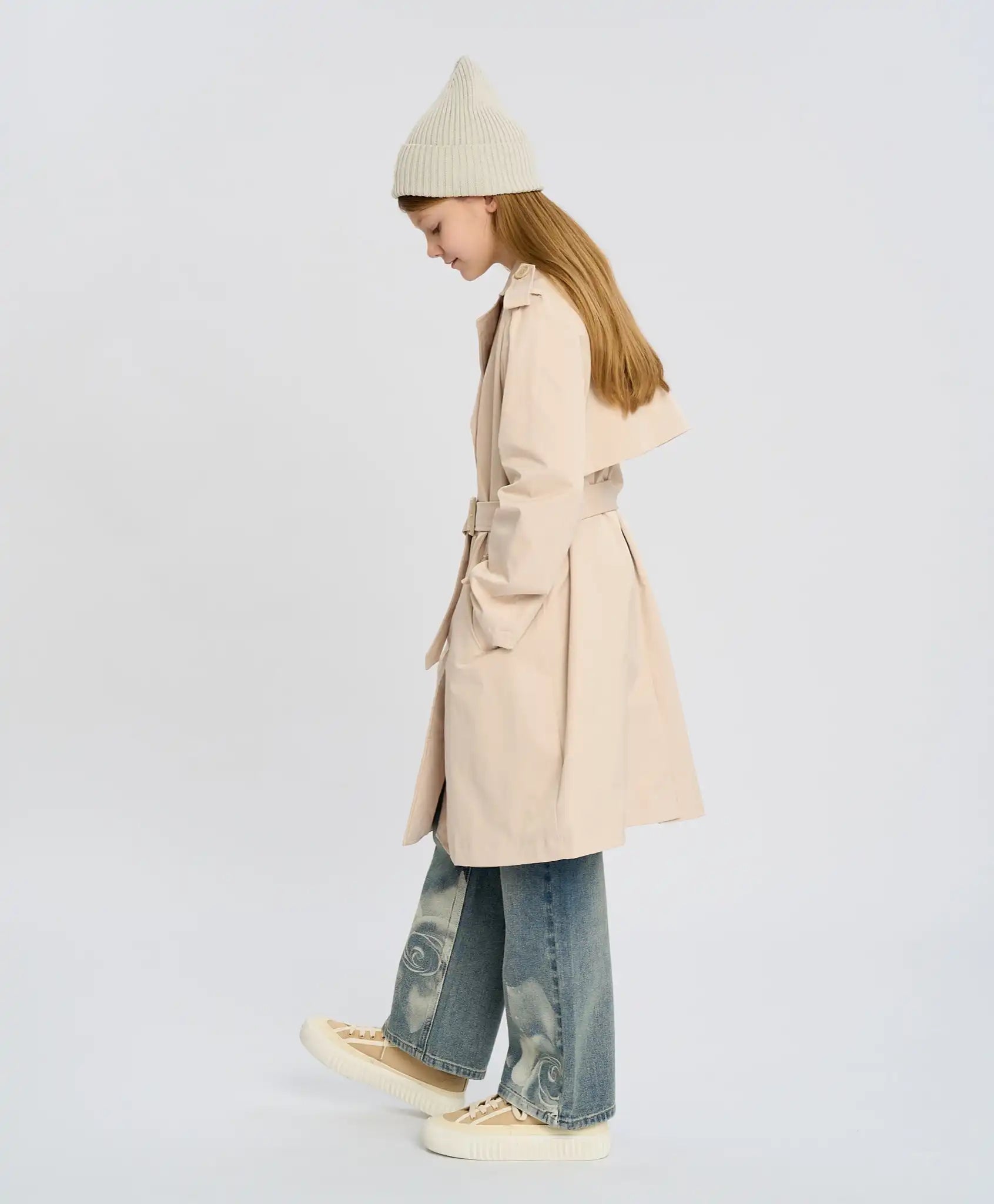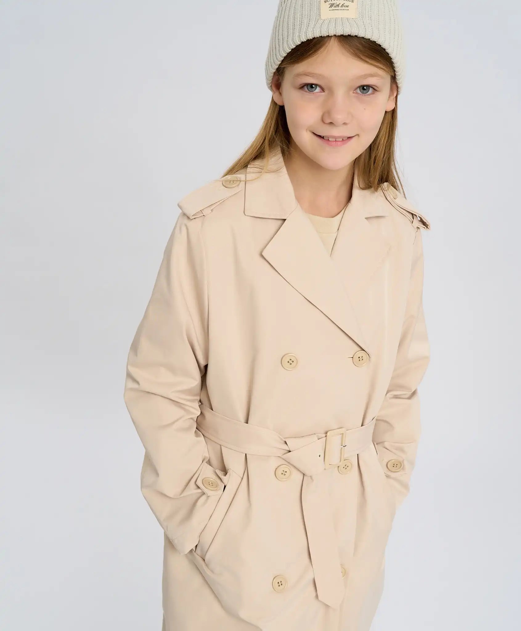 Trench-ul crem pentru fete este realizat din material impermeabil, ceea ce îl face rezistent la ploaie. Modelul se închide cu nasturi și are o căptușeală călduroasă din sintepon de 100 g/m², asigurând confort termic chiar și la +15°C. Croiala dreaptă, de tip dublu rând, include un decolteu în V, curea, revere, epolet pe umeri, platcă pe spate și manșete cu nasturi. Pentru un plus de comoditate, sunt adăugate două buzunare cu clapetă și un slit la spate. Acest trench călduros are un aspect elegant și rafinat. Nuanța delicată „nisip auriu” adaugă prospețime și rafinament ținutei. Este potrivit pentru plimbări, școală sau shopping.