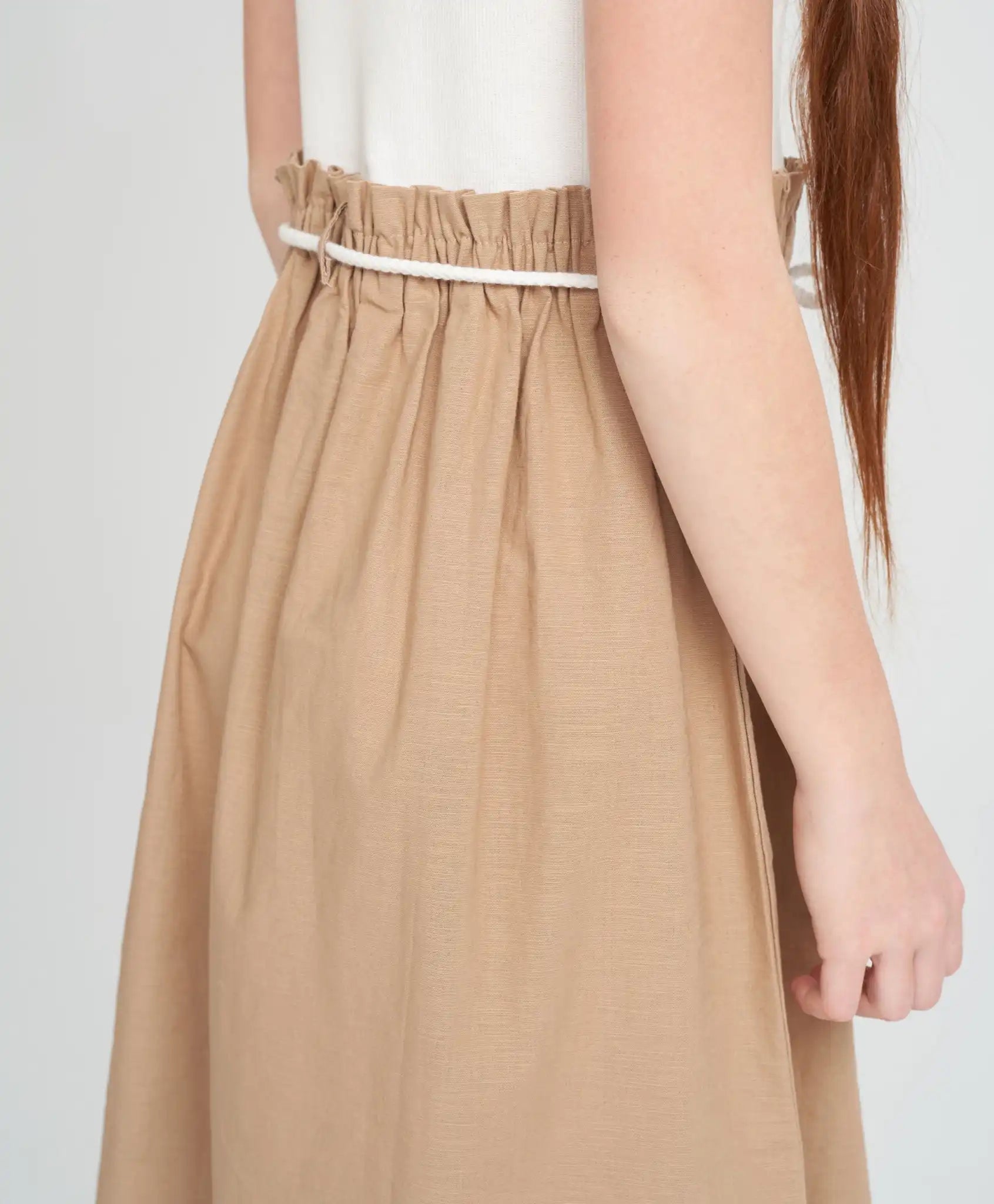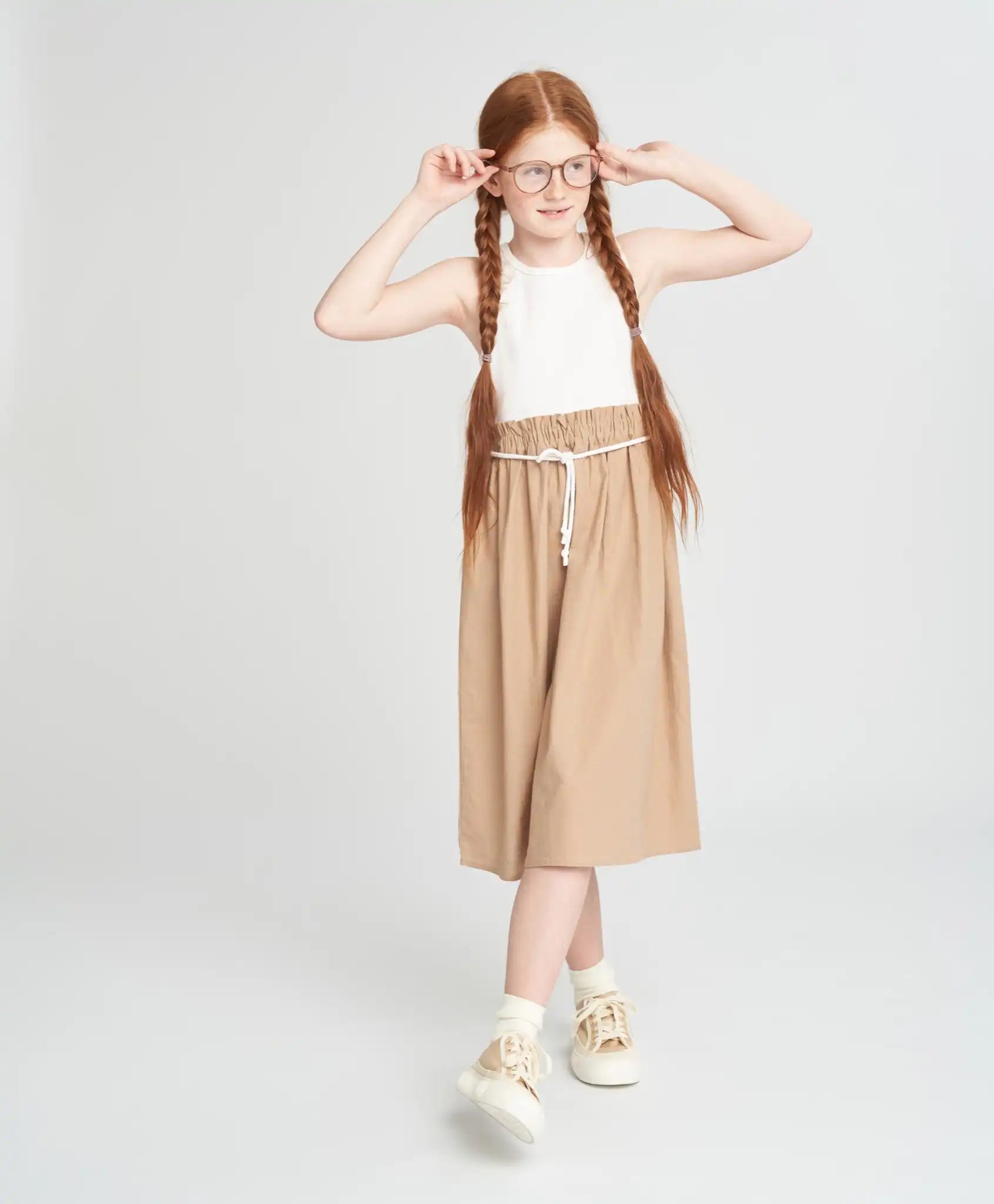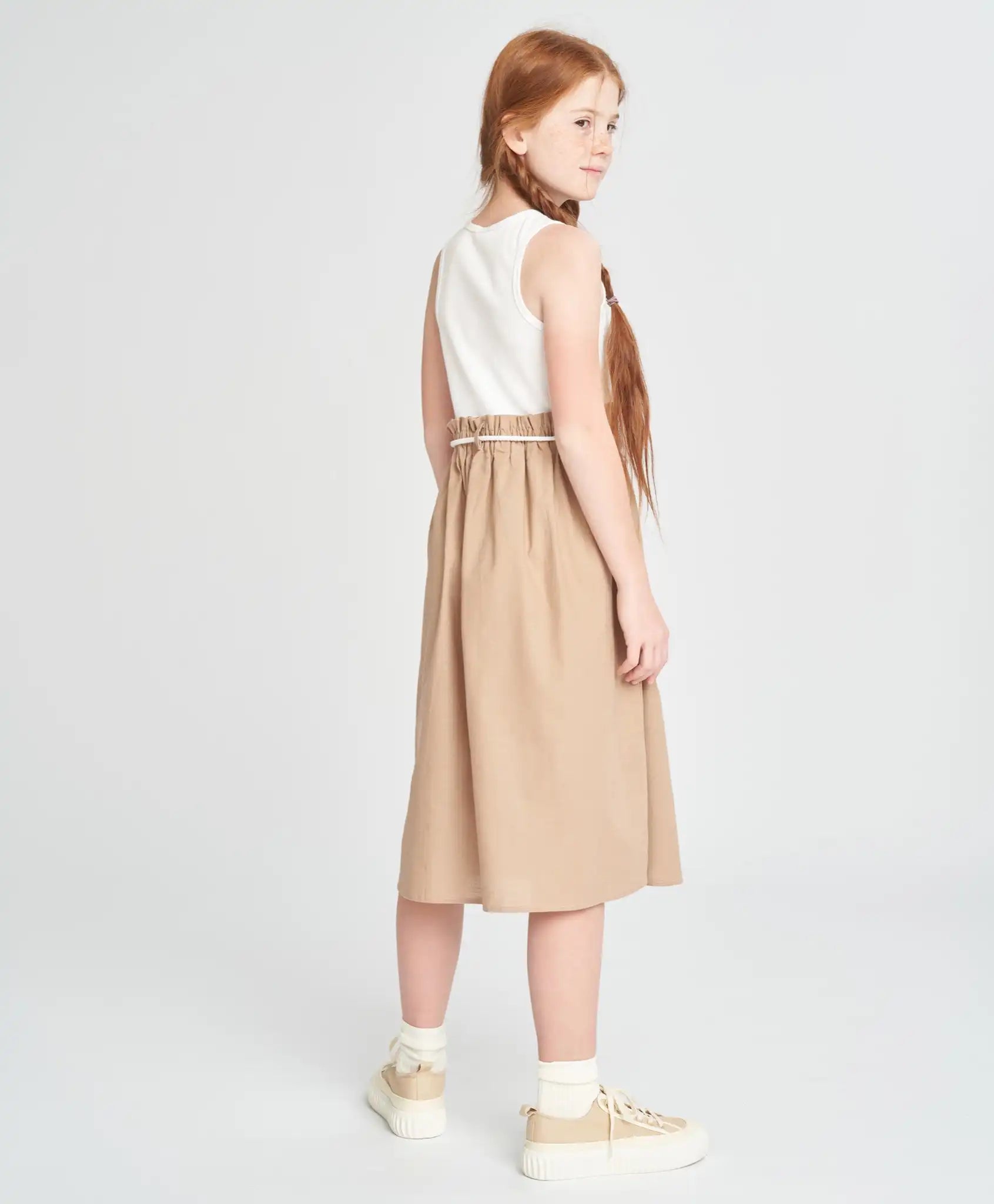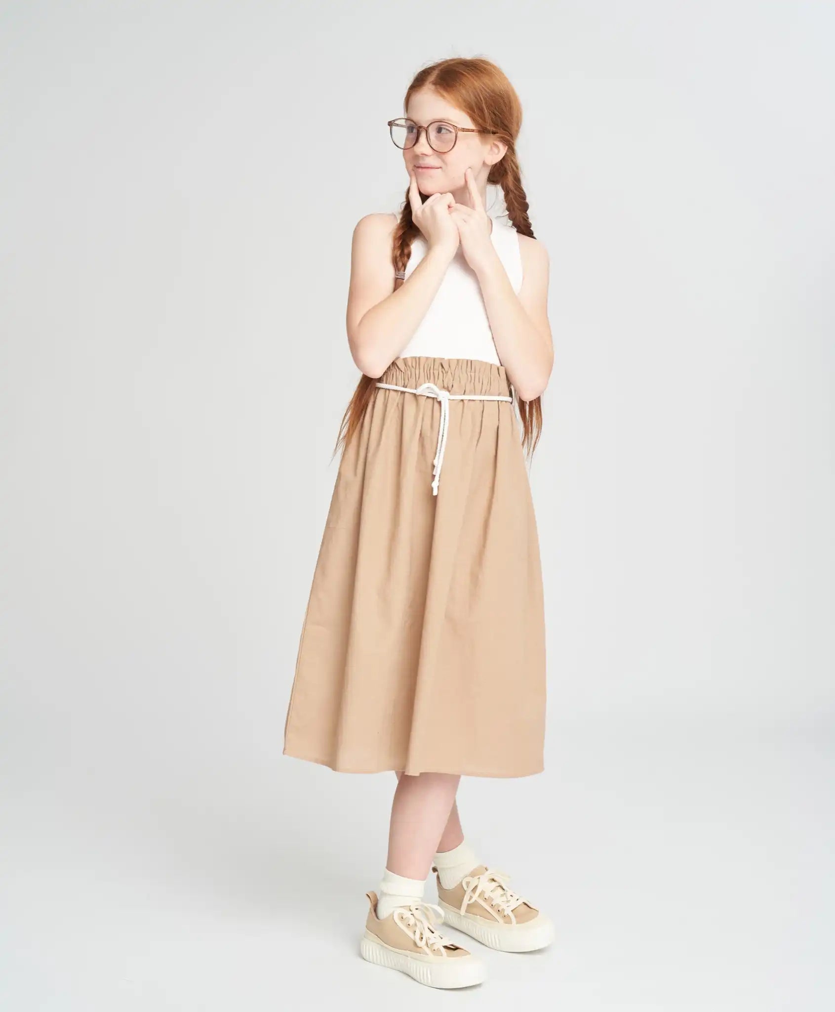 Sarafan combinat pentru fete, format dintr-un maiou alb din material mixt, cu textură rib, și o fustă din in, într-o nuanță maro „copra”. Modelul este respirabil, elastic și plăcut la atingere. Sarafanul de vară este completat de un cordon alb, care permite evidențierea taliei. Fusta este lejeră, confortabilă și are o lungime optimă. Rochia ușoară atrage privirile prin combinația dintre un top casual, aproape sportiv, și o fustă contrastantă, fluidă și romantică.