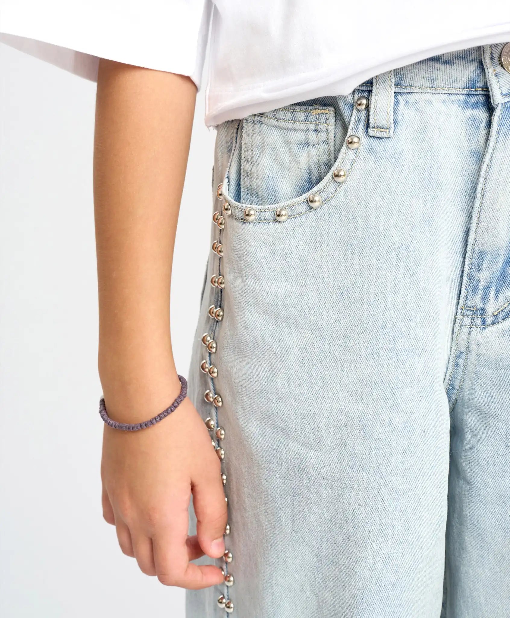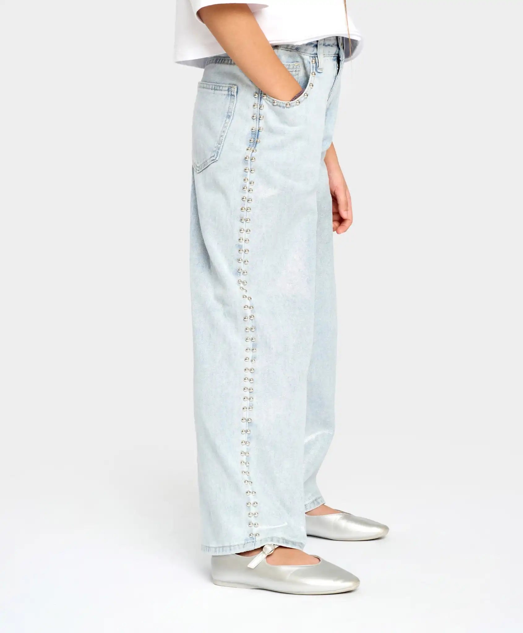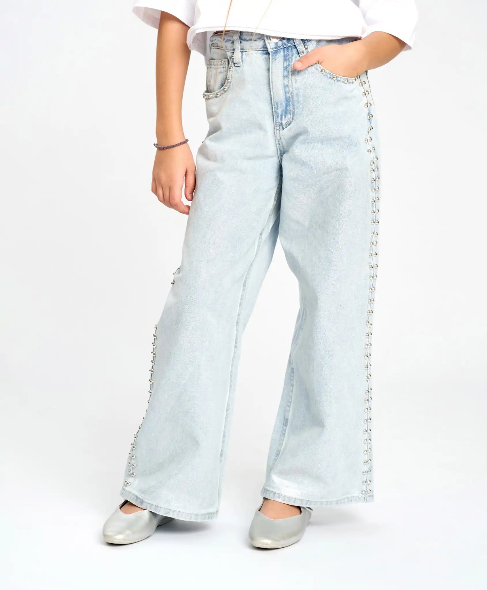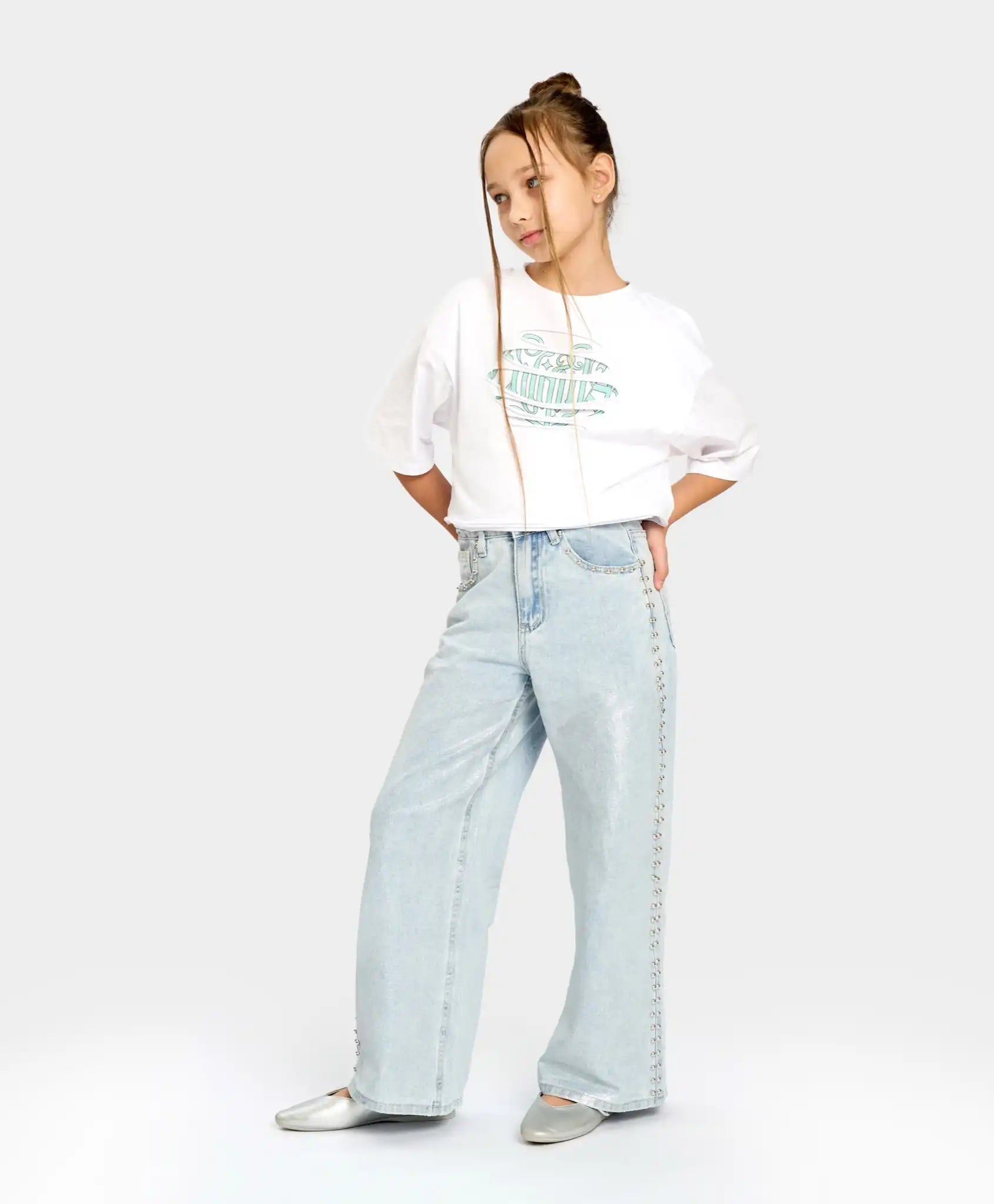 Blugii largi pentru fete sunt universali și confortabili – potriviți pentru orice siluetă. Confecționați din bumbac, sunt respirabili și rezistenți. Modelul se închide cu nasture și fermoar, are o bandă elastică interioară pentru reglarea taliei și găici pentru curea. Blugii evazați bleu au o nuanță delicată, ceea ce îi face potriviți pentru orice ocazie – școală, evenimente festive sau plimbări. Capsele metalice de pe laterale și din jurul buzunarelor adaugă un aer modern. În același timp, blugii palazzo pentru fete sunt extrem de confortabili – se mulează bine pe talie, dar sunt largi pe toată lungimea și nu restricționează mișcarea. Dispun de două buzunare frontale și două la spate.