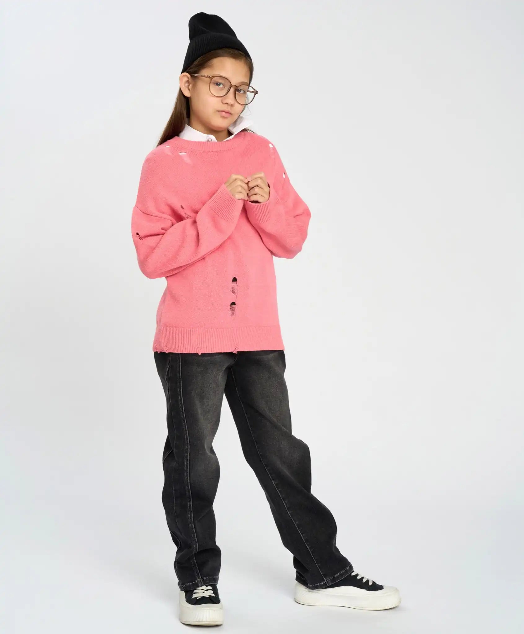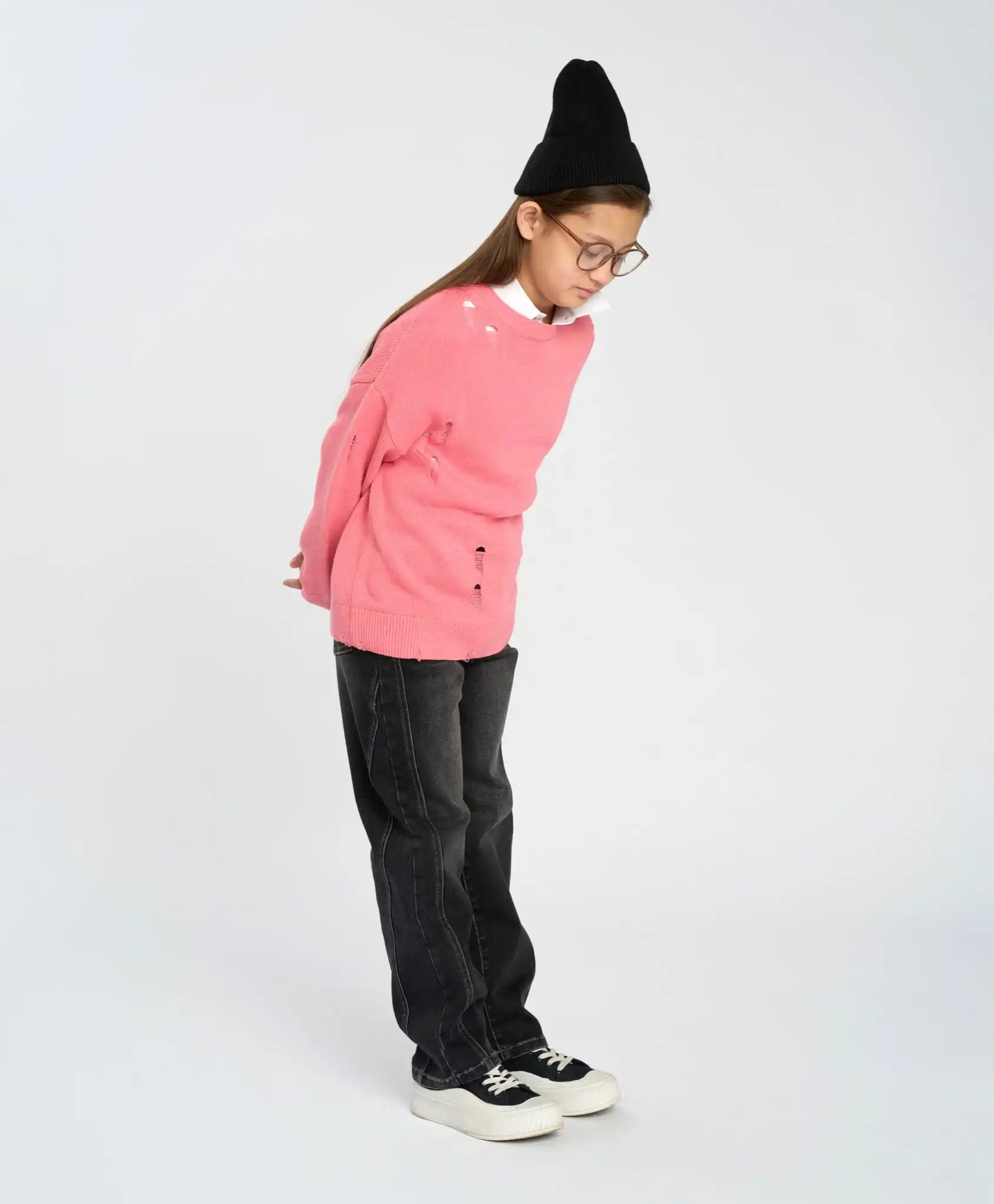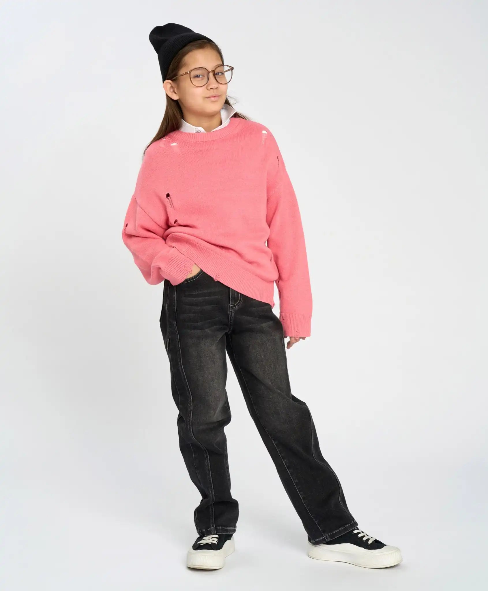 Blugii skinny cu cusături laterale diagonale, în nuanță grafit, sunt confecționați din denim terry cu bază din bumbac, ceea ce îi face densi, dar respirabili și elastici. Se închid cu fermoar. Sunt comozi, cu croială dreaptă, găici pentru curea și buzunare exterioare. Stilul modern este accentuat de prespălarea enzimatică și detaliile ușor uzate din zona genunchilor. Sunt un plus excelent pentru garderoba de zi cu zi, datorită culorii neutre, dar sunt potriviți și pentru plimbări, evenimente, școală sau călătorii.