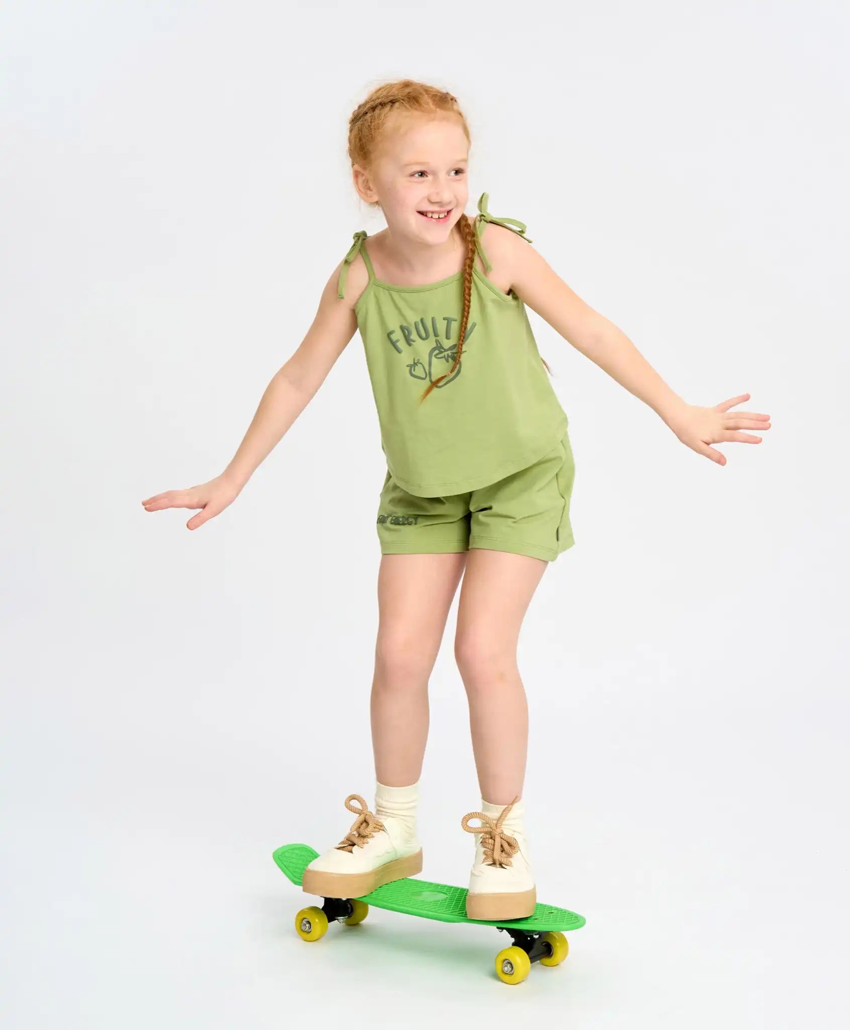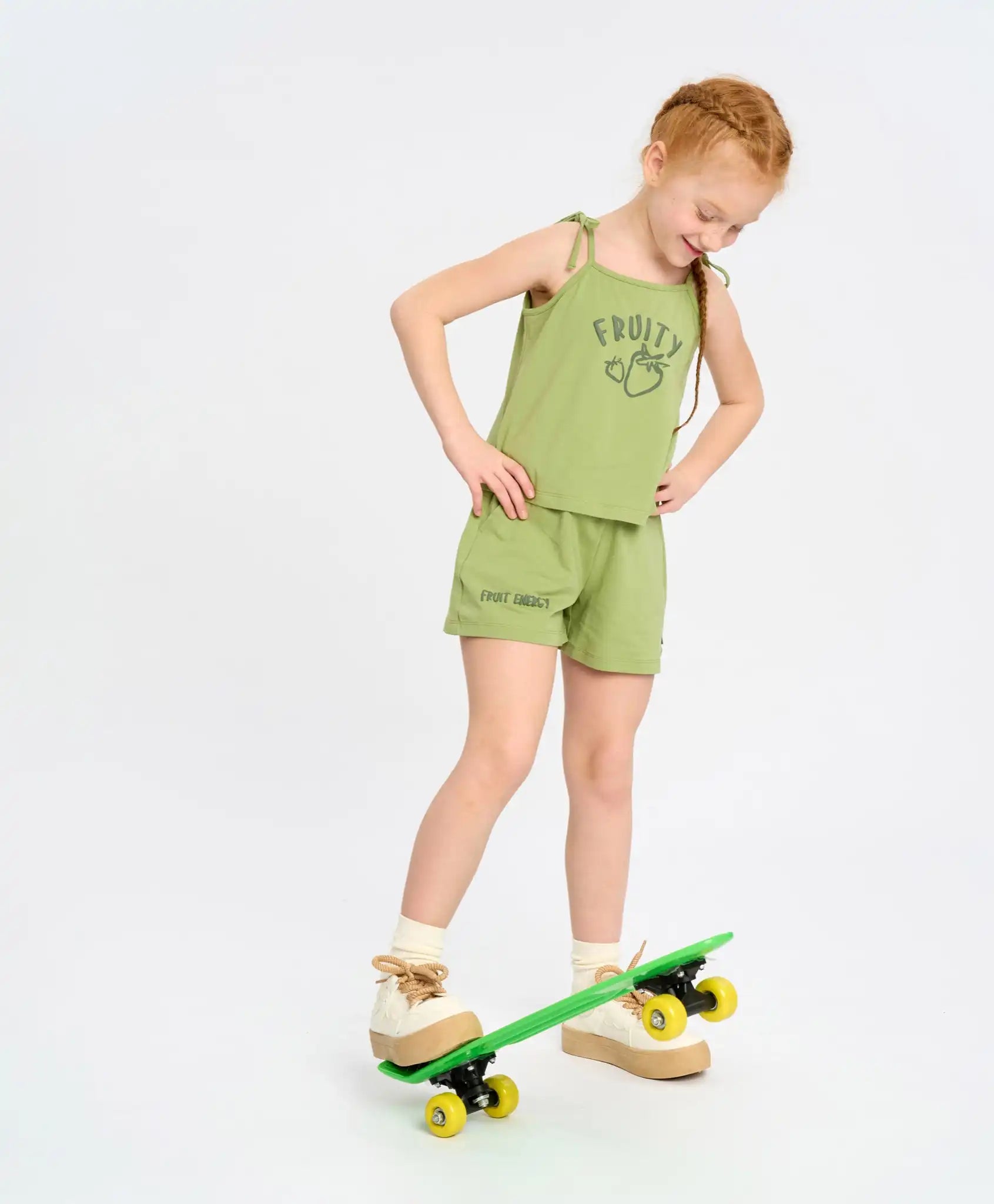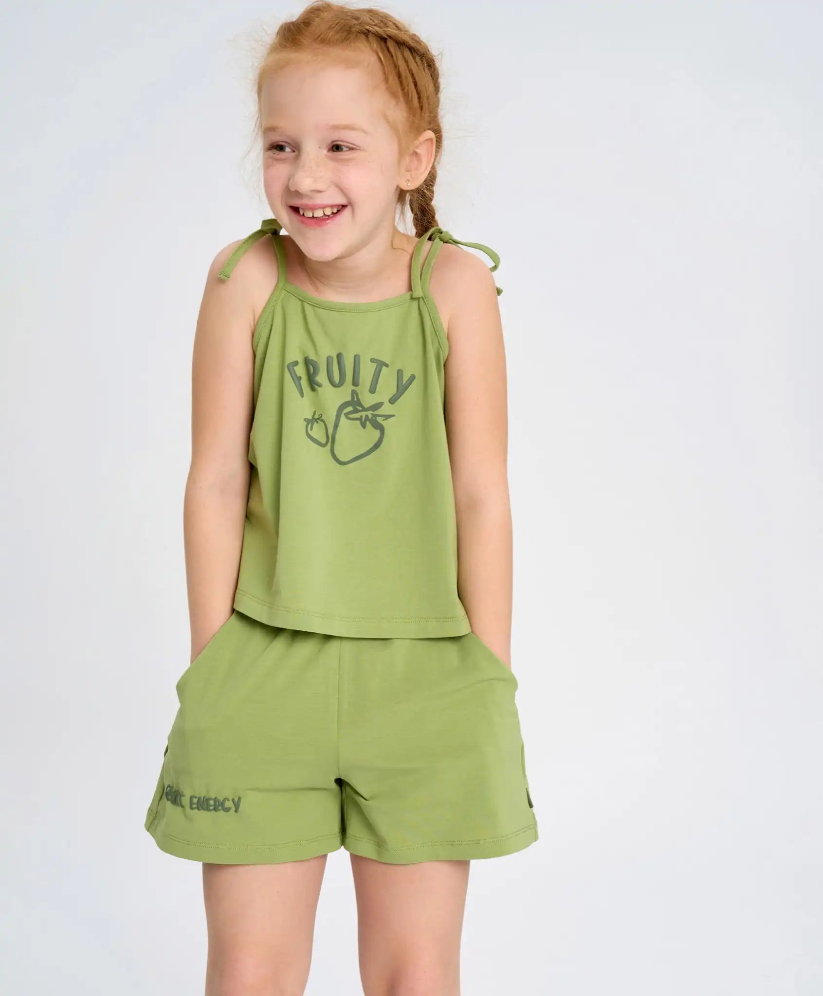 Topul verde pentru fete este realizat din tricot fin jersey. Țesătura mixtă pe bază de bumbac este respirabilă, moale, subțire și ușor de întreținut – ideală pentru vară. Bretelele subțiri se leagă în fundițe, adăugând un farmec aparte. Croiala lejeră nu restricționează mișcarea, oferind copilului confort maxim. Modelul în nuanța estragonului este completat de un imprimeu tip puf și un motiv fructat vesel.