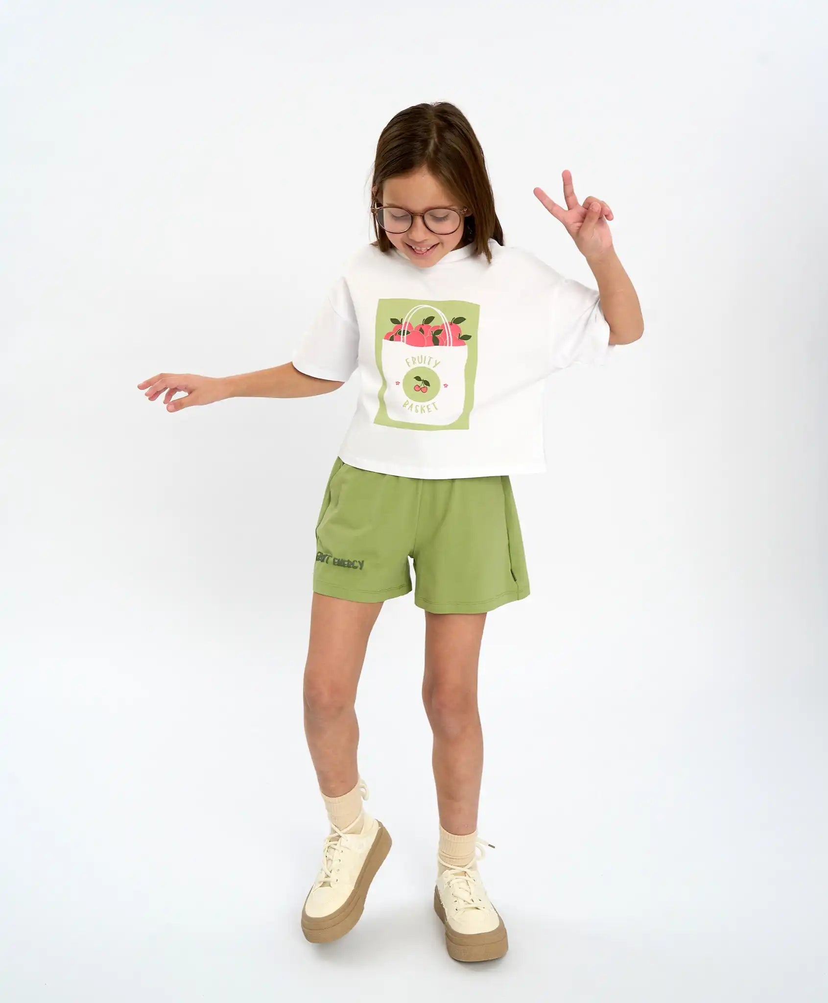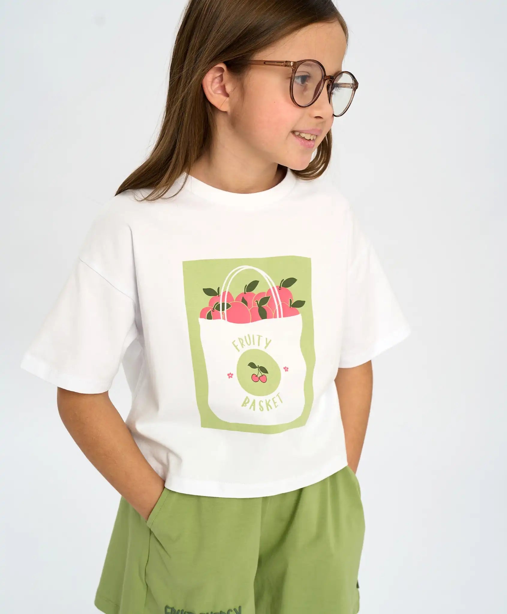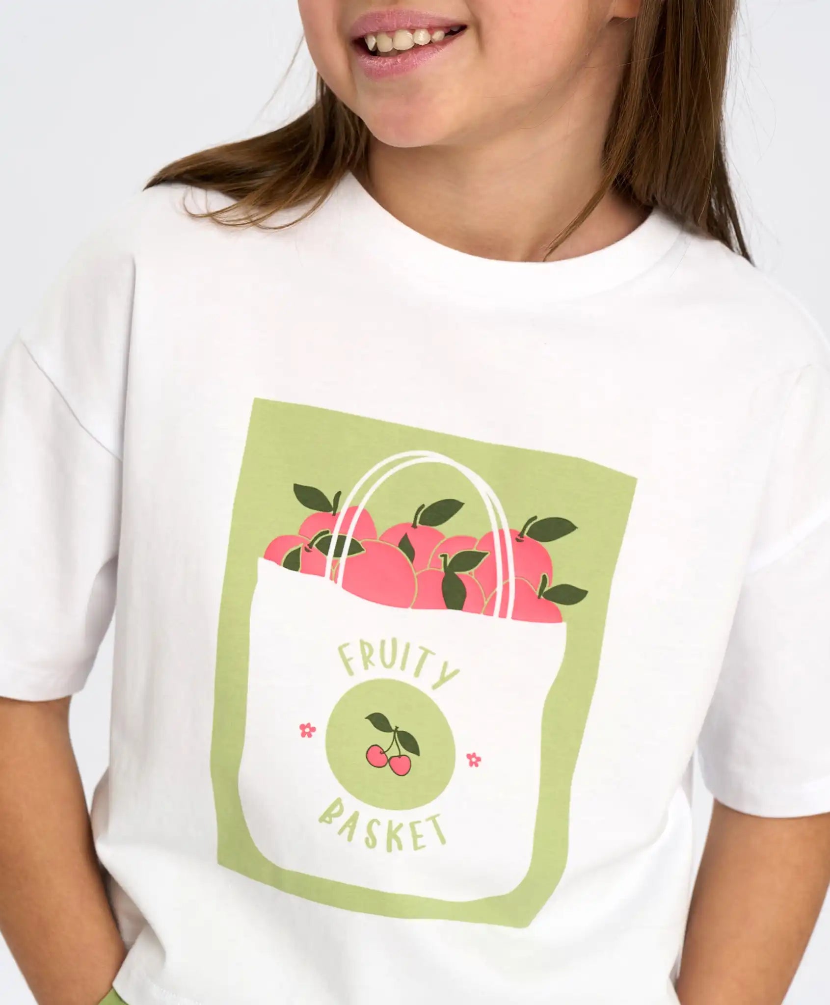 Tricoul cropped cu mânecă scurtă pentru fete este confecționat din material jersey mixt cu bază din bumbac, ceea ce îl face moale, respirabil și plăcut la purtare. Linia căzută a umerilor și croiala lejeră sunt ideale pentru fetele active. Tricoul scurt de vară are mâneci de lungime optimă – până la cot. Modelul se combină ușor și se integrează în garderoba casual, sportivă și de casă datorită culorii albe clasice. Designul este accentuat de imprimeul cu fructe, iar elementele din cauciuc adaugă un efect texturat.