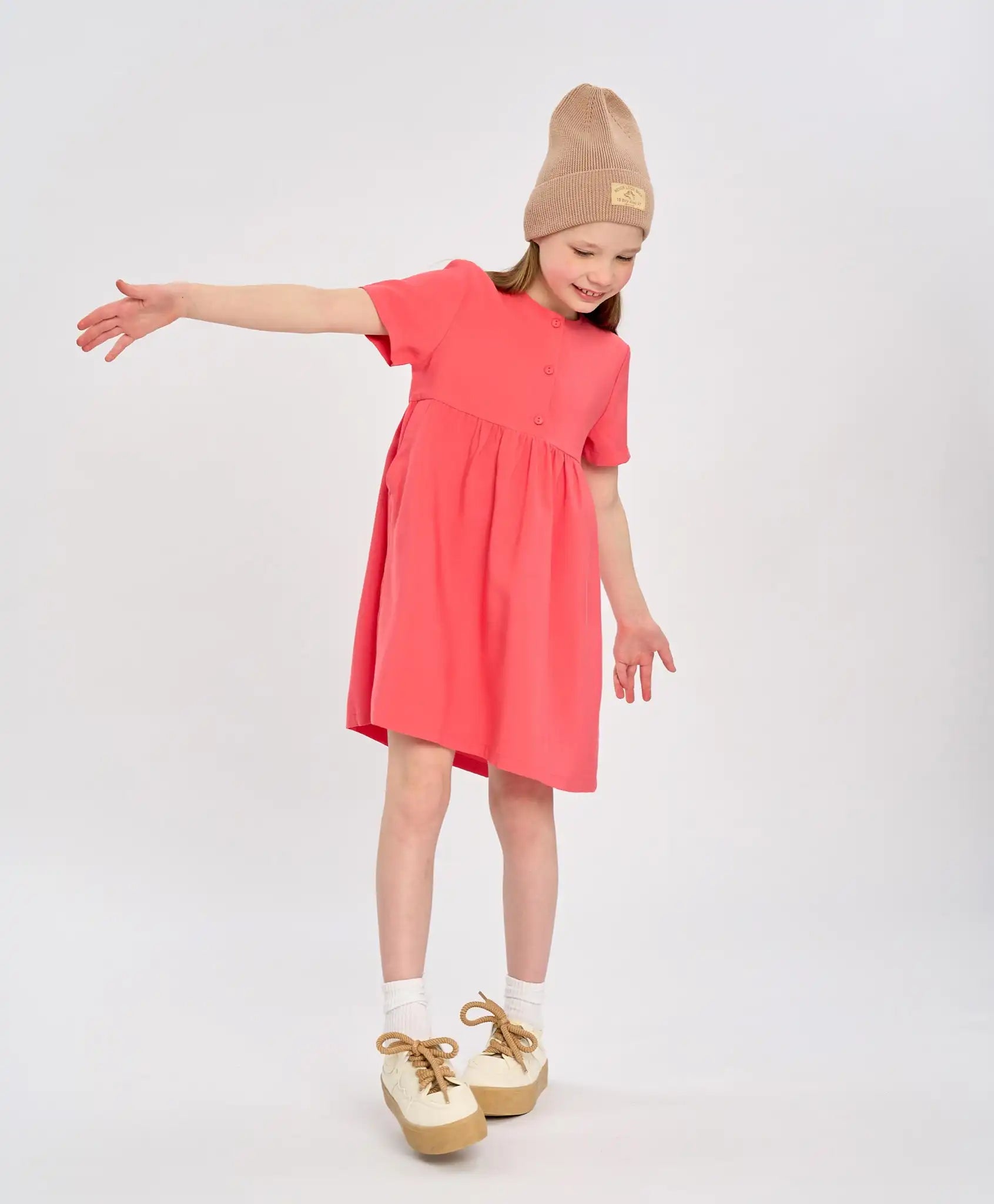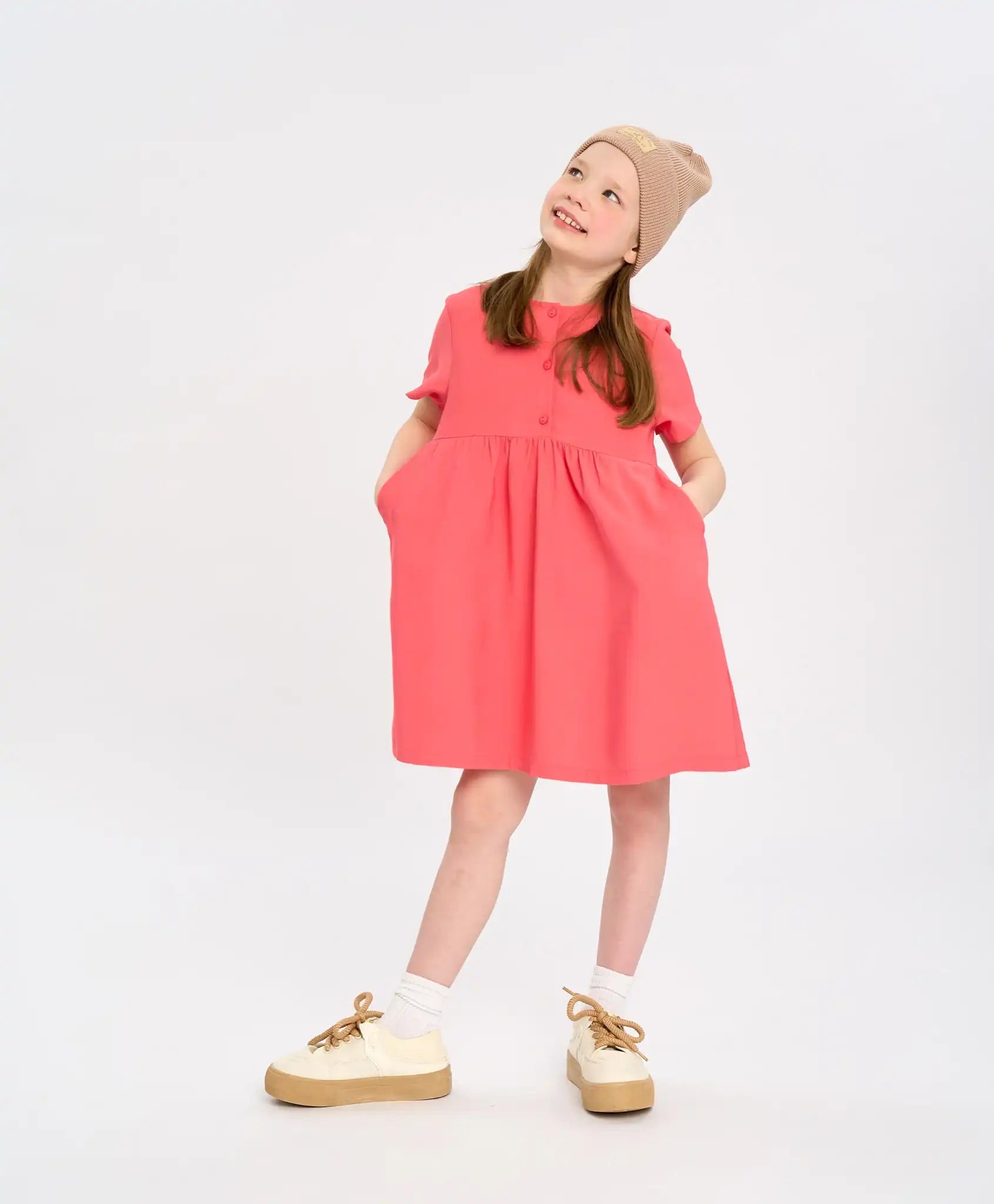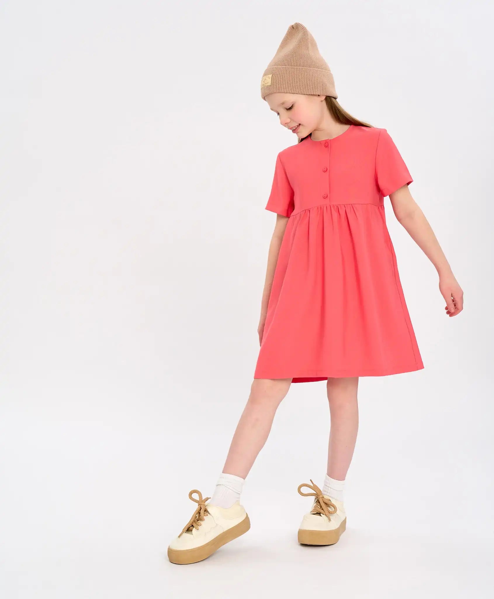 Rochia cu mânecă scurtă este confecționată din lyocell. Modelul este durabil, respirabil, neted și moale. Rochia de vară pentru fete are o croială în A și un decolteu rotund, ceea ce o face nu doar frumoasă, ci și confortabilă. Această rochie ușoară atrage atenția prin nuanța sa intensă de coral „calypso” și prin aspectul său monocrom versatil, fără detalii inutile. Pentru o îmbrăcare și dezbrăcare ușoară, dispune de trei nasturi în față și două buzunare.