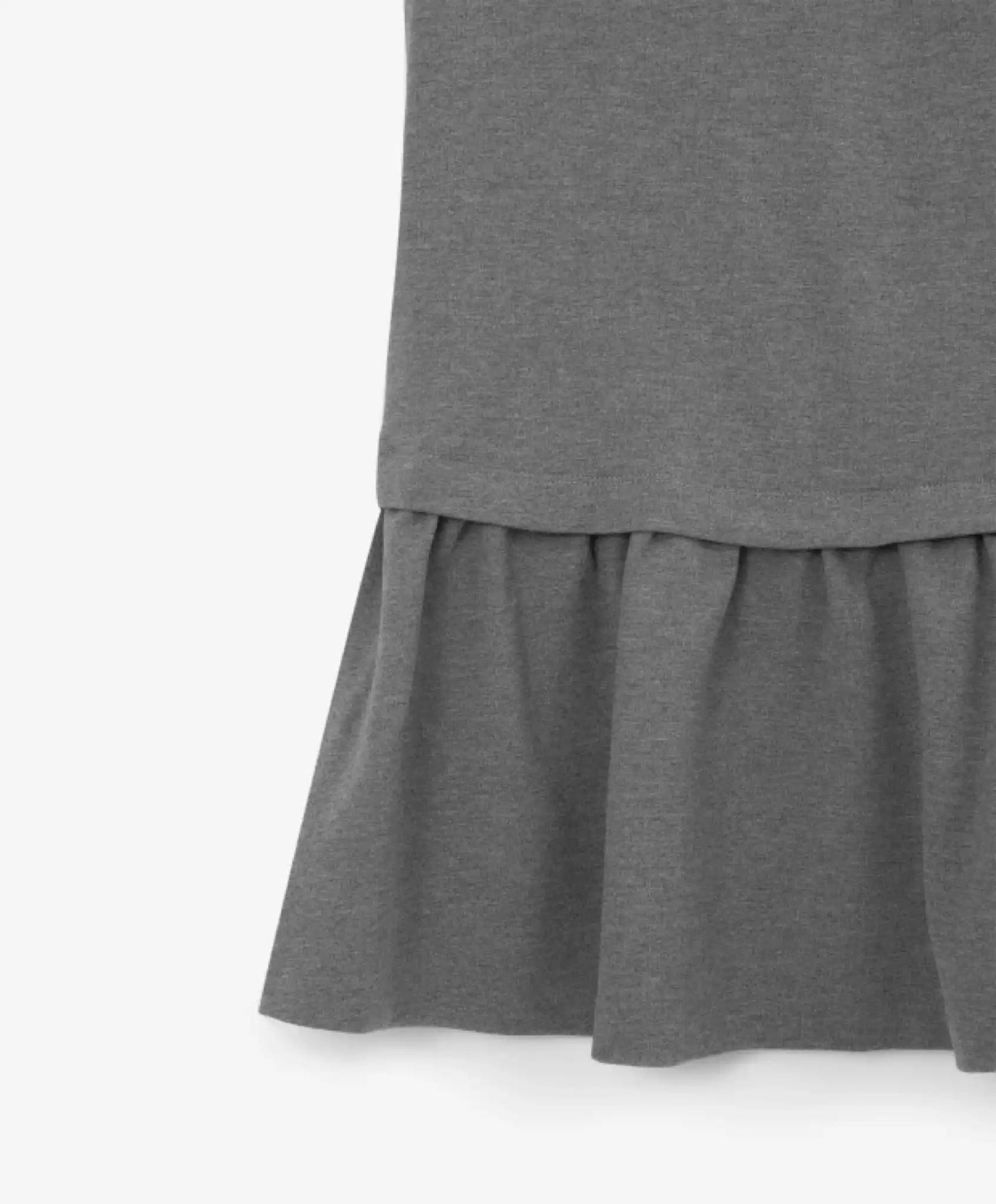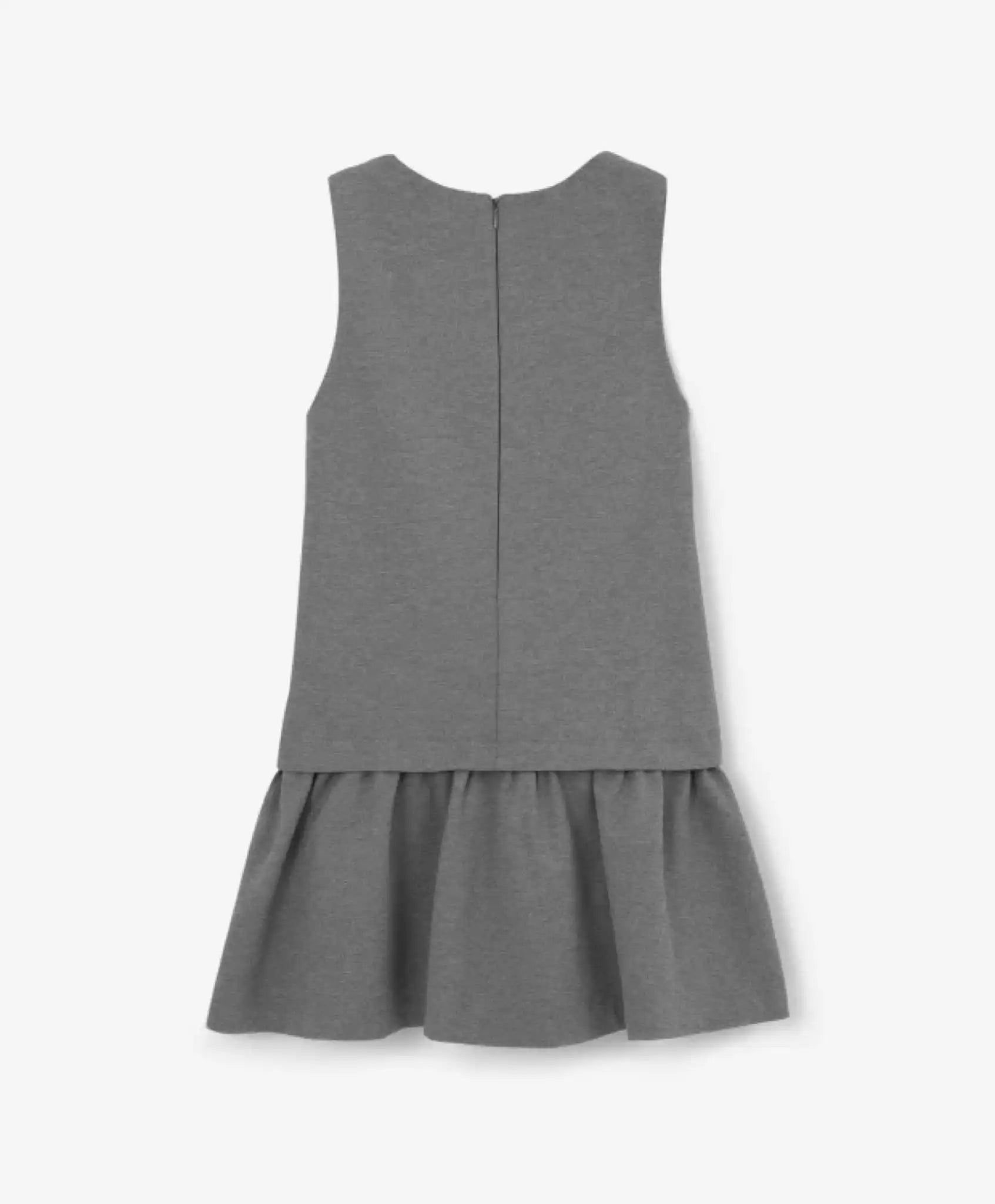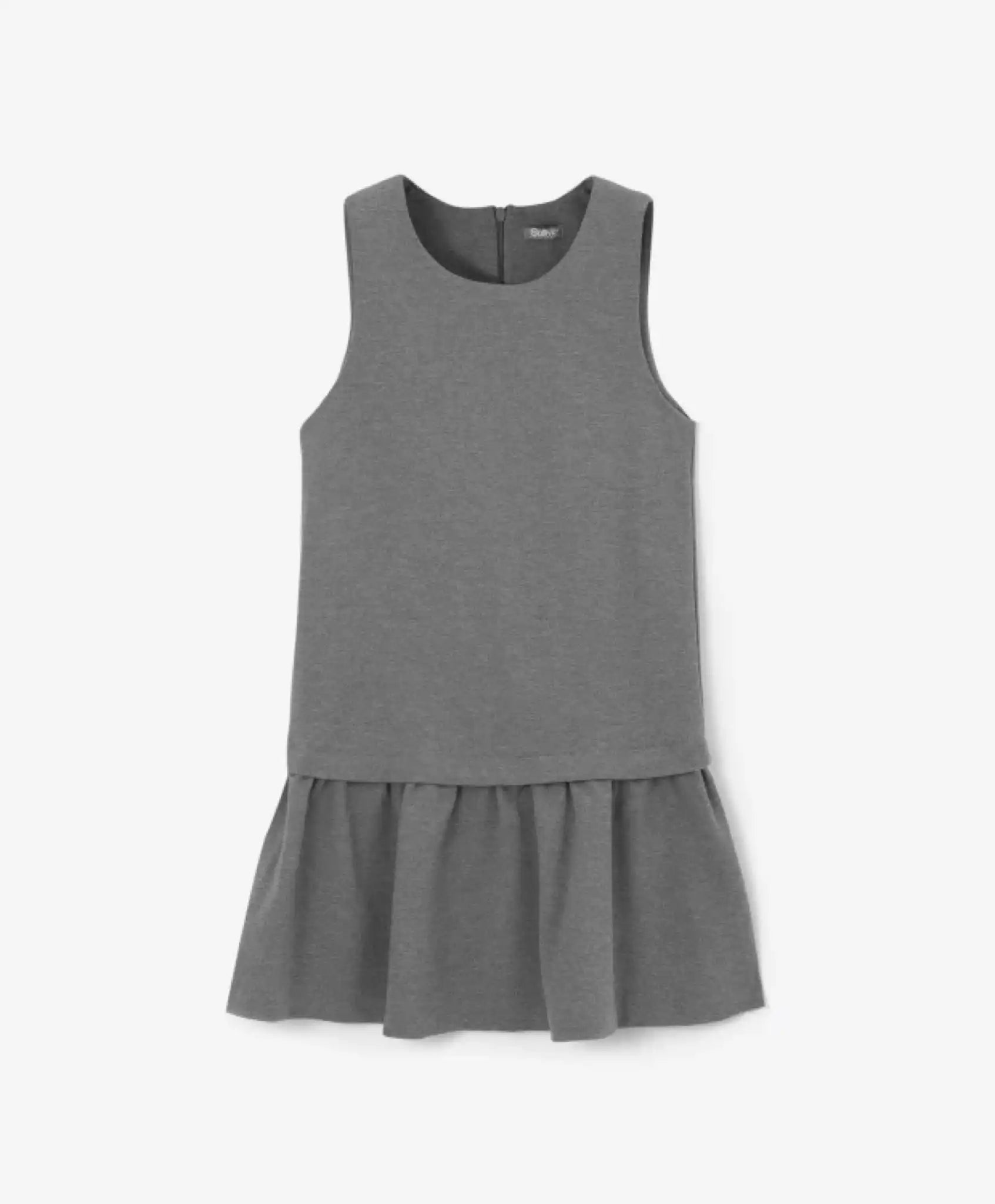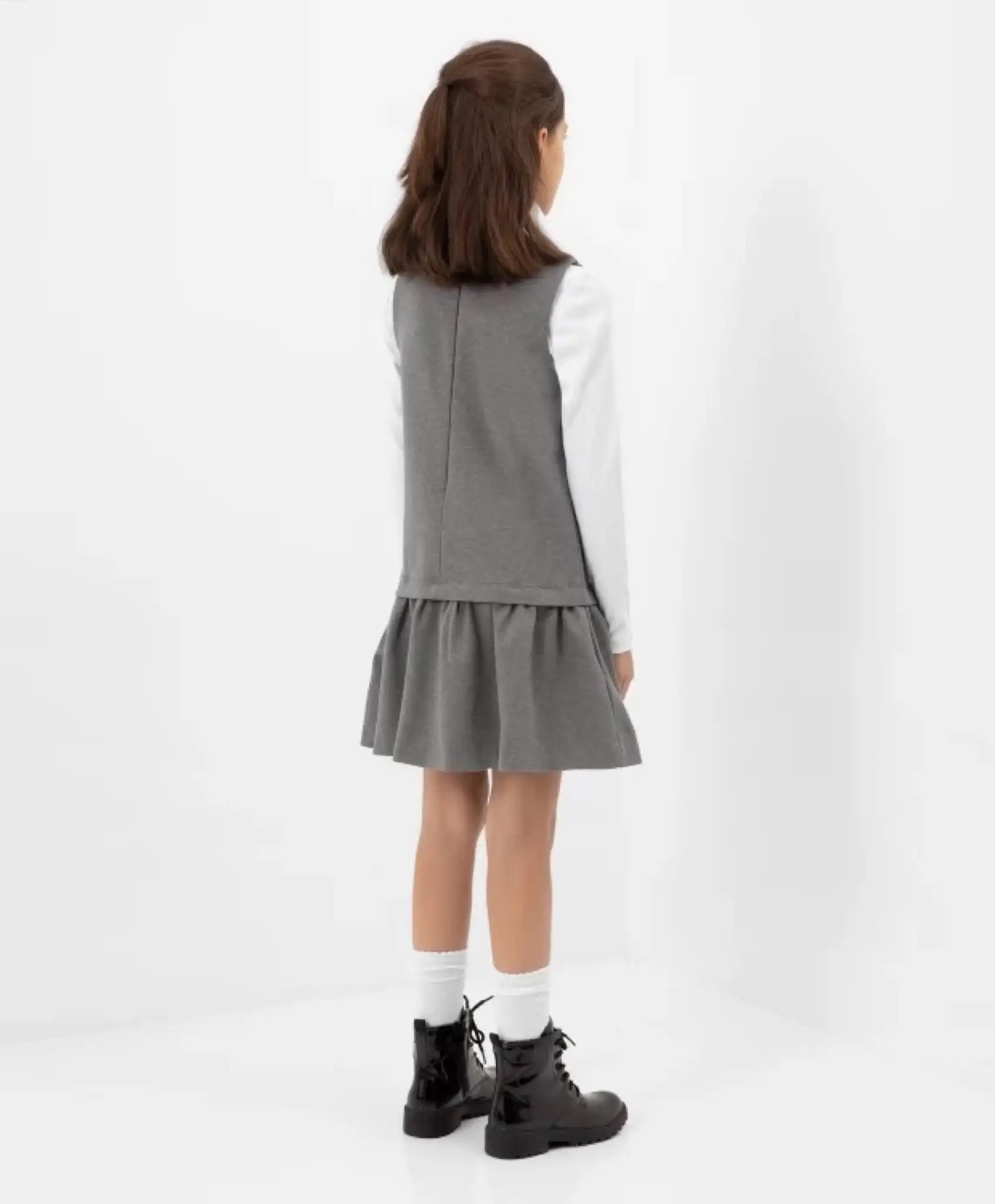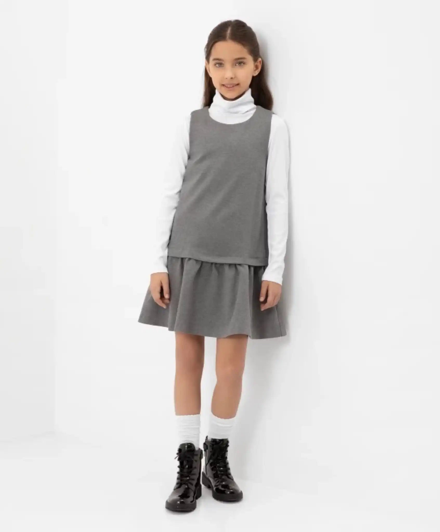 Sarafanul gri din tricot, cu siluetă trapezoidală și talie joasă, este o opțiune excelentă pentru viața de zi cu zi a unei eleve. Confecționat dintr-o țesătură moale și rezistentă, sarafanul este practic, ușor de purtat și întreținut. Elementul distinctiv al modelului este efectul de stratificare, obținut printr-un pliu mare cusut la îmbinarea părții superioare cu fusta. Designul sarafanului include un look delicat, completat de un decor metalic elegant.