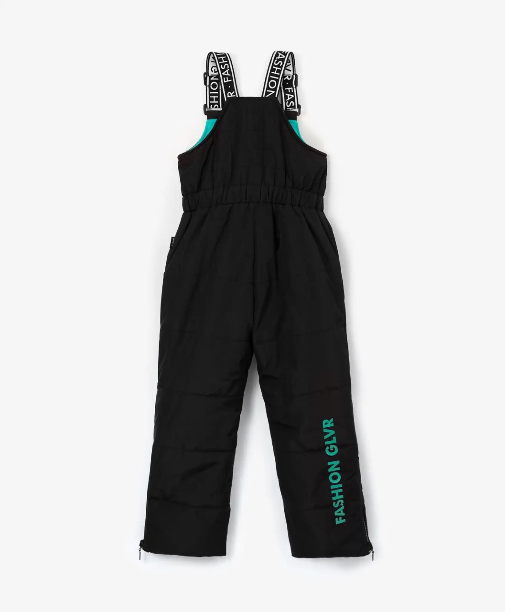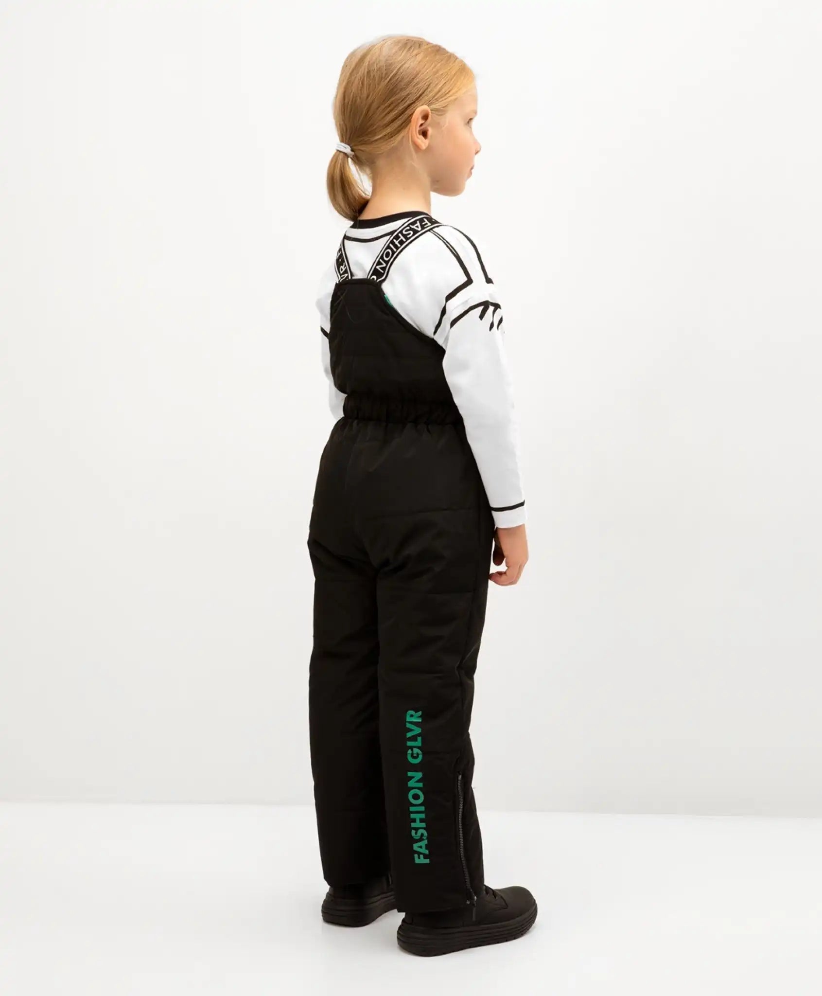Salopeta neagră parțială este realizată din material dens mat, rezistent la uzură. Designul atent conceput nu adaugă volum inutil, permițând libertate totală de mișcare. Fermoarele din partea inferioară a pantalonilor permit purtarea încălțămintei de diferite înălțimi și dimensiuni. Manșetele de protecție împiedică pătrunderea zăpezii. Bretelele elastice jacquard permit ajustarea perfectă a salopetei în funcție de înălțimea fetei. Modelul este decorat cu imprimeuri contrastante și un fermoar metalic personalizat.