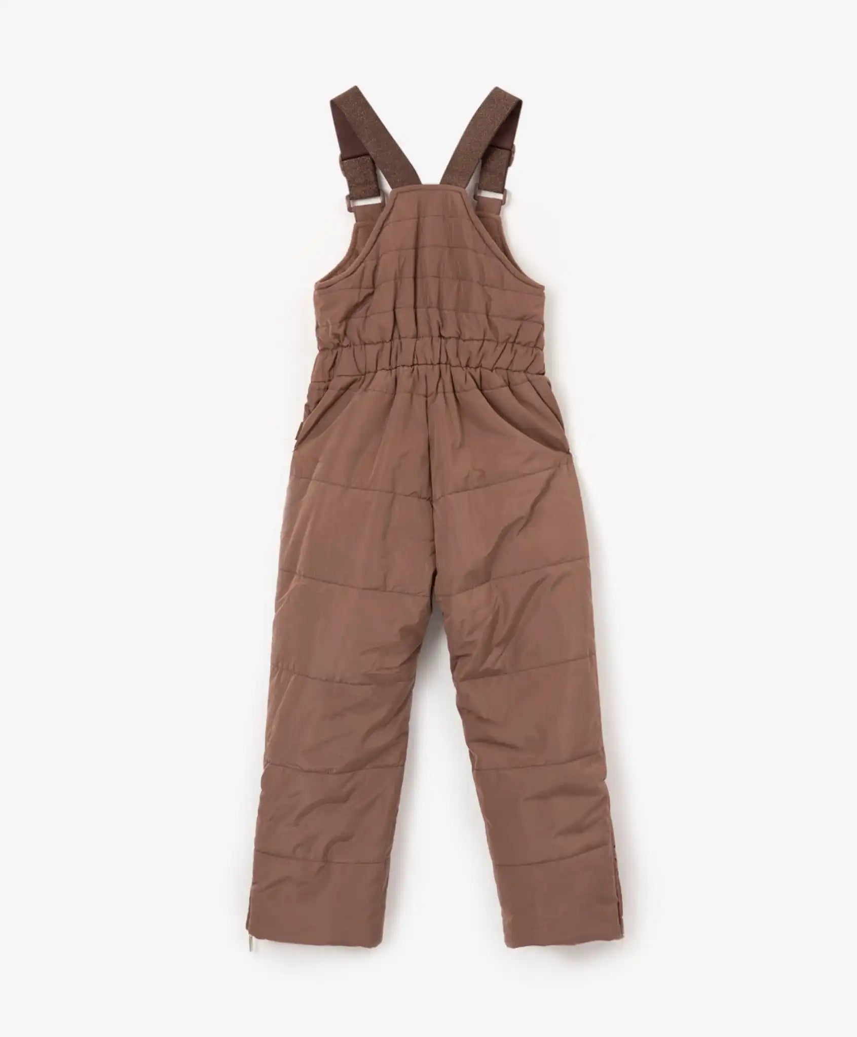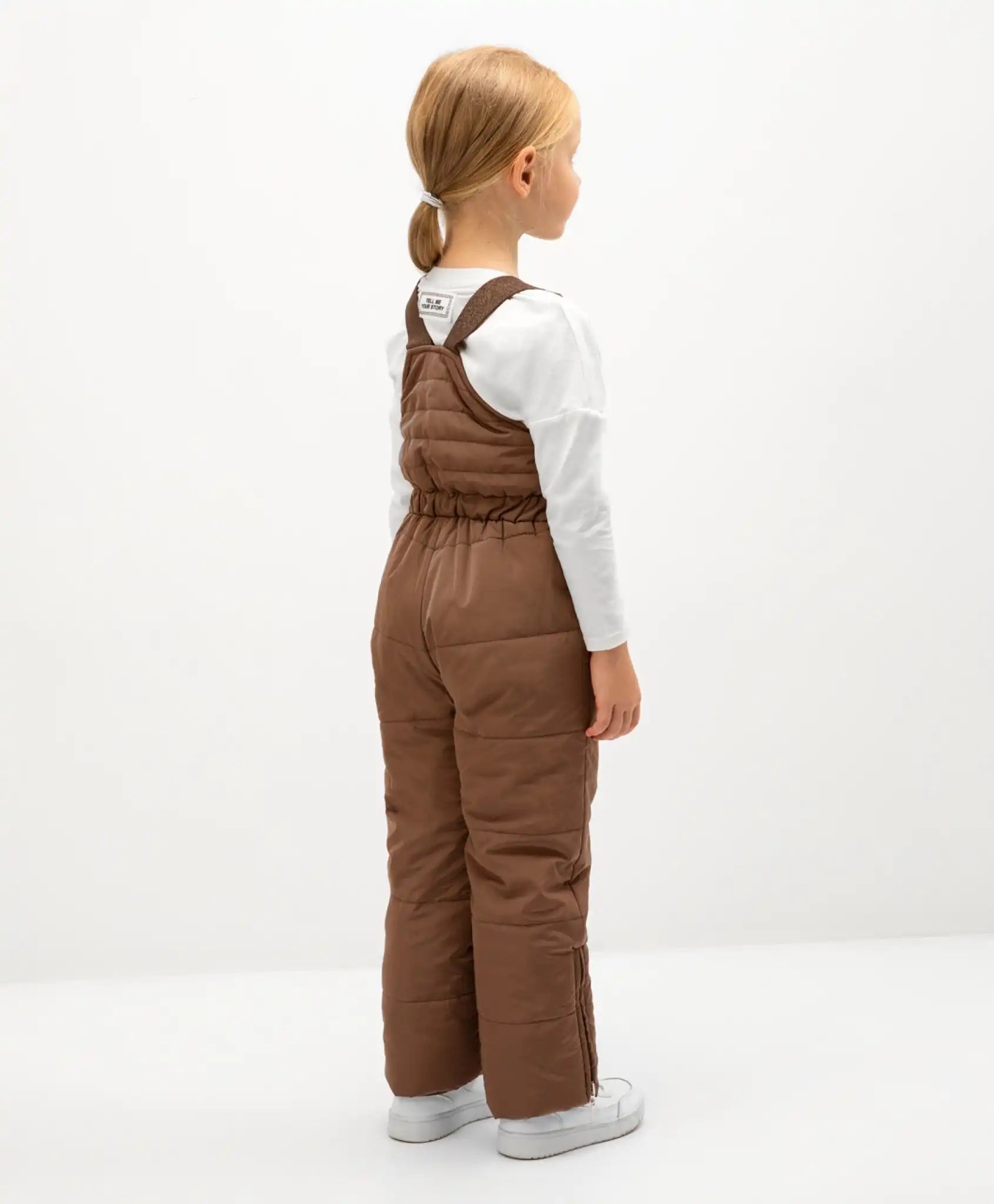 Salopetă izolată cu umplutură din poliester, confecționată din material impermeabil ecologic în nuanță "taupe". Croiala confortabilă nu adaugă volum inutil, oferind libertate maximă de mișcare. Bretelele reglabile, cu fir Lurex integrat într-o bandă tricotată elastică, contribuie la crearea unui look delicat și elegant. Fermoarele din partea inferioară a pantalonilor permit purtarea cu încălțăminte de diferite dimensiuni și înălțimi.